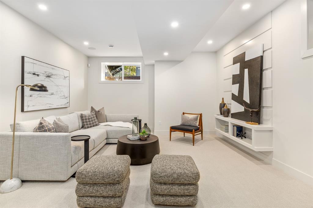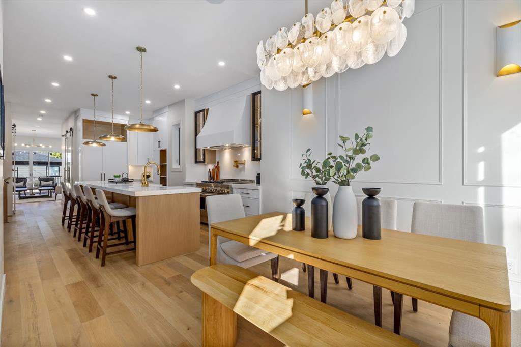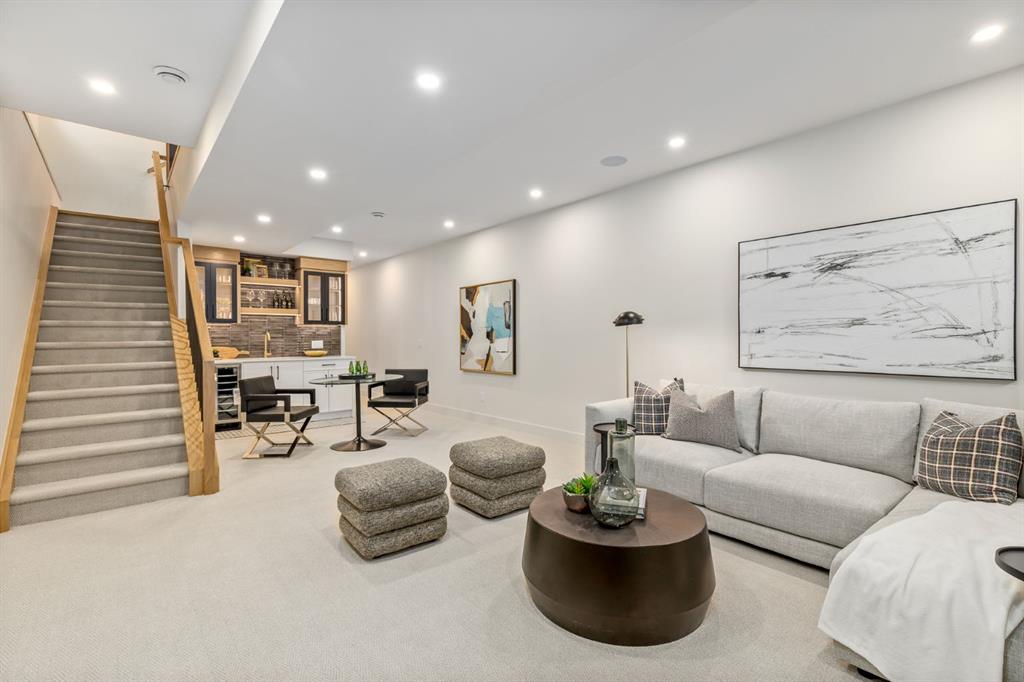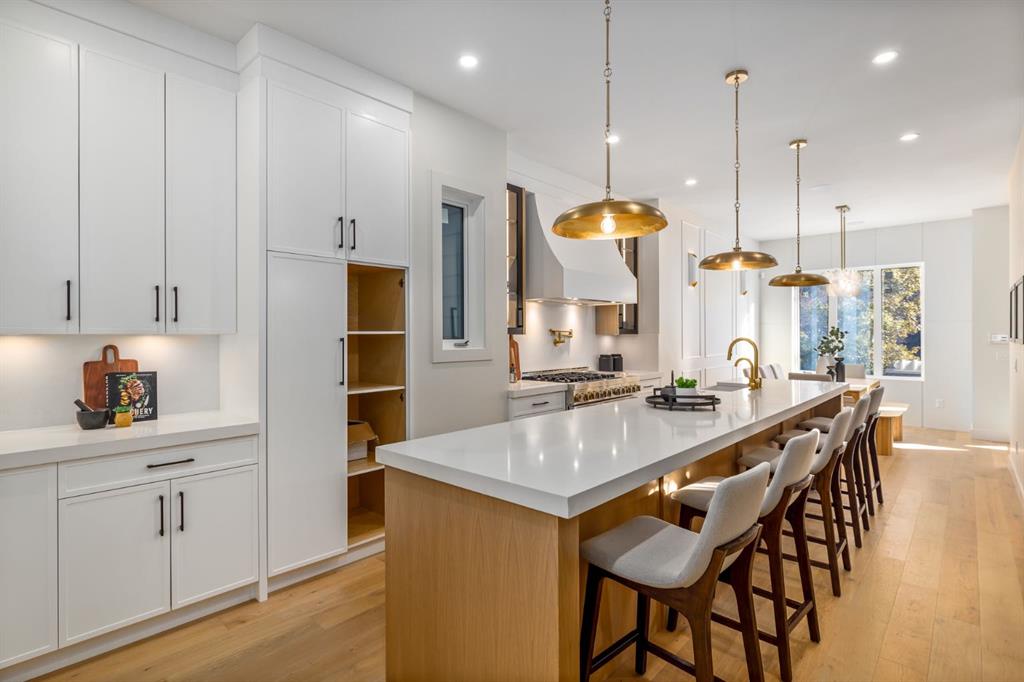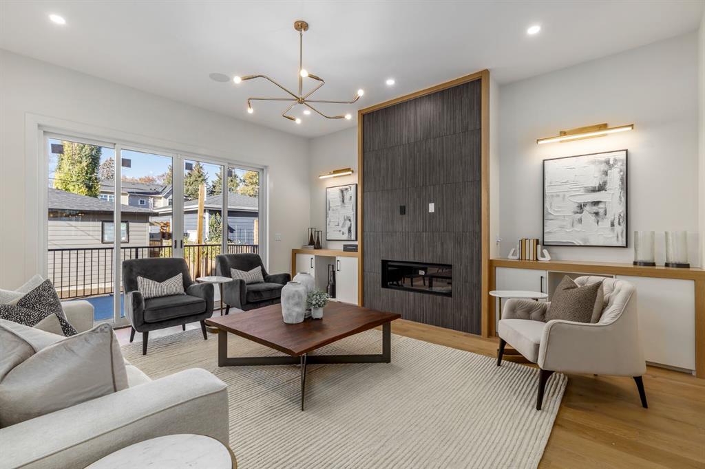 Experience elevated inner-city living with this impeccably designed, brand-new home nestled in one of Calgary’s most sought-after neighbourhoods: Hillhurst. Constructed by a trusted local builder known for craftsmanship, functionality, and aesthetic excellence, this 2-storey residence offers 2,224 SF above grade, with a fully developed basement, 4 bedrooms, and 4.5 bathrooms—a perfect blend of modern luxury and thoughtful detail. From the striking brick facade to the high-end engineered wide plank oak hardwood, every inch of this home exudes quality. The main floor welcomes you with a built-in entry feature and a front formal dining area, accented by elegant wall mouldings, white and gold sconces, and a designer chandelier. At the other end, an open-concept living room is a showstopper, featuring a large-format textured tile fireplace, custom built-ins with display lighting, and massive patio sliders leading to a west-facing, 135-ft deep backyard with a raised patio and gas line—ideal for indoor-outdoor entertaining. The chef’s kitchen is nothing short of stunning, complete with a 2.5" thick quartz island, panel-ready fridge/freezer with knurled handles, sleek quartz countertops, a gas range with pot filler, and backlit display cabinets framing the custom hood fan. You’ll also find a farmhouse sink, full slab backsplash, hidden coffee/appliance nook, built-in pantry, and a drawer-style microwave—each designed to inspire culinary creativity. Tucked behind a barn-style sliding door, the den offers a quiet workspace with a built-in desk, shelving, and bright window. The mudroom, also with a barn door, features tiled flooring, a built-in bench, and a large closet for seamless organization. Upstairs, each of the three spacious bedrooms come with walk-in closets and custom built-ins, along with private ensuites. The primary is sure to impress with vaulted ceilings, a LED-lit feature wall, statement gold light fixture, and a spa-inspired ensuite that boasts a steam shower, dual vanities, and a standalone soaker tub with dramatic black and white tile wall backdrop. A nearby laundry room offers convenience with a sink, folding station, shelving, and tile backsplash. The fully finished, carpeted basement, with 9-ft ceilings, is roughed in for in-floor heating and designed for comfort and versatility—featuring a spacious rec area, a TV wall with built-in components, a wet bar with lit display shelves and tile flooring, a full bath, and a large fourth bedroom with built-ins including a desk. An efficient mechanical room completes the lower level, with additional upgrades including solid core doors and built-in speakers throughout the entire home. Perfectly situated just steps from shops along 14 St NW and walking distance to Kensington Village, Calgary’s extensive river pathways, and the Downtown Core—this is urban luxury at its finest. Act now and make this exceptional Hillhurst property your forever home.