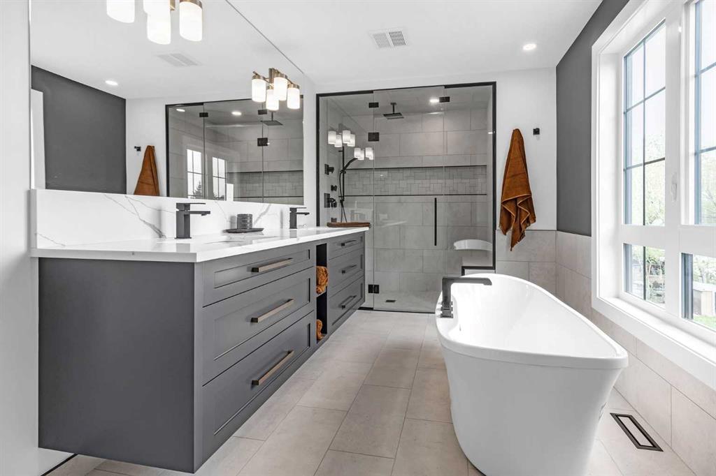 INSTANT EQUITY OF OVER 300K PLUS QUICK POSSESSION HOME !!! A CUSTOM DESIGNED LAKE FRONT MARVEL by SuiGeneris Homes! COMPLETELY RENOVATED DOWN TO THE STUDS WITH ALL NEW ELECTRICAL WIRING, PLUMBING, WINDOWS, SIDING, HUGE MAIN FLOOR DECK,MASTER SUITE PRIVATE LAKE FRONT DECK, Epoxy finish on garage floor. Oversized 2 car garage with epoxy floors, NEW FLOORING, NEW GARAGE DOOR, NEW HVAC, ALL NEW ROOFING, WINDOWS, DOORS, SPRAY FOAM INSULATION THROUGHOUT THE HOUSE AND MORE! COMPLETED WITH A NEW FLOOR PLAN AND ADDITION TO THE HOUSE. Sitting on a HUGE LOT THAT IS RIGHT ON THE LAKE with over 4,200 sq ft of living space. This well planned floor plan offers 5 Beds, 1 flex area, 5.5 baths & an attached OVERSIZED 2 car Garage. 3 ENSUITE BEDROOMS!!! ONLY 10 MINUTES TO/FROM CALGARY. The professionally designed interior is an elegant balance of light tan hardwood floors with white and grey walls and black finishing. The combination of Large windows and Vaulted ceilings in the living areas and bedrooms give lots of natural light to the living areas. In addition to the lake views, enjoy the views of the golf course from 2 bedrooms and a loft on the upper floor. Other features include Paved, drive through driveway, rich combination of Smooth Acrylic Stucco, stone & batten boards on exterior, Custom Cold Air Return Grills, Built in custom closet systems, ship lap feature walls, 2 fire places on main floor and one in master bedroom, Roughed-in Smart monitoring systems, Hardwood Flush Mount Vents in hardwood areas, open riser stairs, 5” Engineered Hard Wood on main floor, LVP basement floors and mudroom, premium carpet, Custom Shower Base with tile to ceilings in all showers, Premium Delta Plumbing package, 36” lower cabinets. All vanities have upgraded drawer style fronts, 8” Stone back splash, High efficiency Tankless Water Heater, Roughed-in Garburator, roughed-in Central Vacuum, High Efficiency Furnace & Smart Thermostat, BBQ Gas line and roughed in garage heater. The kitchen features include a deluxe Kitchen Aid appliance package with waterline to the fridge. Offering Quick and easy access to highway 16, Downtown Calgary, lots of shopping at the nearby East Hills Mall, restaurants, nearby schools and other conveniences. Drive through drive way with fully completed landscaping. MOVE IN READY HOME. READY FOR QUICK POSSESSION
