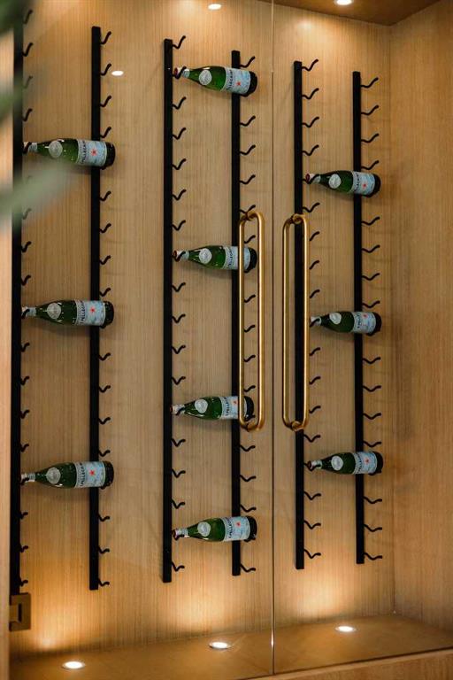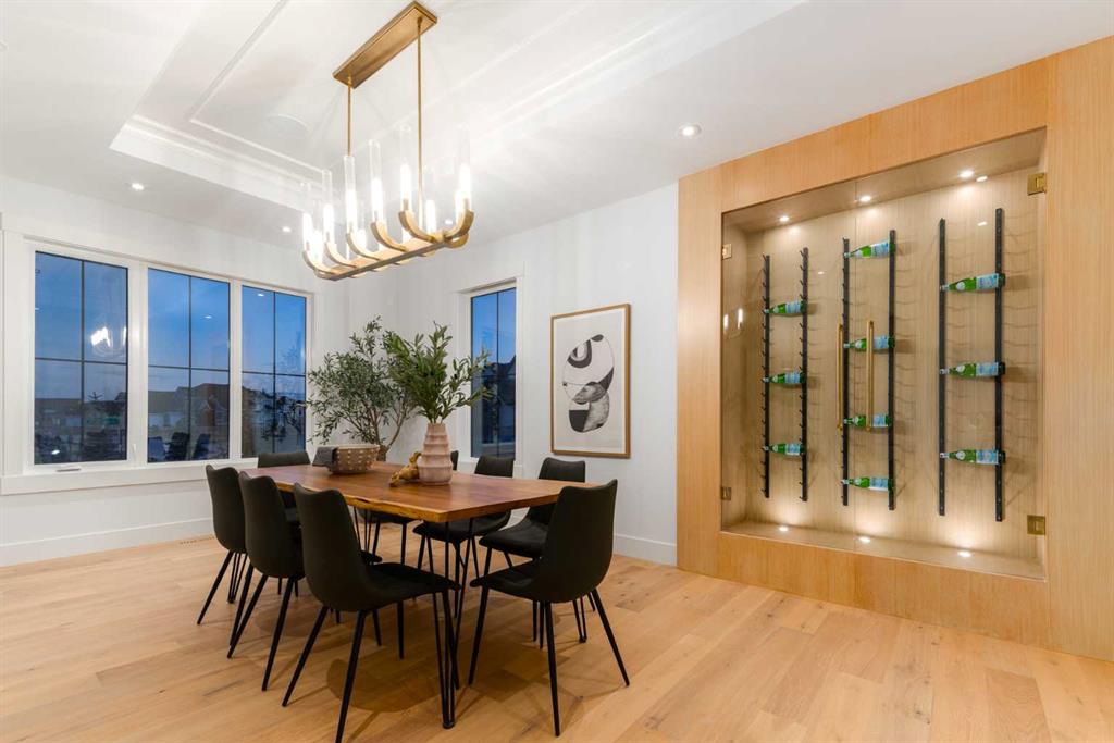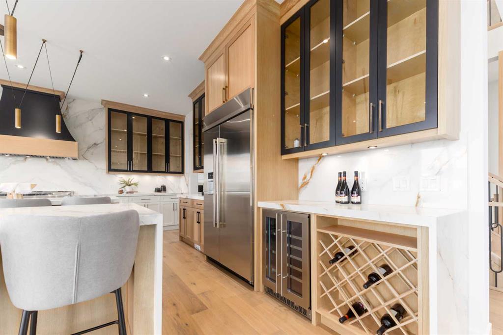 The gourmet chef’s kitchen is a true showpiece, featuring dual waterfall quartz islands, professional-grade Jenn-Air appliances, integrated wine storage, and a fully equipped spice/prep kitchen. The adjoining great room showcases a soaring fireplace wall and custom built-ins, perfect for both family gatherings and elegant entertaining. Formal dining is elevated with a glass-encased wine display and coffered ceiling, while a private main-floor office, guest suite, and stylish powder room add everyday convenience.