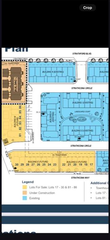 Fully Serviced, 20 Townhouse lots in the middle of already developed residental neighborhood ( yellow shade in the picture),Seller will provide all the floor palns/drawings and permits. Building E (8 Units) Each unit is 1769 Sq. feet,Garage 250 Sq. feet,Total building 14,152 Sq. feet, Lot 115-101 Strathcona Circle, Building D (6 units) 127-117 Strathcona Circle,Each unit is 1769 Sq. feet,Garage 250 Sq. feet,Total building area is 10,776 Sq. feet, Building M (6 Units) 102-413 Strathcona Circle, each unit is 1670 Sq. feet ,Double garage area 432 Sq. feet,413-421 Strathcona Circle,each unit is 1272 Sq. feet ,garage area 273 Sq.feet and Total building area is 8,035 Sq. feet.