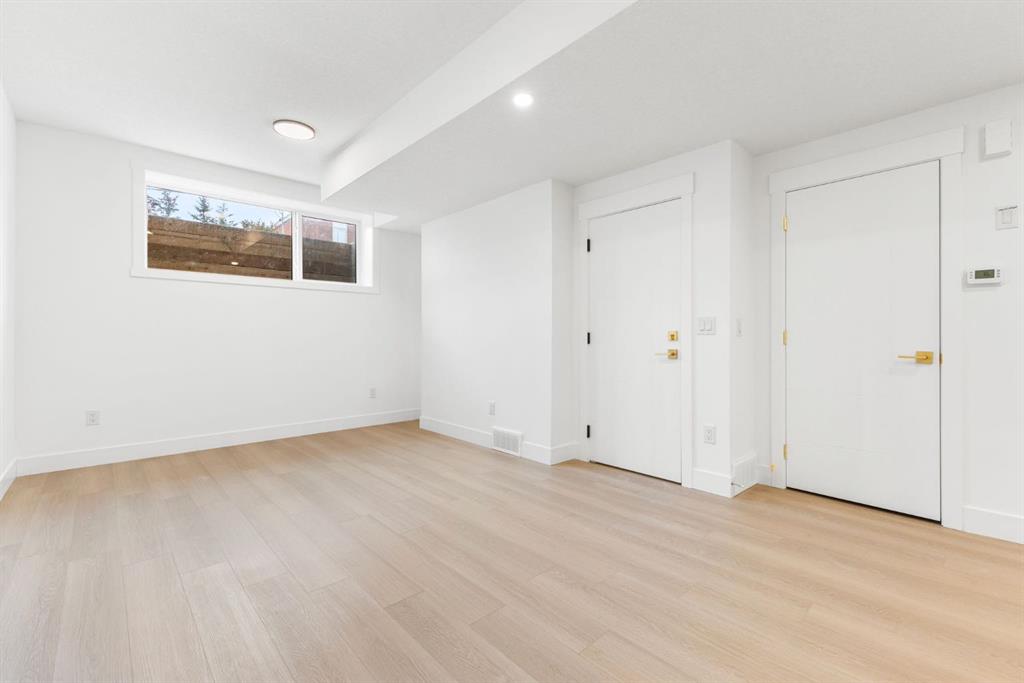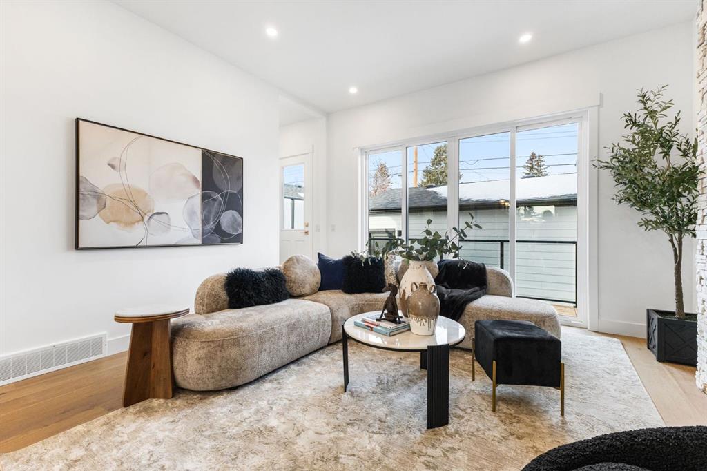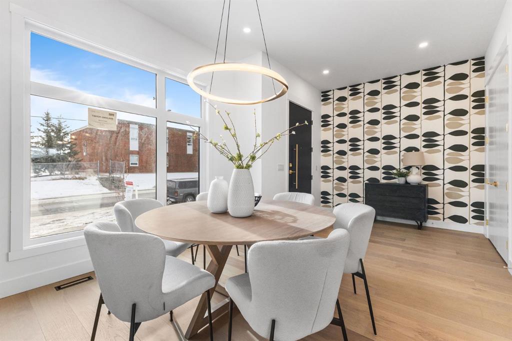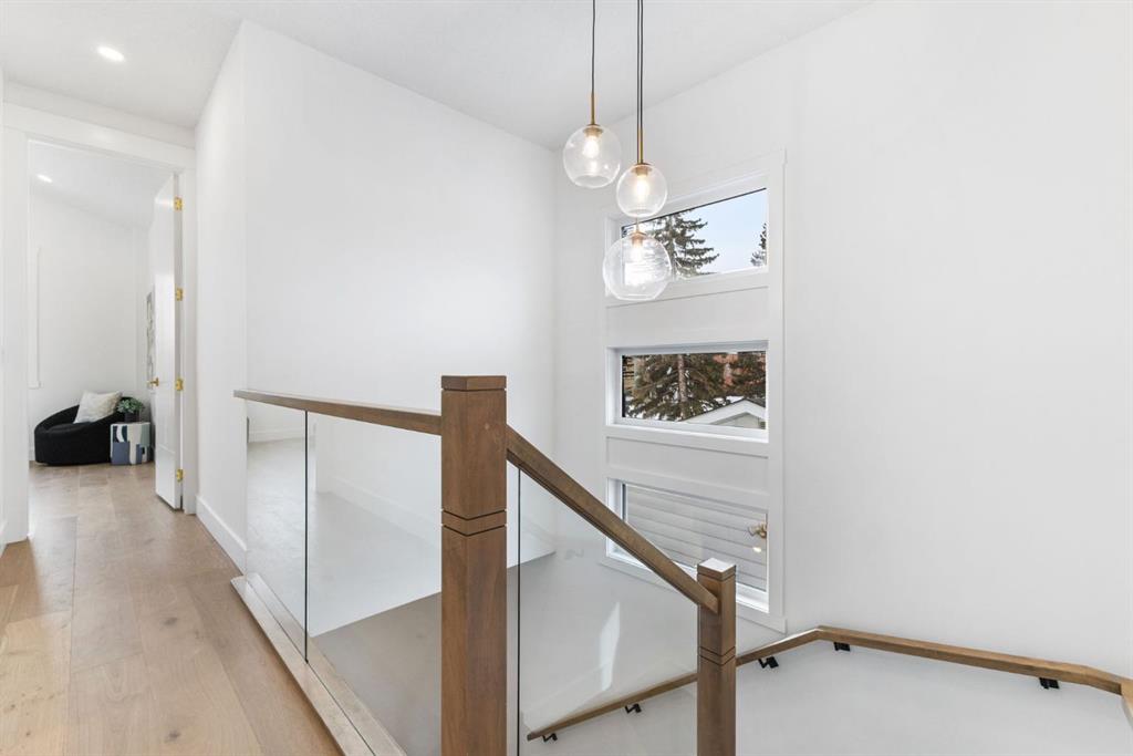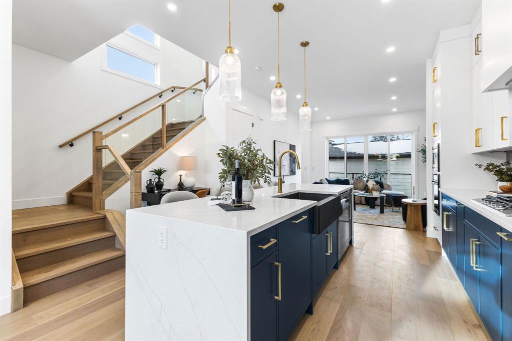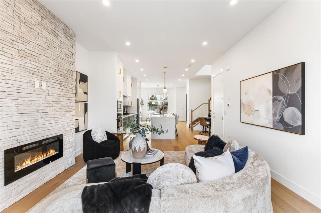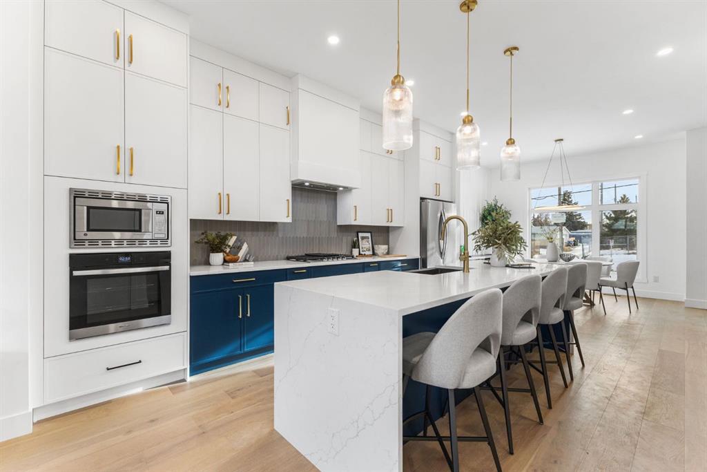 Welcome to this brand-new, 3 bedroom residence perfectly situated in the mature community of Rosscarrock. Designed for modern living and crafted with exceptional attention to detail, this contemporary two-storey home offers over 1900 sq ft of beautifully developed space, plus a self-contained legal one-bedroom basement suite—ideal for guests, or as a potential mortgage helper. The main level showcases an open-concept design enhanced by wide-plank hardwood floors, high ceilings, and expansive windows that flood the space with natural light. The inviting living room features a striking floor to ceiling fireplace and built-in shelving, creating a warm focal point for gatherings. The adjacent dining area easily accommodates family meals or formal entertaining. At the heart of the home, the chef-inspired kitchen impresses with full-height cabinetry, quartz countertops, an oversized island with breakfast bar and excellent appliance package. Thoughtful details such as recessed lighting, designer chandelier, a functional mudroom with custom built-ins and 2 piece powder room elevate the space. Upstairs, the vaulted-ceiling primary suite is a private retreat, complete with a spacious walk-in closet fitted with custom organizers and a luxurious 5-piece ensuite featuring double sinks, a quartz-topped vanity, freestanding soaking tub, and separate glass shower. Two additional bedrooms, a 4-piece bath, and a convenient laundry room with sink complete this level. The fully developed lower level has been designed as a private, self-contained legal one-bedroom suite, complete with its own kitchen, living area, full bathroom, and laundry facilities. Large windows, recessed lighting, and quality finishes ensure the suite feels bright and inviting—ideal for extended family, guests, or rental use. Outside, enjoy a private, landscaped yard with a rear deck, fencing, and a double detached garage. The home’s exterior blends timeless brick and composite siding with modern lines and a welcoming south-facing front exposure. Situated on a quiet street within walking distance to parks, playgrounds & schools and close to Shaganappi Point Golf Course, shopping, scenic Edworthy Park and public transit, this property offers the perfect balance of style, flexibility, and convenience. Newly built in 2025, this outstanding Rosscarrock residence delivers premium craftsmanship, functional design, and exceptional versatility—ideal for today’s discerning buyer seeking luxury living with the added benefit of a legal self-contained suite.