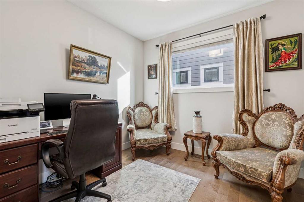 The open-concept main floor features hardwood flooring, a kitchen with full-height cabinetry, quartz countertops, gas cooktop, walk-in pantry, large island with wine fridge, and a dedicated main-floor office with sliding barn door.