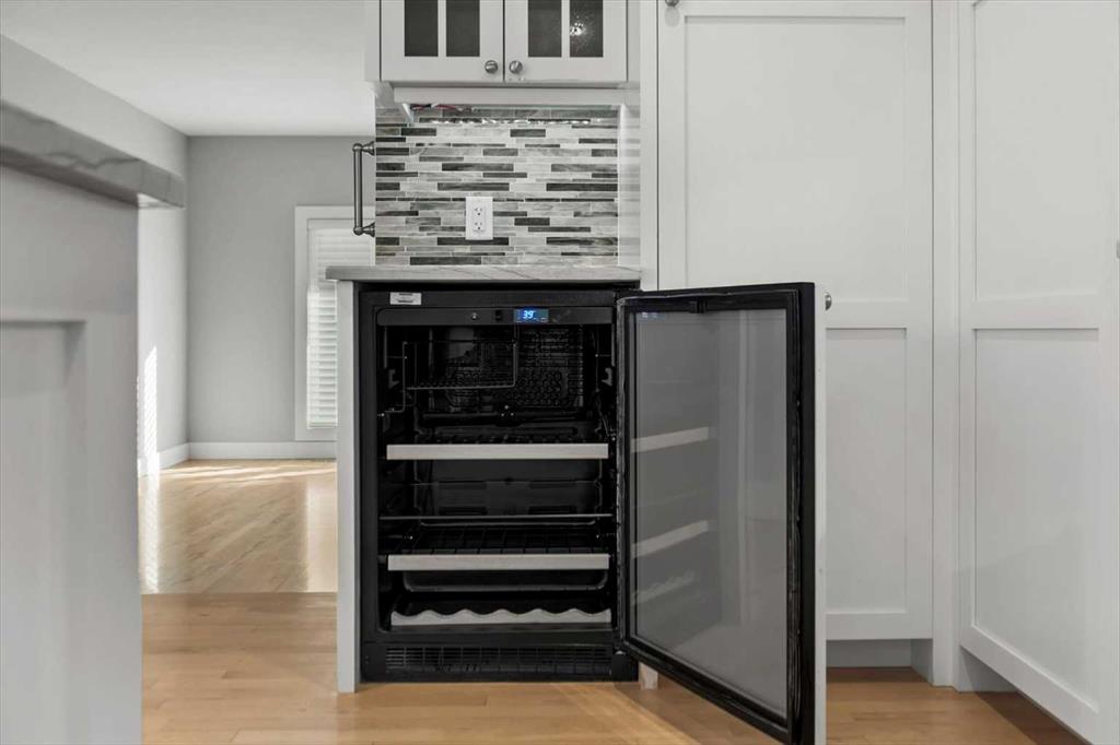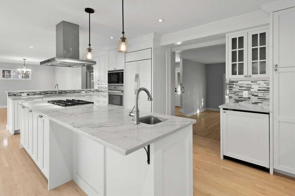 The luxurious renovated kitchen (2015) features a large island with quartz countertops, breakfast bar, and exceptional storage including soft-close drawers (approx. 20), corner organizer, and pullout pantry. Stainless steel appliances (2015) include an integrated-front refrigerator, dishwasher, and bar fridge, plus a gas cooktop with chimney-style hood fan, built-in wall oven and microwave. The kitchen overlooks the warm family room with a brick-faced wood-burning fireplace and views of the fully fenced backyard.