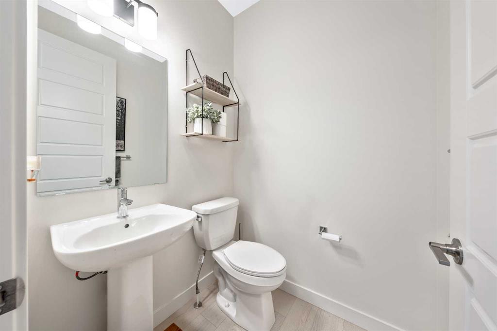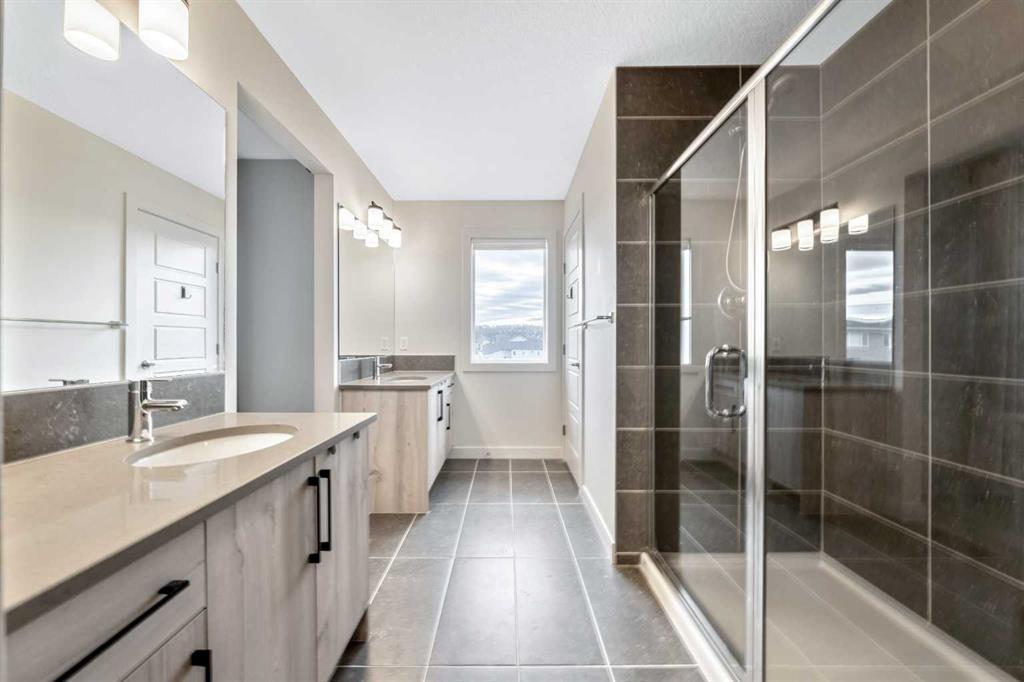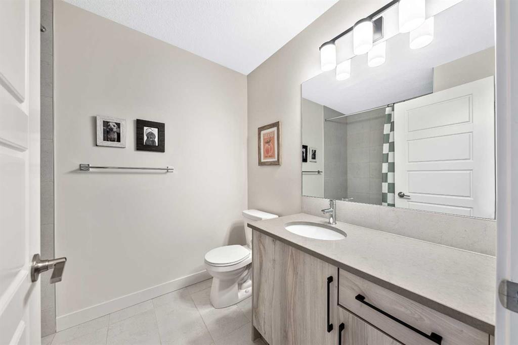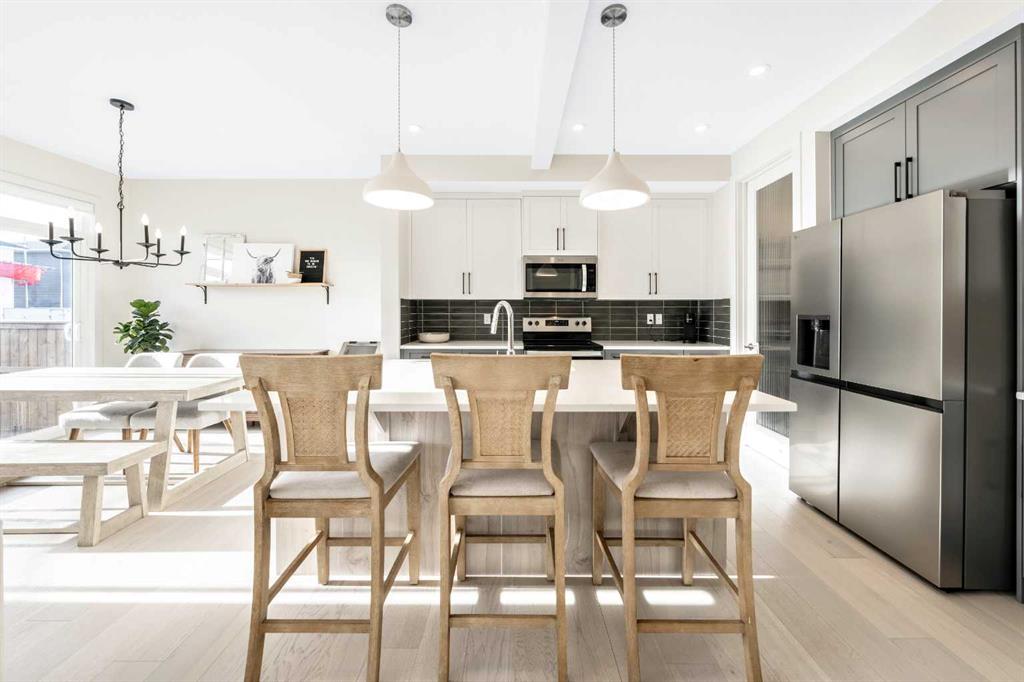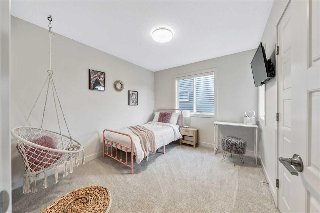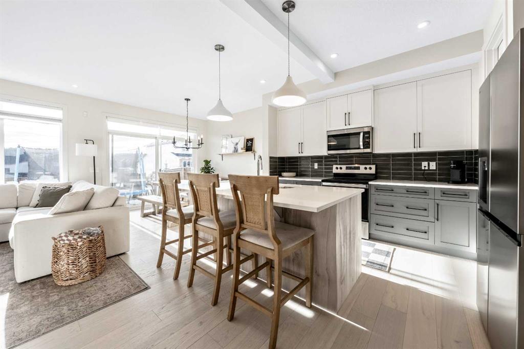 Situated on a quiet street in the centrally located community of Greystone—just steps away from a park and playground—this beautifully upgraded home has show-stopper curb appeal, features a sun-filled, fully fenced south-facing backyard, ideal for both entertaining and everyday living. Thoughtfully designed with an open, modern layout, this 3-bedroom, 2.5-bath home offers over 1,762 sq. ft. of stylish living space and showcases numerous premium upgrades throughout. The main floor makes an immediate impression with an elegant 8’ glazed front door, 9’ ceilings, oversized windows, and refined 8’ interior doors. Engineered hardwood flooring flows seamlessly through the foyer, hallway, great room, kitchen, and dining nook, creating a warm and cohesive atmosphere. The kitchen is a true showpiece, featuring a large single-level 7’ entertainment island with breakfast bar, quartz countertops, and a spacious walk-in pantry with 8’ French doors. Additional highlights include 42” upper cabinetry with dropped bulkhead, soft-close doors and drawers, dedicated pots-and-pans storage, and a full stainless steel appliance package, including a refrigerator, smooth-top electric range, microwave/hood fan, and built-in dishwasher. The bright and inviting great room and dining area are flooded with natural light from oversized windows and an 8’ wide sliding patio door, while the striking Napoleon Entice fireplace adds both style and warmth—perfect for relaxing evenings or hosting guests. Upstairs, the primary suite offers a private retreat complete with a well-appointed 4-piece ensuite featuring dual quartz vanities with undermount sinks, an oversized 5’ x 3’ shower, ceramic tile flooring, and a private water closet with a window. A generous walk-in closet is conveniently accessed through the ensuite. The upper level is completed by a spacious front bonus room, two additional well-sized bedrooms with ample closet space, a full main bathroom with quartz countertops and tile flooring, and a convenient second-floor laundry room finished with tile. The unfinished basement features 9’ ceilings, providing an excellent opportunity for future development and allowing the new owners to create a space perfectly tailored to their needs—a true blank canvas. Bright, modern, and ideally located in a family-friendly community, this home offers exceptional value and versatility and truly checks all the boxes.