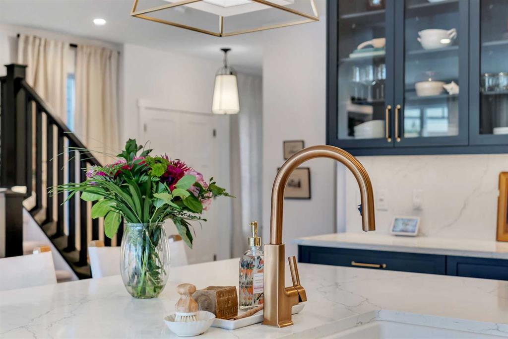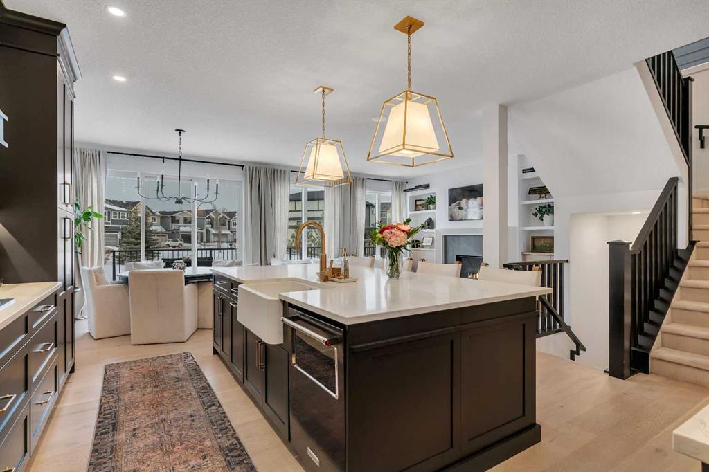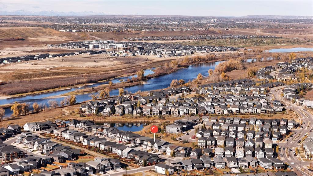Welcome to this stunning, fully upgraded 4 bedroom, 3.5 bath home in the highly sought after community of Cranston’s Riverstone. Perfectly positioned backing onto green space and just steps from the river, walking paths and the pond, this 2,402 sq.ft home blends luxury finishes with thoughtful design. The main floor offers an elongated entryway leading to an open concept living area flooded with natural light, a beautiful gas fireplace surrounded by custom built ins, a gourmet kitchen with quartz counters and backsplash, upgraded KitchenAid black stainless steel appliances, gas range with pot filler, custom hood fan, farmhouse sink, dining room, large walk in pantry and designer lighting. A custom mudroom with built in lockers adds everyday convenience. Upstairs features three bedrooms and two full baths, including a secondary bath with double vanities - perfect for sharing. The primary bedroom impresses with vaulted ceilings, a spa like ensuite, complete with a freestanding tub, rain shower with marble and zellige style tile, separate vanities and a large walk in closet connected to a convenient laundry room. A spacious vaulted bonus room completes the upper level. Downstairs, the fully finished basement includes a fourth bedroom, office space, full bath, wet bar with quartz counters/sconces and a cozy living area with an electric fireplace - ideal for entertaining. With over 100k in premium upgrades, including heated floors, custom cabinetry, built in speakers, smart lighting and rough ins for A/C and central vac, this home offers modern comfort and timeless style in a beautiful natural setting.