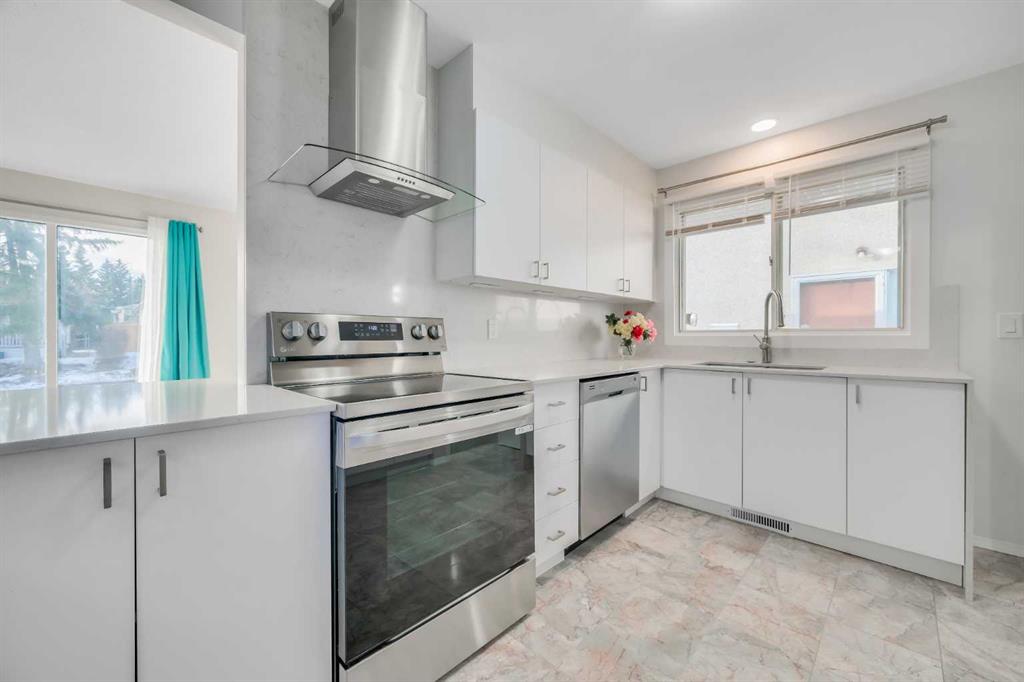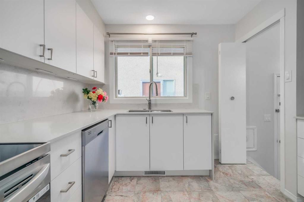 The tastefully renovated kitchen (2024) includes a functional window, trendy white cabinetry, quartz countertops with breakfast bar, stainless steel appliances, granite tile flooring (2011), and practical open shelving. A convenient pantry and cleaning closet are just steps away.