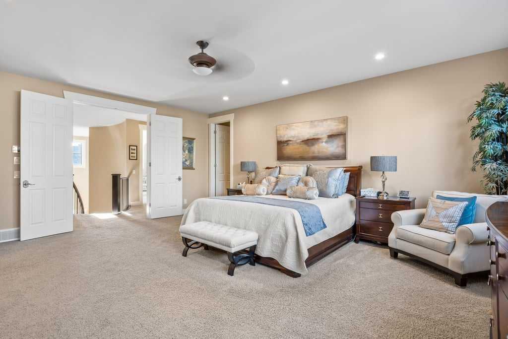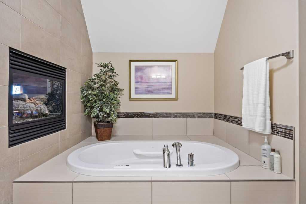 The primary suite is a true retreat, featuring a double-sided fireplace, expansive walk-in closet, and a spa-inspired ensuite with upgraded Grohe, Toto, and Kohler fixtures. Enjoy a two-person Bain Ultra thermomasseur tub with heated backs, and a luxurious shower with oversized rain head and handheld fixture.