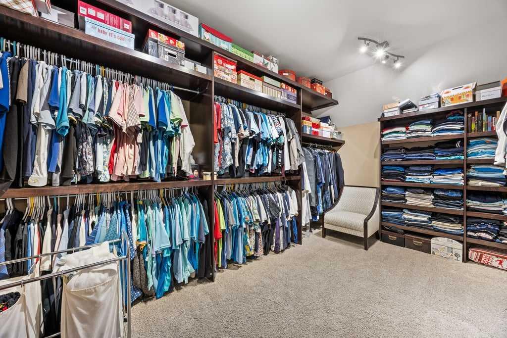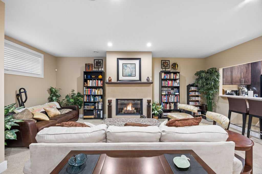 The fully developed basement is designed for relaxation and entertaining, complete with a wet bar, KitchenAid fridge with ice maker, dishwasher, and a dedicated wine cellar with built-in racks. One of three fireplaces adds warmth and ambiance, complemented by hydronic in-floor heating that extends into the heated garage with epoxy floor coating and additional overhead storage.