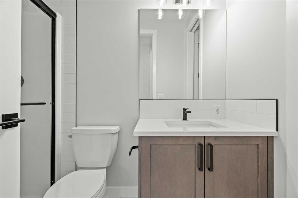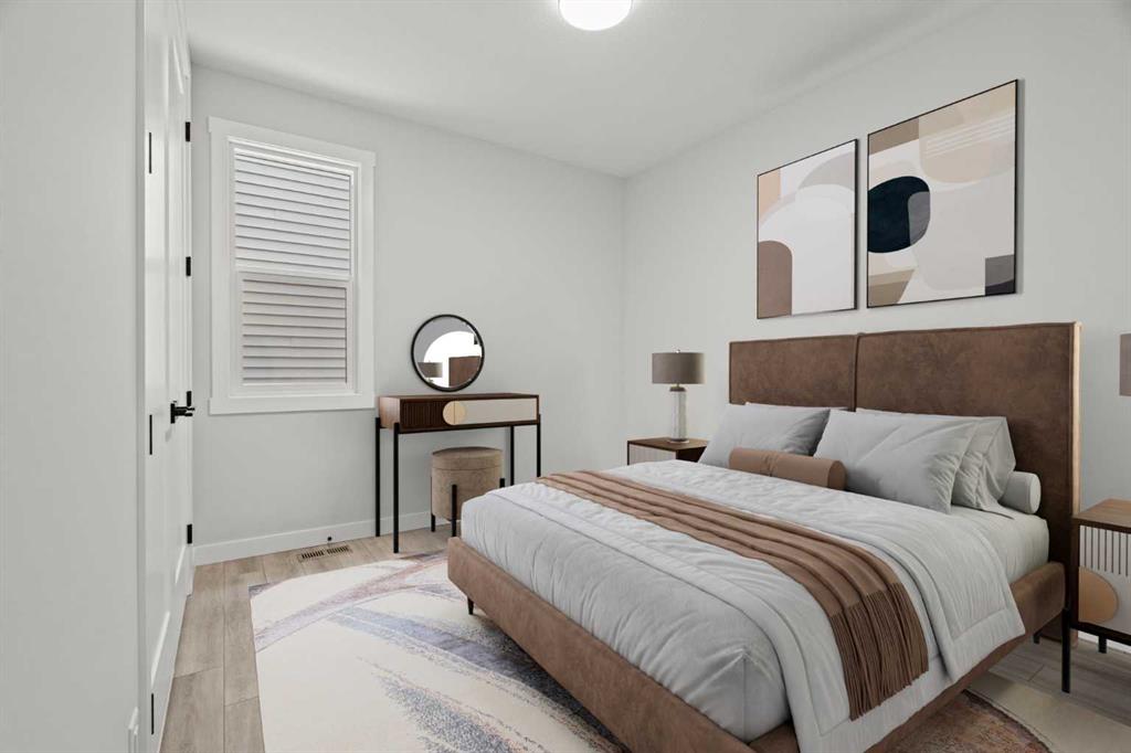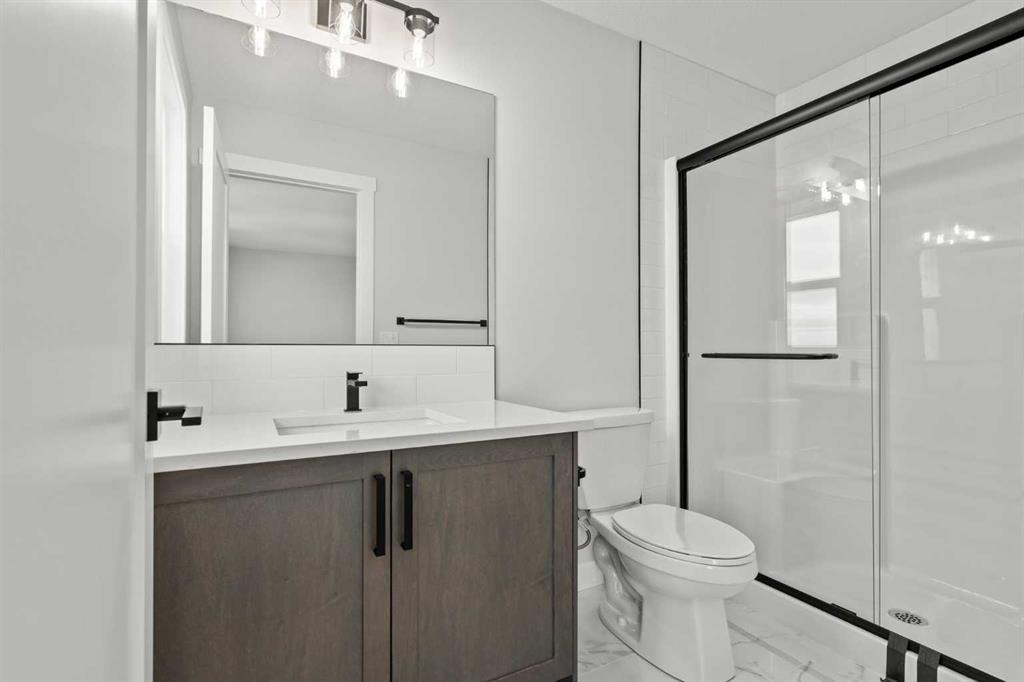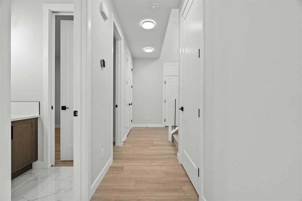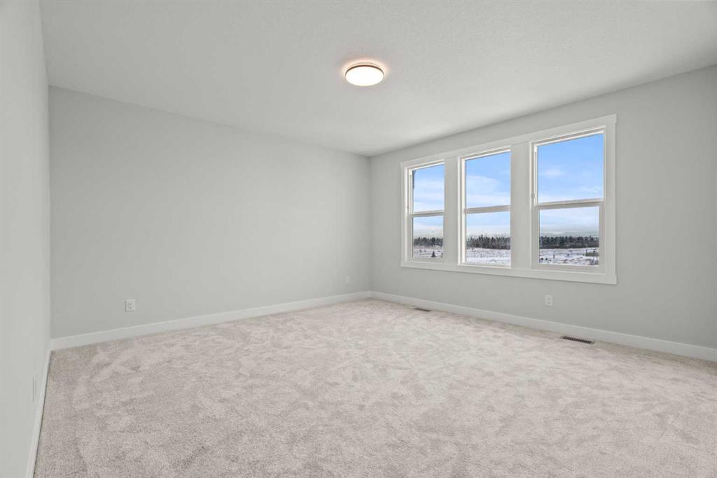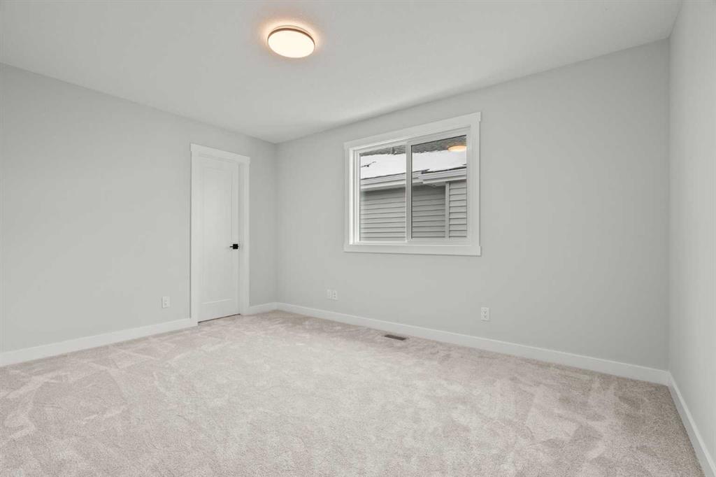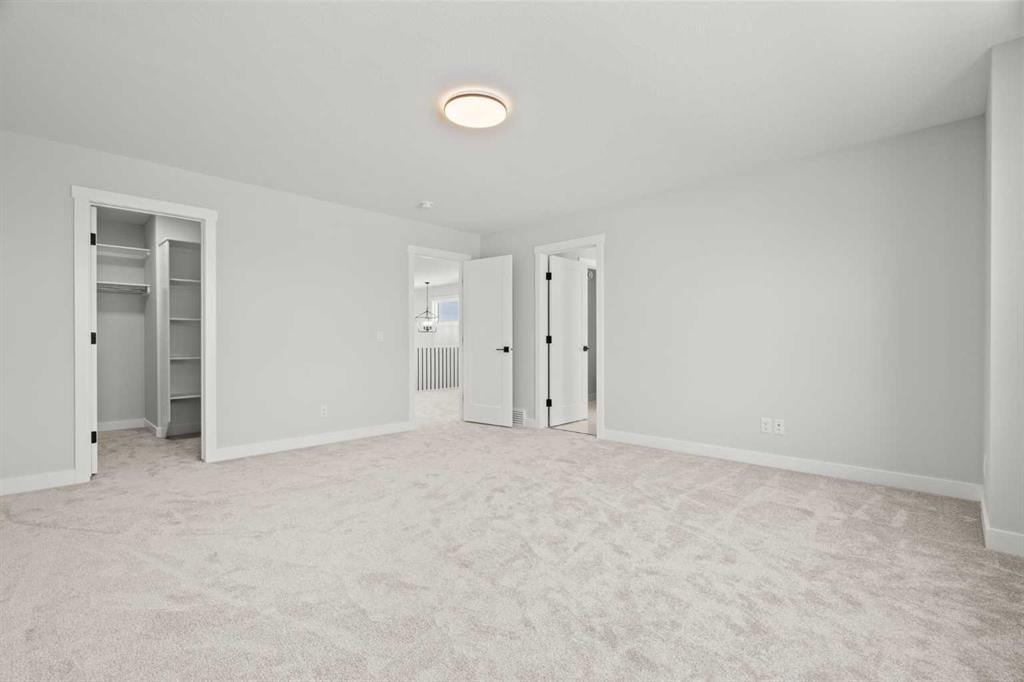 Upstairs, you’ll find two primary bedrooms, each with its own ensuite and walk-in closet. The main primary suite offers a large 5-piece ensuite with an enclosed toilet, full wall tile, and a spacious walk-in closet with upgraded MDF shelving. The second primary bedroom includes a 3-piece ensuite with a standing shower and its own walk-in closet. A third generously sized bedroom also features a walk-in closet and easy access to a nearby 4-piece bathroom. The upper floor is completed with a large bonus room and a full laundry room, finished with quartz countertops, a sink, and tiled flooring.