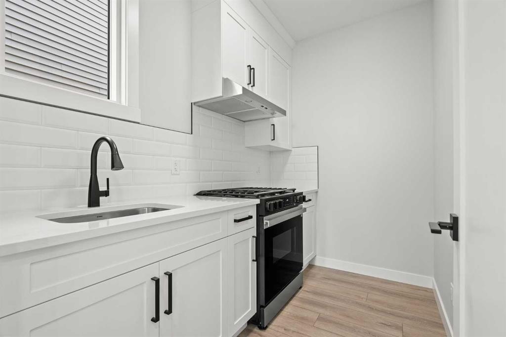At the rear of the home, the layout opens into a bright and inviting living space, featuring a large living room with an electric fireplace and oversized triple-pane windows that flood the space with natural light. The gourmet kitchen is a showstopper, equipped with high-end Samsung stainless steel appliances, quartz countertops, full-height custom cabinets, black hardware, an oversized island, and premium finishes throughout. For everyday convenience, the home also includes a fully equipped spice kitchen.