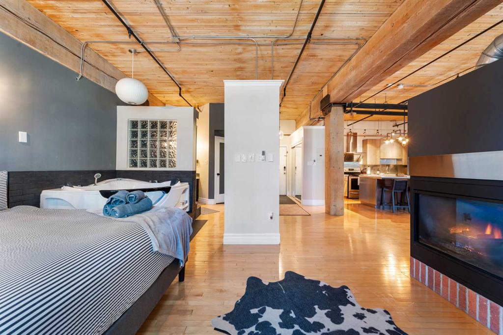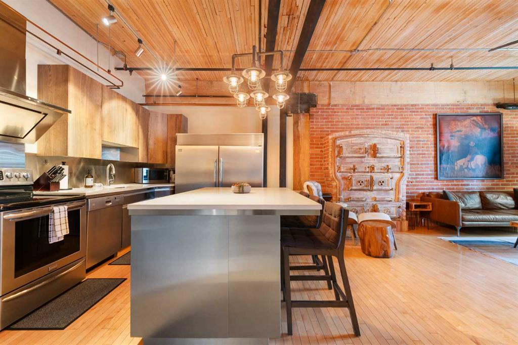 Downtown living at its finest, right on vibrant 10th Avenue SW, just steps from some of Calgary’s coolest restaurants, cafés, and nightlife. This exceptional loft is located in Calgary’s oldest warehouse, originally built in 1909 by the Hudson’s Bay Company, and thoughtfully converted into distinctive residential and commercial live-in lofts. The open-concept layout proudly showcases the building’s heritage, featuring original fir wood ceilings, exposed brick, drop-down beams, and exposed piping, all seamlessly complemented by sleek contemporary finishes. The gourmet kitchen is thoughtfully designed for both form and function, offering stainless steel appliances, a Miele dishwasher, quartz countertops, a Frigidaire refrigerator, and custom cabinetry. A striking central island provides the perfect setting for casual dining or entertaining. Steeped in history yet effortlessly modern, this space showcases true industrial elegance with soaring 13-foot ceilings and original architectural character that speaks to its storied past and inspires creativity and innovation in every corner. Large windows flood the loft with natural light, enhancing the open-concept layout and emphasizing the rich textures and craftsmanship found throughout. One of the few buildings that allows both residential and commercial use, this versatile loft offers flexibility as a stylish home with generous living and dining spaces or as an inspiring professional workspace, complete with a convenient two-piece bathroom. The expansive bedroom—easily adaptable as a premium office—features a luxurious ensuite with a tub and separate shower, along with a spacious closet. French doors open to a Juliet balcony, filling the space with natural light and fresh air. This is loft living redefined—a rare fusion of heritage and contemporary style. The raw, artistic aesthetic creates a canvas for personal expression, while the expansive layout offers flexibility for both everyday living and entertaining. Whether you’re drawn to its vintage charm, creative energy, or unbeatable downtown location, this loft offers a unique urban sanctuary in the heart of Calgary. The building features private underground parking, a generous separate storage space, and a fitness facility. A true blend of heritage meets modernity, this one-of-a-kind residence is perfect for those who appreciate history, character, and the energy of inner-city living.