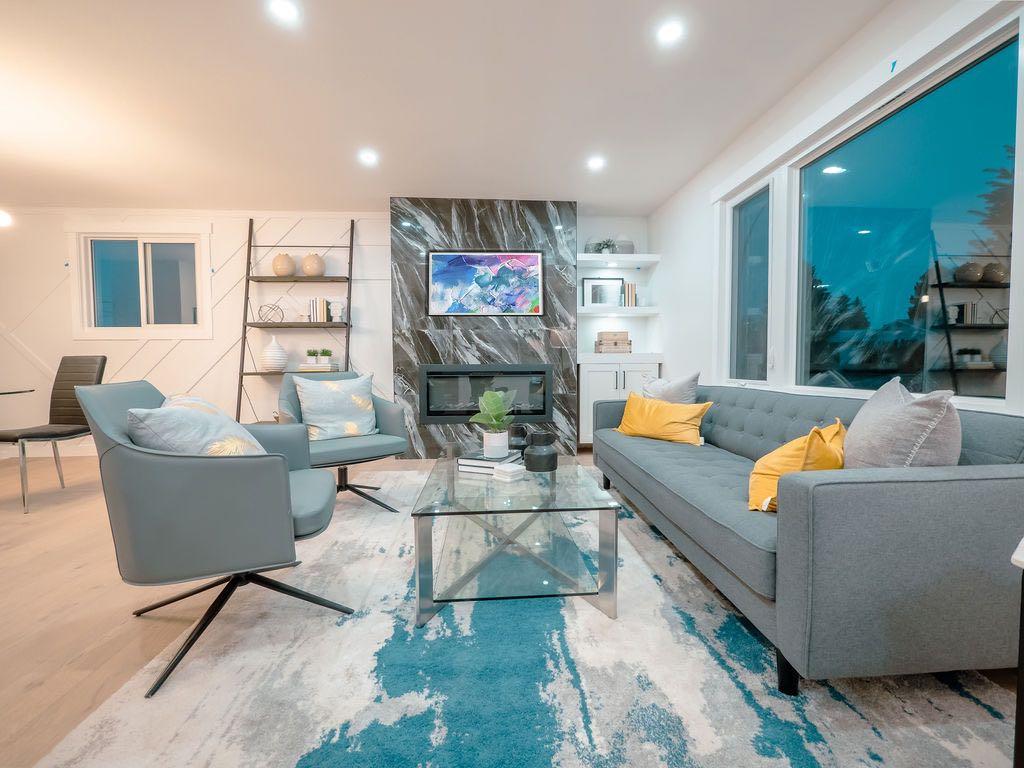 The main floor also includes a large second bedroom, another full bathroom, and an inviting open-concept dining and living area. A cozy fireplace and gleaming hardwood floors, all updated during the renovation, enhance the warmth and elegance of this space.