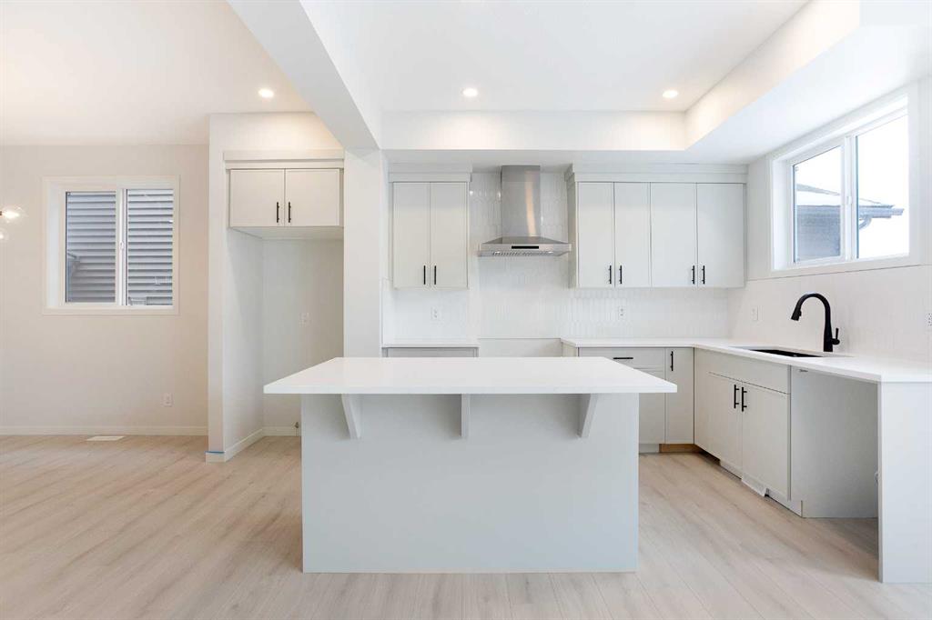The main floor is designed for both entertaining and everyday living, featuring an open-concept layout bathed in natural light, highlighted by light grey luxury vinyl plank flooring that flows seamlessly throughout. The contemporary kitchen is a true centerpiece, equipped with sleek grey cabinetry accented with black hardware, quartz countertops, and a generous central island—perfect for meal preparation, casual dining, or social gatherings. Stainless steel appliances complete the kitchen, while the adjacent dining and living areas are enhanced by a striking grey tile feature wall with an electric fireplace, creating a warm, inviting, and modern focal point that effortlessly blends style and function.