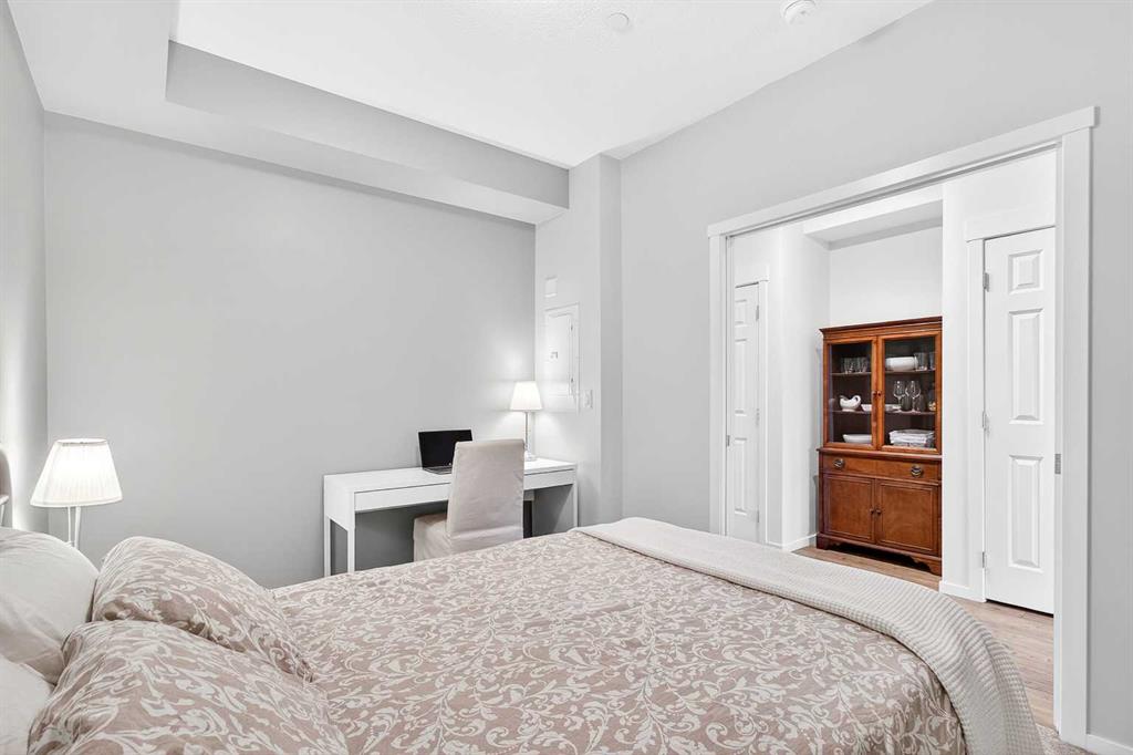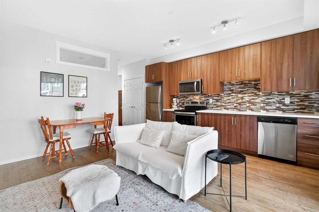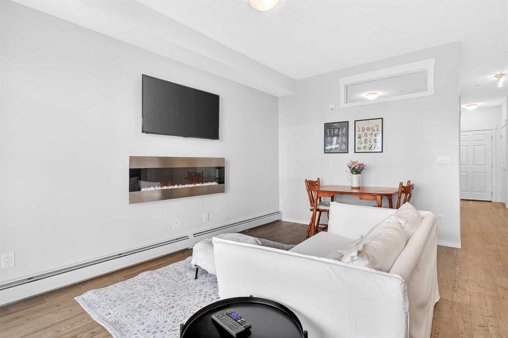 Immaculate 1 bedroom, 1 bathroom unit in Legacy Park, offered FULLY FURNISHED AND COMPLETELY TURNKEY — including all kitchen items and linens as viewed. This gorgeous unit is truly move-in ready or an ideal opportunity for an investor looking to rent immediately. Ideally located on the 2nd floor with an east-facing exposure and 9’ ceilings, the open living area features an electric fireplace and oversized patio doors that flood the space with natural morning light and lead to a sunny balcony with natural gas hookup, perfect for relaxing or entertaining. The modern kitchen offers stainless steel appliances, quartz countertops, full backsplash, and full-height cabinetry with excellent storage and workspace. The spacious primary bedroom, in-suite laundry, and a well-appointed 4-piece bathroom complete the interior. Titled heated UNDERGROUND PARKING and an assigned storage locker add everyday convenience. Walk to shops, restaurants, transit, schools, and pathways. A fantastic opportunity!