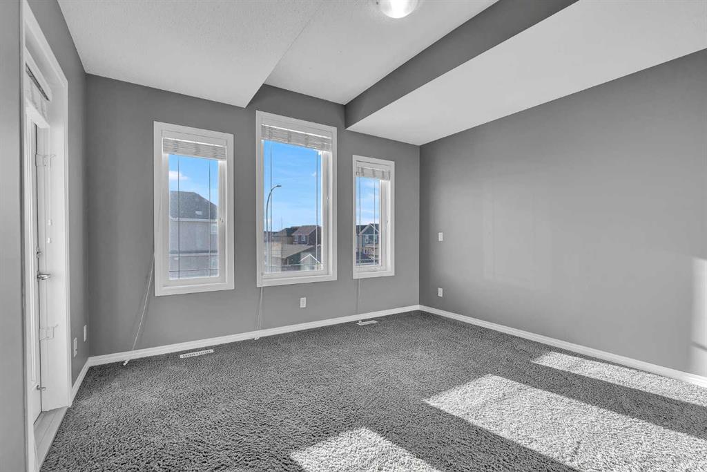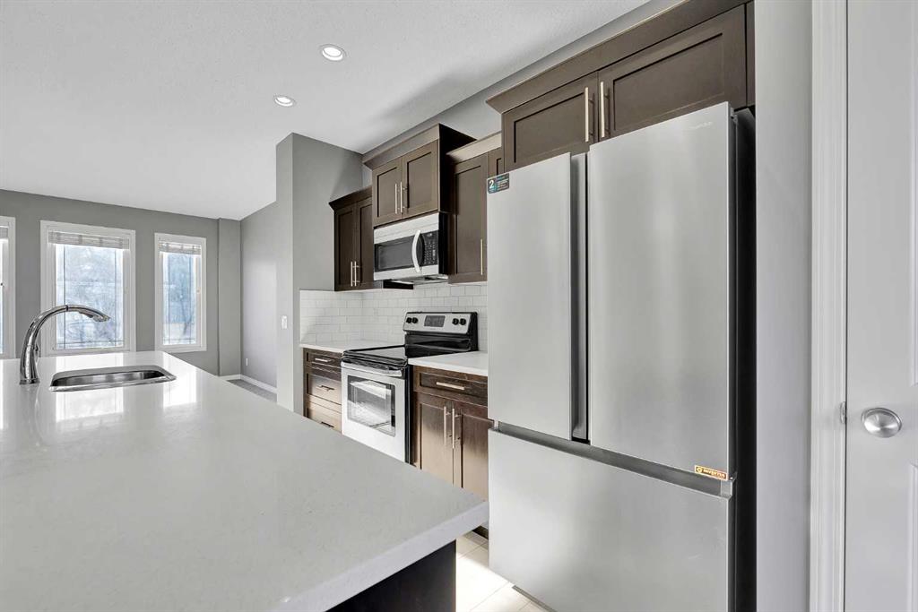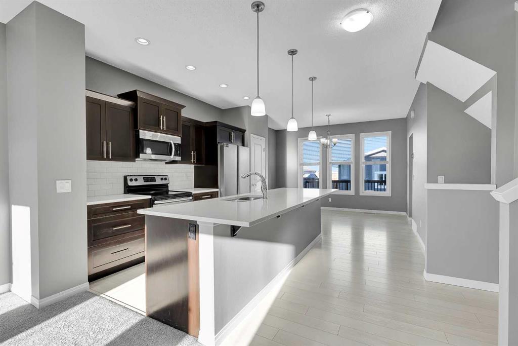 **Open House: 1 -4 pm, Sun, Jan 25**. Modern upgrades and bright, functional living come together in this fully finished and MOVE-IN READY 2-storey detached home in the award-winning lake community of Mahogany. Offers 3+1 bedrooms, 3.5 bathrooms, a double detached garage, a fully developed basement and fresh paint throughout. Central A/C for those hot summer days. Quick possession available! The open-concept main floor is warm and welcoming, featuring a sun filled-living room with brand new carpet. a well-appointed central kitchen with a large quartz island, ample cabinetry, generous counter space, and SS appliances including a brand new fridge. Spacious dining area opens directly onto a huge 12x20 deck—perfect for summer BBQs, outdoor dining, or relaxing evenings in the private and fenced backyard (no neighbours behind). A convenient 2-pc bathroom completes the main level. Upstairs, the primary bedroom offers a private retreat with a walk-in closet and 4-piece ensuite, and a sunny balcony is great for morning coffee or reading a book. Complemented by 2 additional bedrooms and another full bath on this level. The fully developed basement adds excellent versatility with a large family/rec room, a 4th bedroom, and a 4pc bath—ideal for guests or a home office. Lots of storage space in the mechanical room and under the stairs. Outside, the backyard leads to the double detached garage, providing both parking and extra storage. Ideally located with easy access to Mahogany’s lake and beaches, residents enjoy amazing four-season amenities, plus access to nearby schools, parks, playgrounds, scenic pathways, and quick access to Mahogany Village Market, shopping, restaurants, transit, and major roadways. An outstanding opportunity to enjoy lake living at its best!