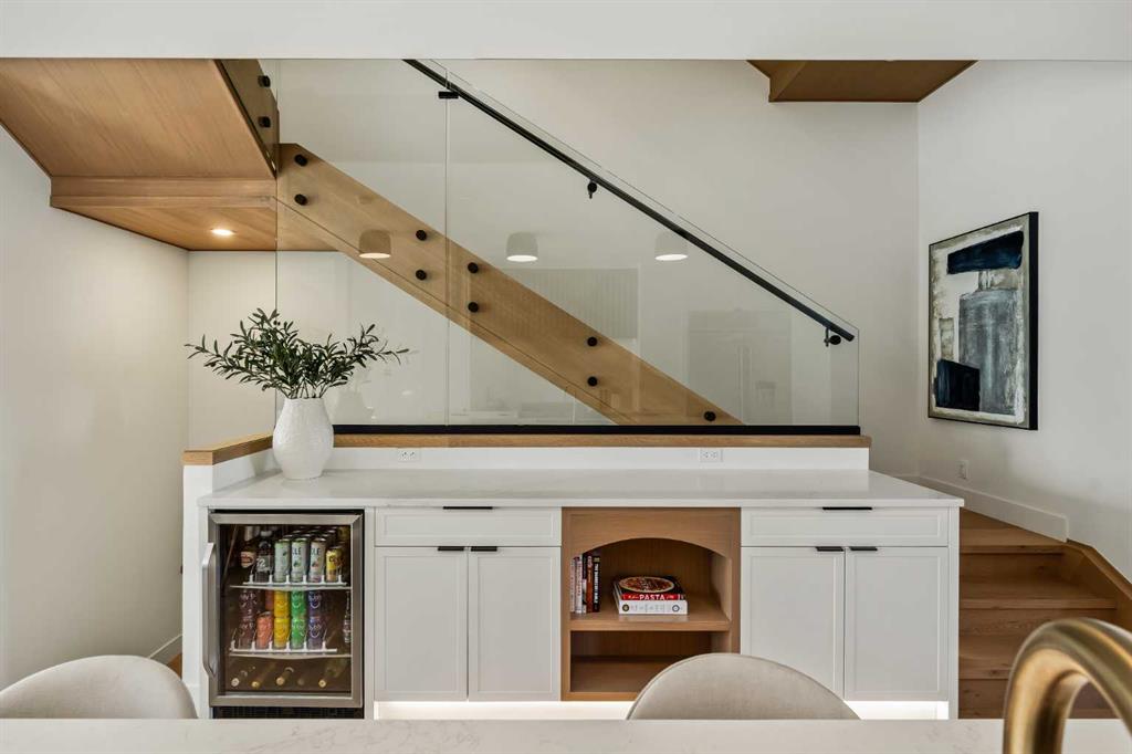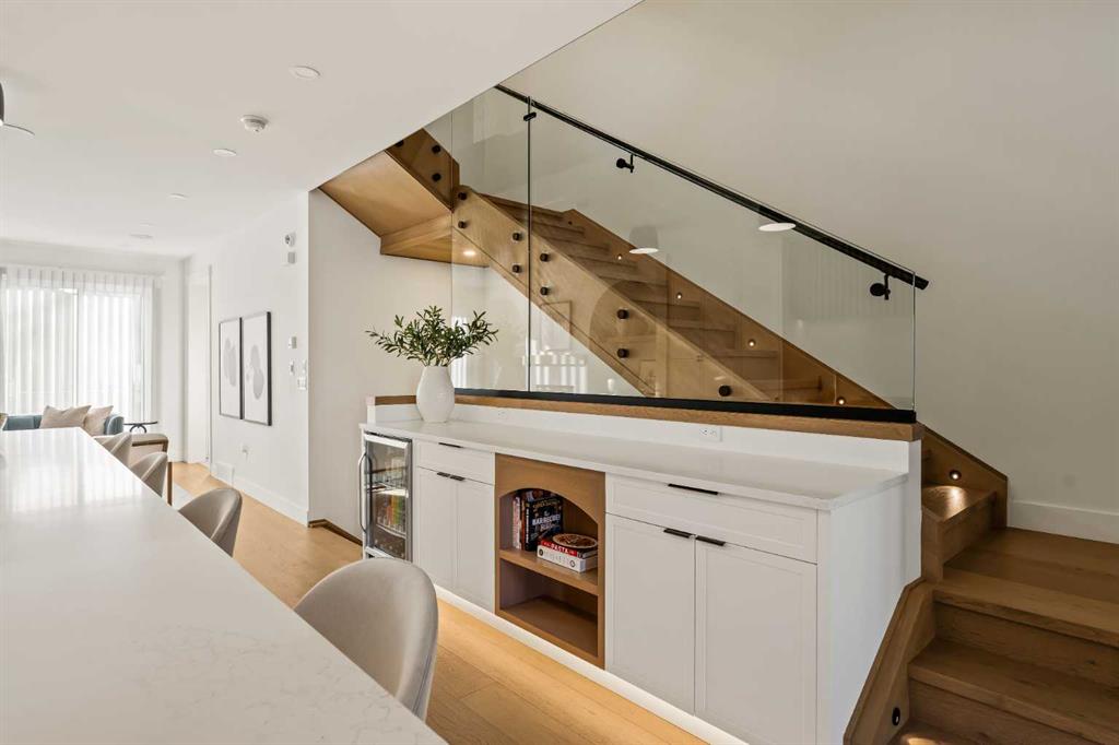 The inviting front entry is both stylish & functional, complete with a built-in bench, coat hooks, & smart shoe storage. A front dining room sets the stage for elegant entertaining, while the heart of the home is the extensively upgraded central kitchen, anchored by a large waterfall island. Highlights include full-height cabinetry, deep lower drawers, soft-close hardware, a built-in pantry, & custom hood fan. Premium JennAir stainless steel appliances include a French-door refrigerator, gas range, built-in microwave, garburator & dishwasher. Across from the island, additional built-in cabinetry & counter space feature a beverage cooler.