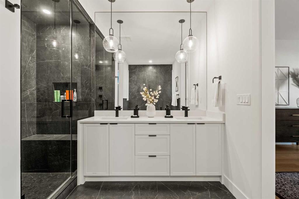 The second level includes the primary retreat featuring a generous bedroom & a spa-inspired 5-piece ensuite with a freestanding soaker tub surrounded by floor-to-ceiling tile, heated floors, a custom walk-in glass steam shower with rainfall shower head & built-in bench, dual vanity, & a walk-in closet with custom organizers, drawers, and a full-height mirror. Two additional bedrooms, complemented by a beautiful 4-piece bathroom & a thoughtfully designed laundry room with abundant cabinetry, counter space, & sink.