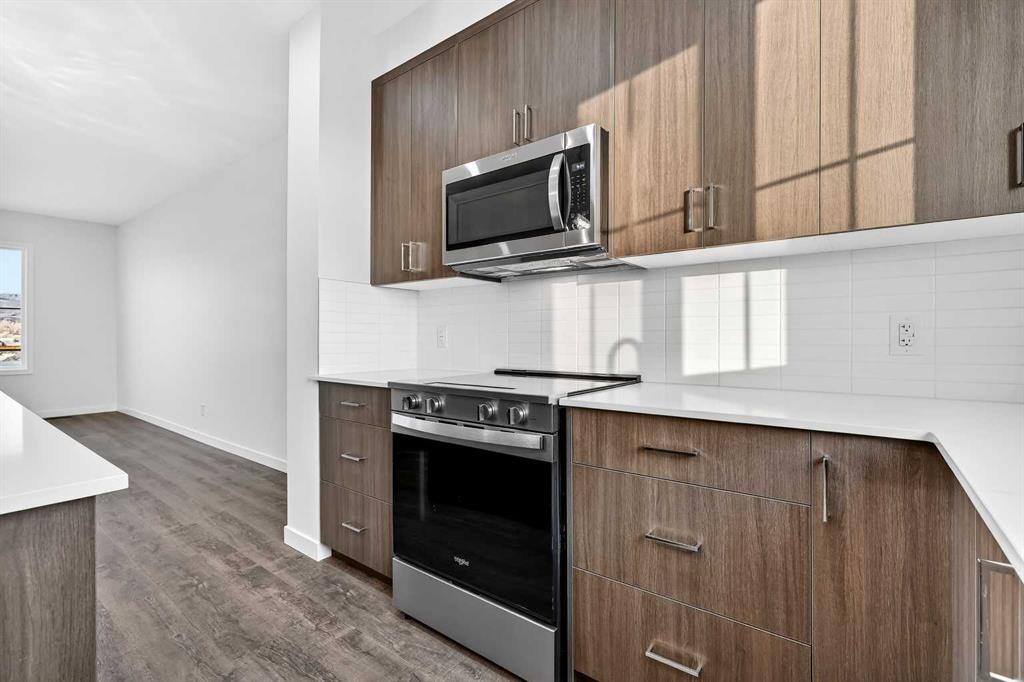 The interior showcases high end craftsmanship, including modern dark slab-style cabinetry with a full bank of drawers for maximum storage. The kitchen is further elevated by polished white quartz countertops and a full suite of premium stainless steel appliances. Durable luxury vinyl flooring runs throughout the primary living areas, while the stairs and upper level are finished with plush carpet over an 8lb underlay for superior comfort. Additional conveniences include an attached double car garage, professionally maintained landscaping, and a lifestyle defined by maintenance free living.