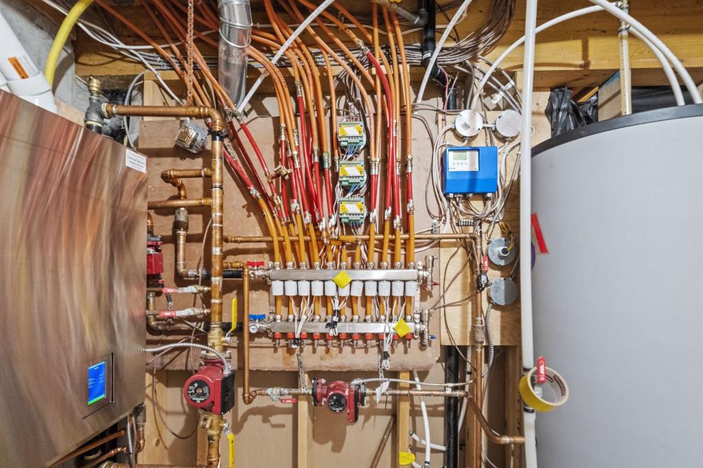 But the true standout is the comfort behind the walls. A whole-home boiler system provides in-floor heating across every level — even the garage — with 17 individual heating zones. The boiler, manifold, and automated controls were fully replaced in 2022, delivering even temperatures, warm floors, and noticeably lower monthly bills. A professional-grade HRV system keeps air fresh year-round, and the heated garage includes two plumbed floor drains tied to town sewer for effortless winter living.