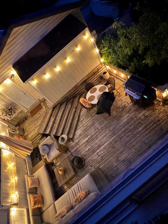 Enjoy long summer evenings in your private, West-facing courtyard-style, low maintenance backyard with string lights along the perimeter. The double garage boasts built in shelves for storage and more strings light for those summer Ping-Pong nights. in addition to all of the the outdoor living extras, your