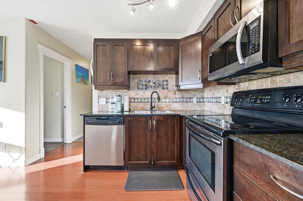 Welcome to this beautifully maintained TOP FLOOR condo offering comfort, convenience, and an unbeatable inner city lifestyle. This bright and functional one bedroom home is PERFECT for first time buyers, students, or investors seeking a move in ready property in a prime SW location. The open layout features a welcoming living area filled with natural light and access to the private balcony, ideal for enjoying your morning coffee or unwinding at the end of the day. The kitchen is well appointed with STAINLESS STEEL APPLIANCES, GRANITE COUNTERTOPS, and QUALITY CABINETRY, providing both style and functionality. The spacious bedroom features NEWER CARPET and generous closet space, while the unit is completed by a full bathroom and the convenience of IN UNIT LAUNDRY. Additional highlights include stall parking with a plug-in and a well maintained building. The location is truly hard to beat, situated directly across the street from 7 Eleven, Calgary Co op, Pizza 73, Second Cup Coffee, and a bus stop. 4 min drive to Walmart, Safeway and the Westbrook shopping centre. A 7 minute walk to both the Westbrook LRT and Shaganappi Pointe LRT stations, and only a 10 minute drive to Mount Royal University, University of Calgary, Downtown, Alberta Children’s Hospital, and Foothills Medical Centre. Shaganappi Golf Course and nearby parks further enhance the lifestyle appeal. This is an excellent opportunity to own a low maintenance, well kept home in a highly accessible and established community with outstanding amenities at your doorstep.