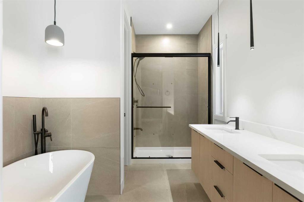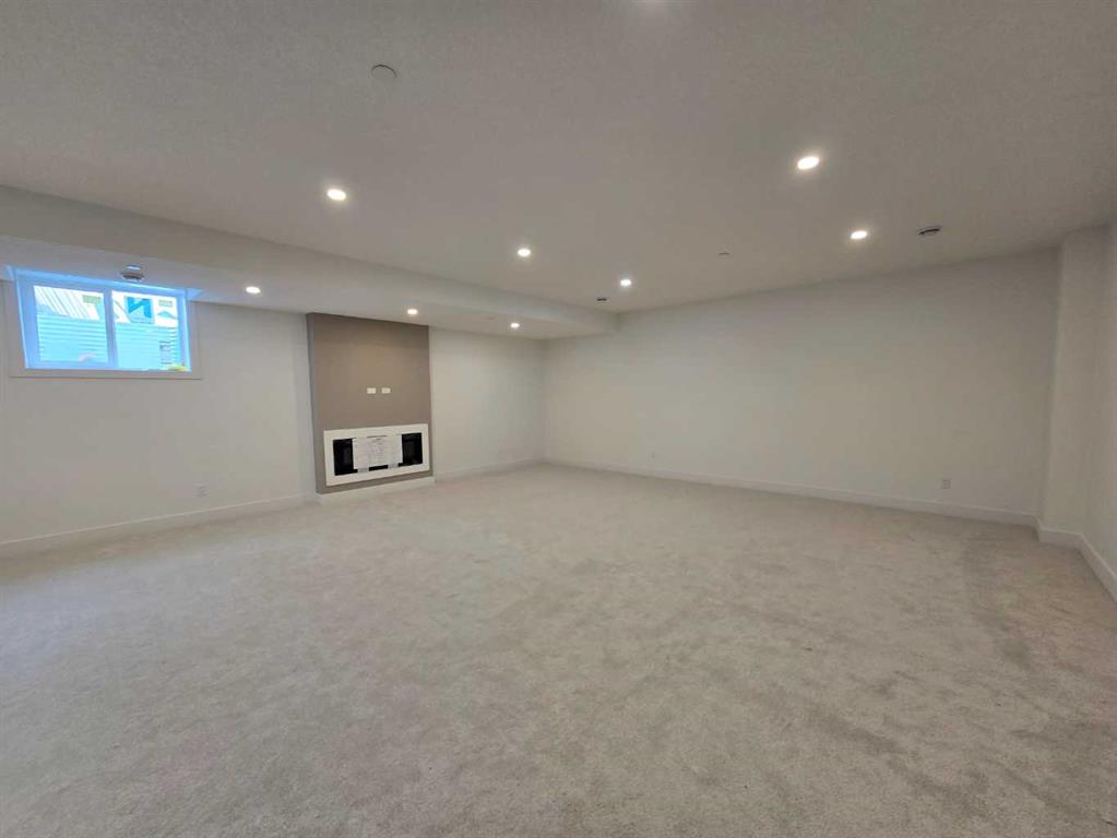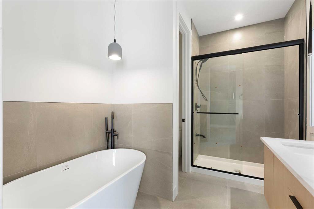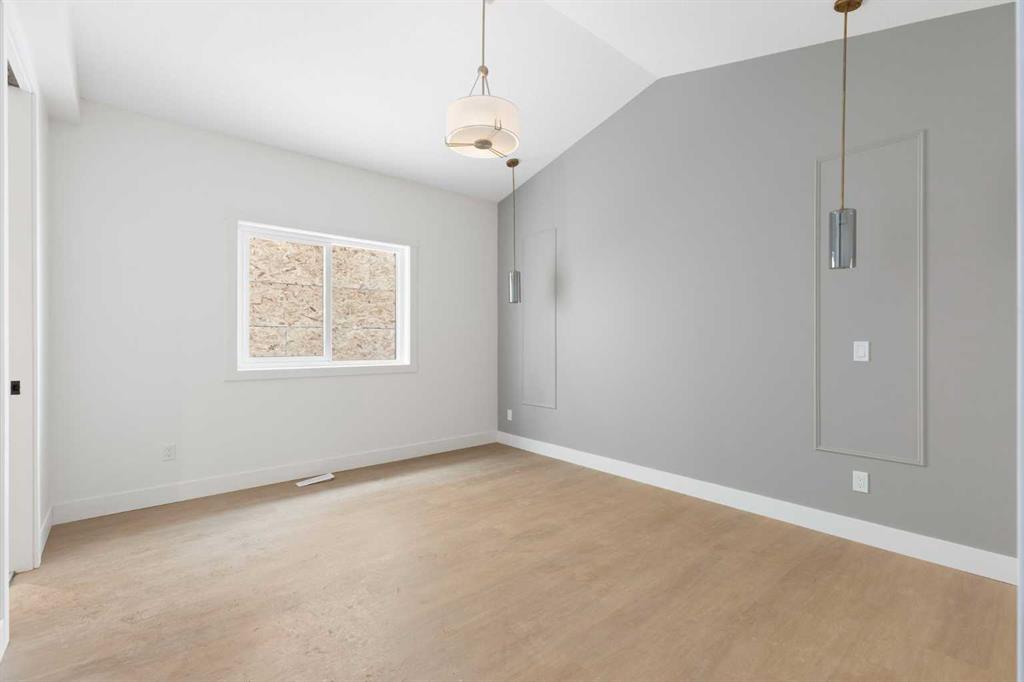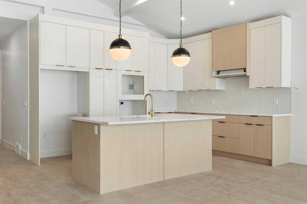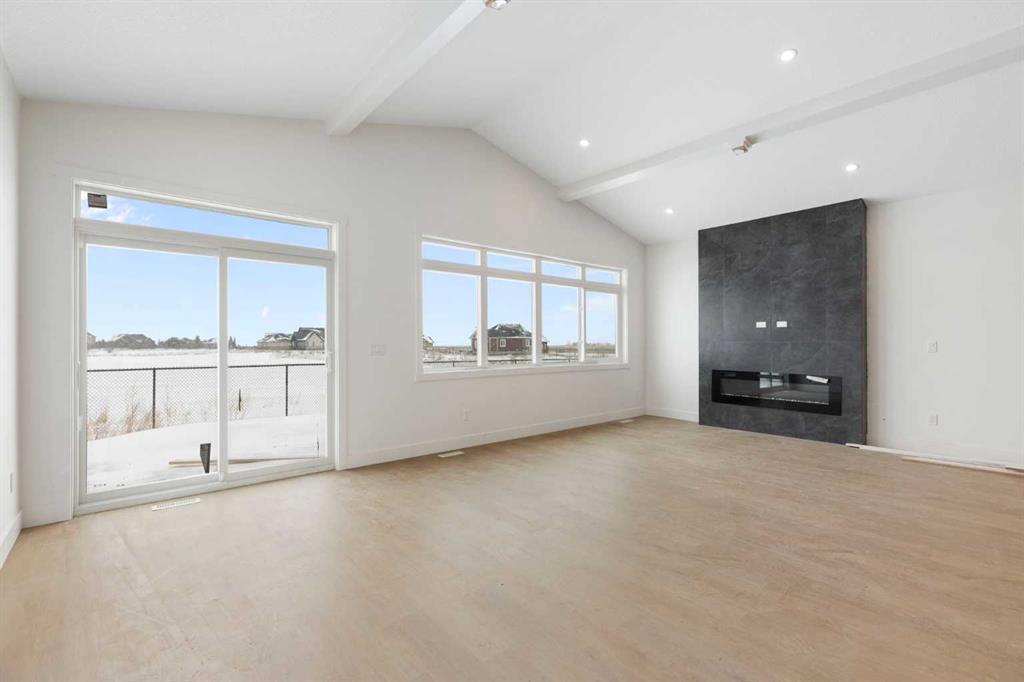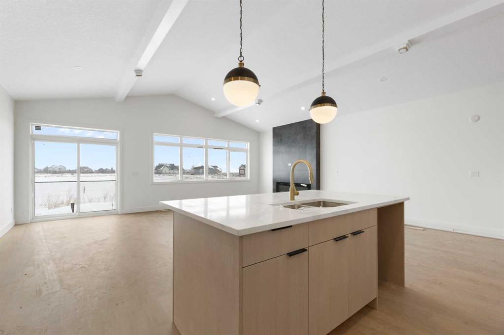 ELIGIBLE FOR FIRST HOME BUYERS GST REBATE. Brand New Fully Finished Bungalow | Pond & Mountain Views | Quiet Cul-de-Sac | Lakes of Muirfield Welcome to 26 St. Andrews Close—an exceptional brand-new semi-detached bungalow perfectly positioned on a quiet cul-de-sac in the sought-after golf course community of Lakes of Muirfield. Backing onto open space with no neighbours behind, this home offers stunning pond and mountain views along with 3,258 sq ft of beautifully finished living space. The main floor spans 1,662 sq ft above grade and showcases soaring vaulted ceilings and an open-concept design filled with natural light. The chef-inspired kitchen features quartz countertops, an oversized island with seating, stainless steel appliances, modern cabinetry, and statement pendant lighting. The kitchen flows seamlessly into the dining area and spacious living room, highlighted by a dramatic floor-to-ceiling tile fireplace feature wall. Expansive rear windows frame peaceful water views and open skies, creating a truly serene backdrop. The primary suite is a private retreat complete with a walk-in closet and a luxurious 5-piece ensuite with dual vanities, a deep soaker tub, and separate shower. A second bedroom, full 4-piece bath, mudroom, and convenient main-floor laundry complete this thoughtfully designed level. The fully finished basement offers incredible additional living space with a massive recreation room and stylish wet bar—perfect for entertaining or relaxing. Two additional bedrooms, a full bathroom, ample storage, and a second laundry area add flexibility and function, ideal for guests or multi-generational living.
