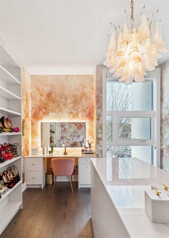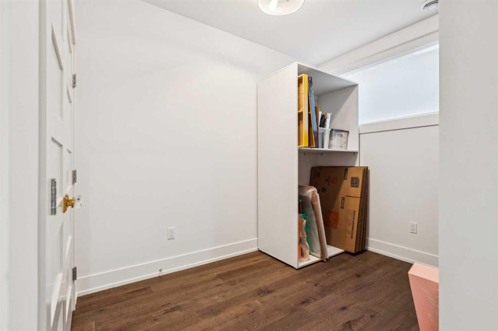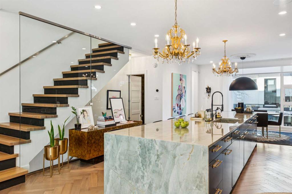Exceptionally high-quality home in sought-after Parkhill, just a few doors from the Ridge Park with access to the Elbow River pathway system. Enjoy a walkable lifestyle minutes from the vibrant 4th Street Village, offering an endless array of shops, dining, and services, along with proximity to excellent schools. This stunning contemporary residence showcases impeccable design and craftsmanship with bespoke architecture by Marvin DeJong and an incredible array of upgrades. Brick, metal, and stucco create a striking curb appeal punctuated with a custom 2.5” solid oak and glass front door. 3,096 sq ft of developed living space including 4 bedrooms and 3.5 bathrooms. The totally open-concept main floor features high ceilings, exceptional natural light from the oversized front and rear windows and custom herringbone hardwood floors. The living room is anchored by a custom-paneled fireplace with “frame” television and soft floor-to-ceiling sheers. Truly incredible chef’s kitchen with extensive custom cabinetry, quartzite counters and a massive “waterfall” island with seating. Top appliances include: a La Cornue gas stove, Subzero fridge plus 2 fridge drawers, 2 Subzero freezer drawers, 2 Subzero wine fridges, Wolf Induction burner, 2 dishwashers and a custom fabricated quartzite sink. The generous dining area with designer lighting and built-in storage overlooks the rear yard . A mudroom with heated floor and excellent storage and a discreet, elegant powder room complete the main level. Striking staircase with glass wall and solid wood treads leads to the upper floors…no carpet in the home. The primary suite features blackout drapery, wall-mounted TV and a well-organized walk-in closet. The spa-inspired ensuite showcases heated custom marble flooring, designer lighting, Kateryn cast iron soaking tub, zero-threshold shower with steam, water closet with Japanese bidet toilet and a large double vanity with honed marble counter and Restoration Hardware fixtures. The balance of the second level includes two bright bedrooms (one currently used as a dressing room), a spacious house bath and a walk-in laundry room with sink and storage. The top-floor holds both a large studio space with amazing light quality and an office area with access out to a large and private terrace. The fully finished lower level offers heated hardwood floors, a media space, games room, work station, bedroom and a full bath. Outdoor living is equally impressive with a front terrace with perennial-rose garden and a sunny west-facing and low-maintenance back yard with multiple patios. Additional highlights include a smart home system that controls Lutron lighting, temperature and security, a sprinkler system and Gemstone exterior lighting. The fully finished and heated double garage has 2 EV chargers and enjoys a paved alley. This exceptional property must be seen to be appreciated.