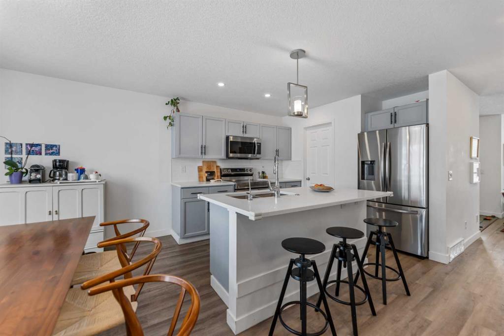 Welcome home to McKenzie Towne, where this fully renovated two storey offers the space, layout, and move in ready finish you have been waiting for. With five bedrooms, three and a half bathrooms, and over 2,500 square feet of developed living space including a fully finished basement, there is room here for every season of life. From the moment you step into the impressively sized foyer, the open concept main floor feels bright, welcoming, and effortless, finished with modern vinyl plank flooring and ceramic tile throughout. The spacious living room is anchored by a cozy corner gas fireplace with recessed lighting, flowing beautifully into the kitchen and dining area. The kitchen has been completely refreshed with brand new stainless Samsung appliances, quartz countertops with a breakfast bar, a new tile backsplash, and a huge walk in pantry that you will actually use. Big dining room windows pour in natural light, and the convenient back door leads to your new BBQ deck, perfect for family dinners and weekend entertaining. A main floor two piece bathroom and laundry area complete the level with everyday practicality. Upstairs, you will find three generous bedrooms and two full bathrooms, including a truly expansive primary suite that easily fits a king size set, plus an upper balcony, a five piece ensuite with double sinks, soaker tub, stand up shower, private toilet room, and a walk in closet. The finished basement adds even more flexibility with a massive family room, two additional bedrooms, a full four piece bathroom, storage under the stairs, and the utility room. Outside, the fully fenced backyard is ready for pets, play, and gardening, complete with raised garden beds, a greenhouse, a storage shed, and a double detached garage with a bonus double door fridge for extra groceries and drinks. Knock down ceilings are the finishing touch. Take the 3D tour, then book your private showing, this one is even better in person.