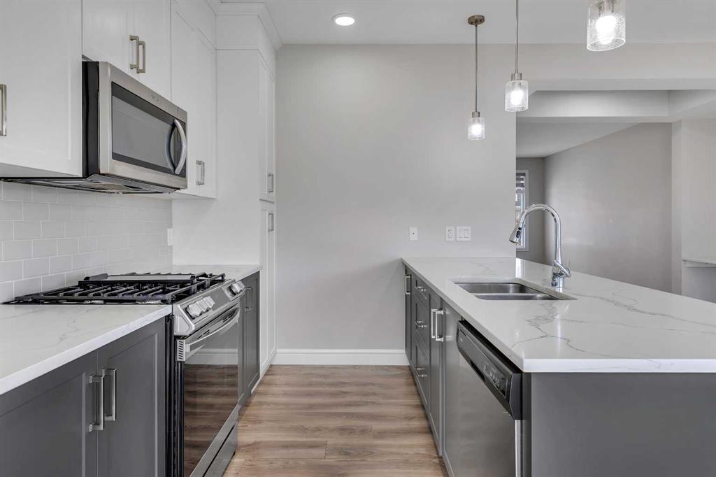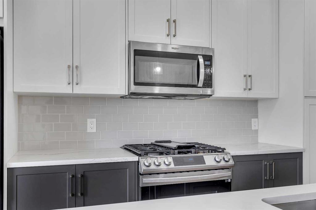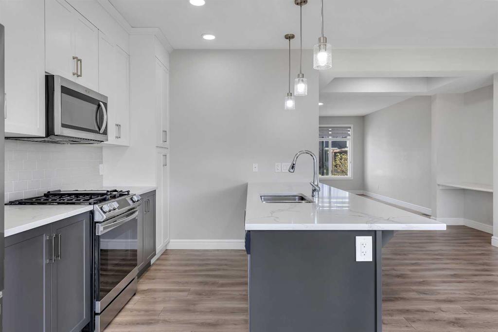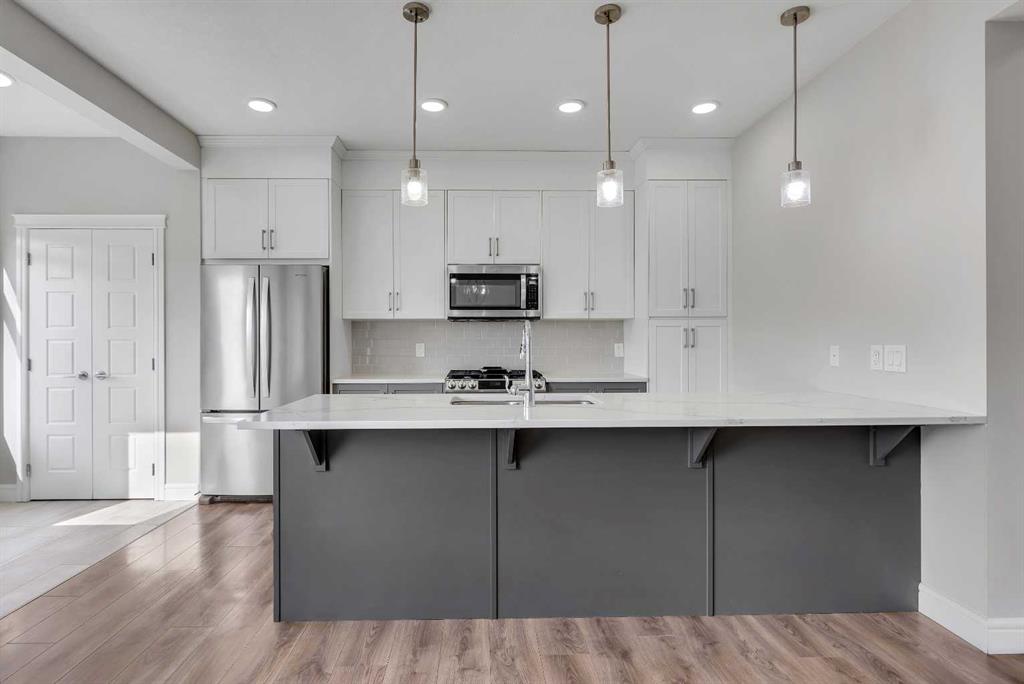 At the heart of the home is the stylish kitchen, featuring quartz countertops, tall white upper cabinets paired with modern grey lowers, and a large flat island that blends beautifully into the overall design. The kitchen opens to a spacious dining room and a cozy breakfast nook—perfect for everyday family meals or entertaining guests. It’s the ideal gathering space, whether for quick weekday breakfasts or relaxed dinners with loved ones.