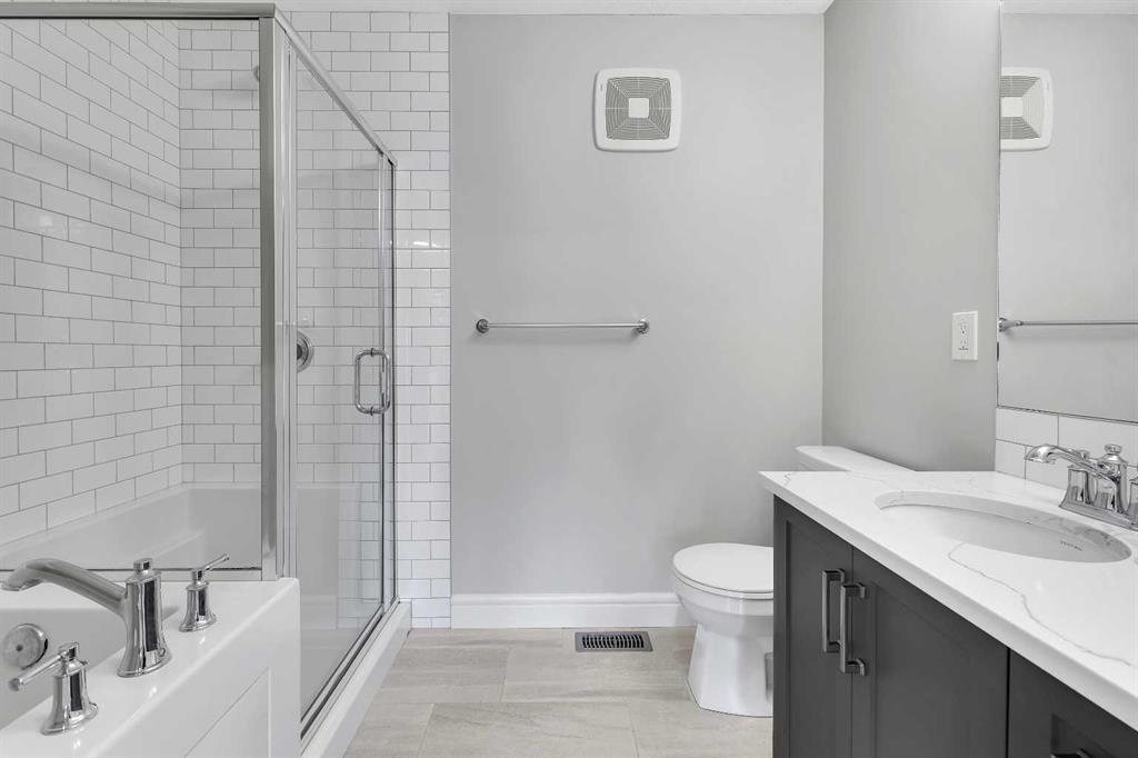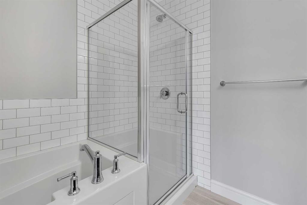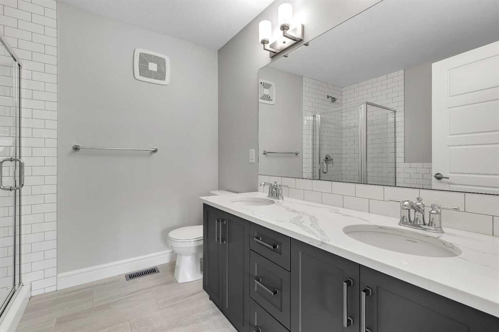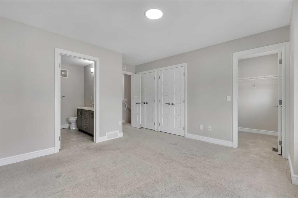 Upstairs, you’ll find three well-appointed bedrooms. The primary suite is a true retreat, complete with a private ensuite that includes quartz counters, double sinks, a luxurious soaker tub, and a separate shower. The additional bedrooms are generously sized, making them perfect for children, guests, or flexible use such as a playroom or study.