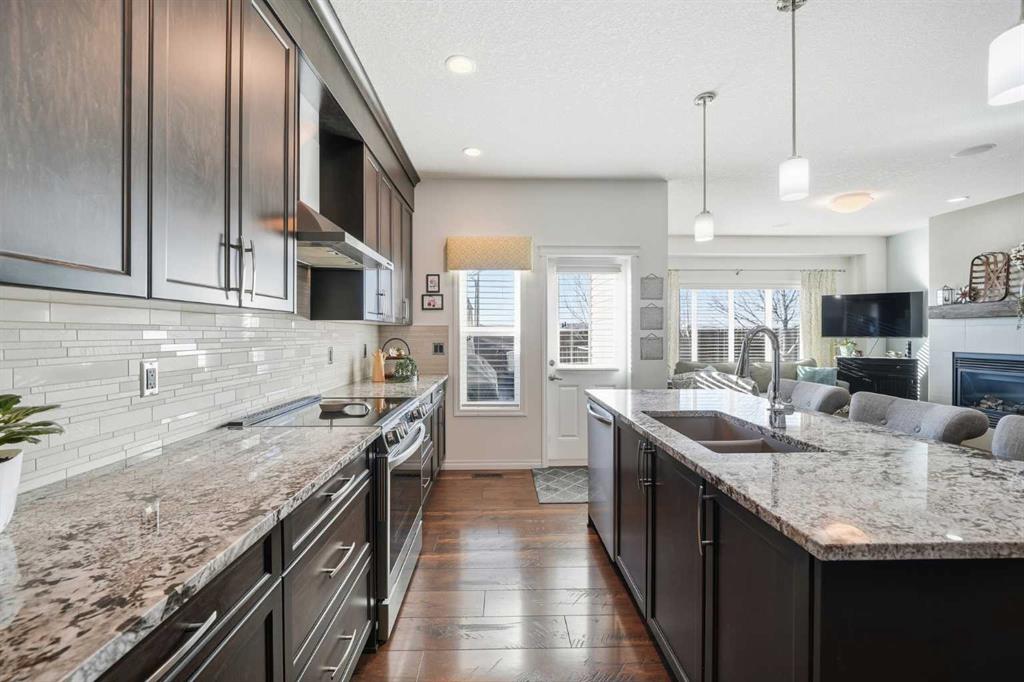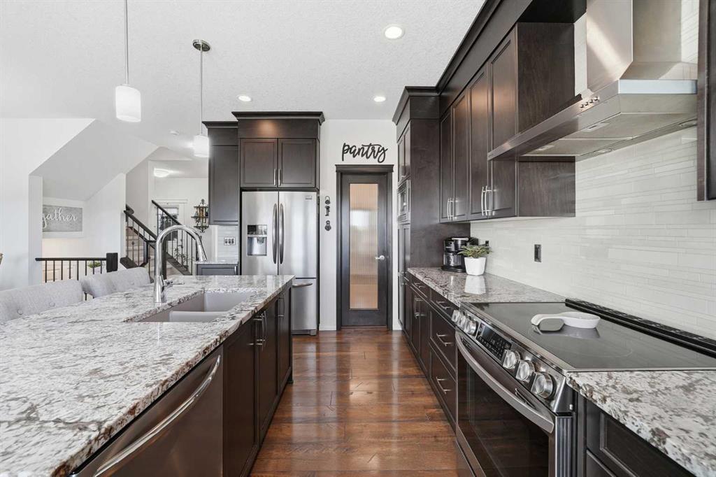 This former Excel showhome, with large fully fenced backyard, has been impeccably maintained, offering a rare blend of elevated design, thoughtful functionality, and family-friendly living. With classic curb appeal, mature trees, irrigation, an extended composite deck, and higher fencing, the exterior is both polished and private (no neighbours looking into your backyard!). Inside, the home showcases 9’ main-floor ceilings, wide-plank engineered hardwood, ceramic tile, upgraded shutter blinds throughout, and striking wrought-iron railings - details that reflect true quality. The gourmet kitchen anchors the main floor, featuring upgraded cabinetry & mouldings, gorgeous stone countertops, large island w/ undermount sink, stainless steel appliances (newer stove & fridge w/ water/ice), and a walk-through pantry with custom built-ins - perfect for both entertaining and busy family life. The living room is warm and inviting with large windows, and features a stunning fireplace. The main floor is finished with a mudroom (with custom built in), 2pc bath removed from all living spaces, handy closets & a generously sized dining area. Heading upstairs you'll notice a stunning skylight, and how the floorplan is thoughtfully designed with families in mind. A bright bonus room with vaulted ceilings, 2 generously sized bedrooms each with walk-in closets, a full 4-piece bath, and a built-in workspace ideal for homework or working from home. The primary retreat feels like a private escape, with an upgraded tray ceiling, walk-in closet, and a spa-inspired 5-piece ensuite with a separate water closet. Upstairs is complete with a laundry room w/ additional storage. Downstairs, the fully finished basement adds exceptional versatility with a spacious rec room featuring additional baseboard heat, a 4th bedroom, a 3-piece bath, and ample storage. Additional upgrades include air conditioning, heated garage, Vacu-Flo system, recessed lighting, added trees in the backyard, and surround-sound wiring throughout the main and upper floors. Ideally located steps from a large park and green space, and offering quick access to Mcleod Trail and Stoney Trail, this home delivers showhome-quality finishes, everyday comfort, and an exceptional setting for growing families who appreciate refined living.