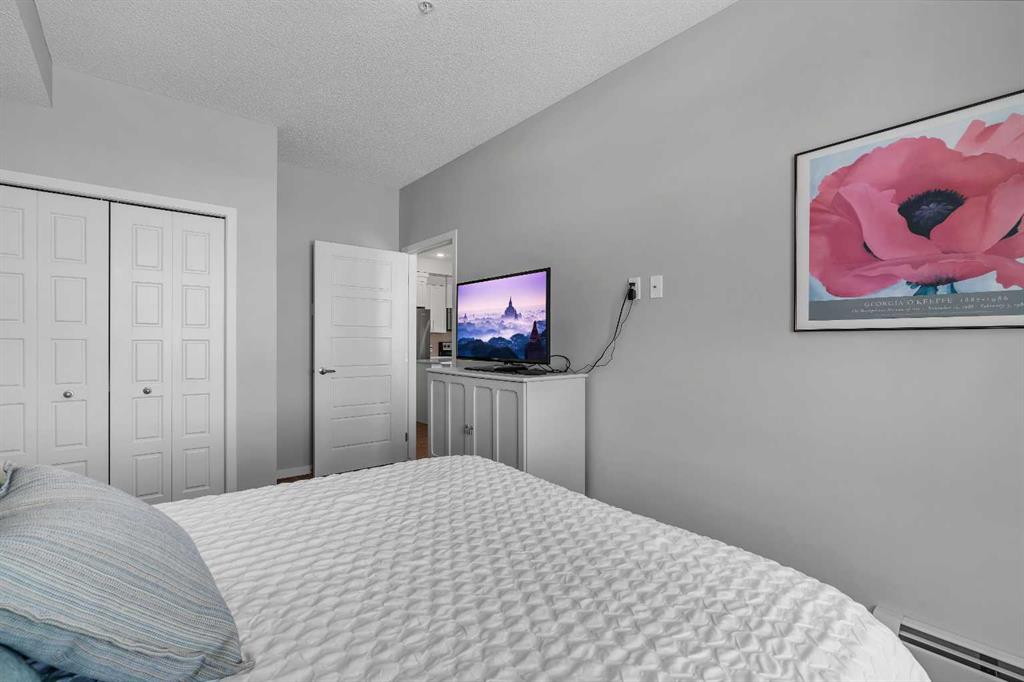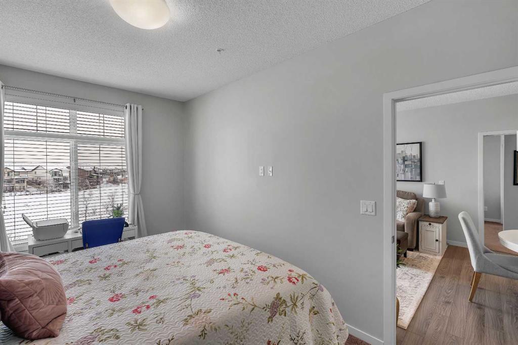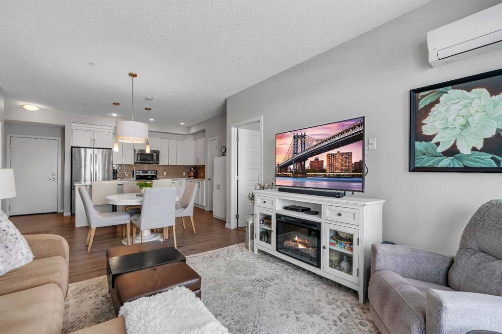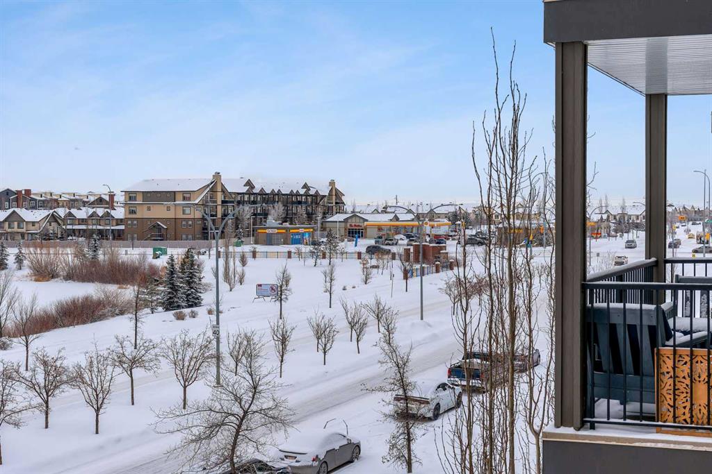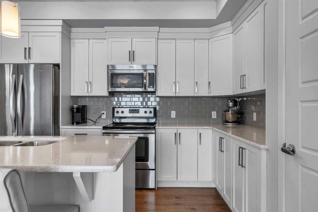 Welcome to this light-filled and beautifully designed 2-bedroom, 2-bathroom condo in the highly sought-after community of New Brighton. Offering a fantastic layout with 9-foot ceilings and triple-pane windows, this bright and airy unit is filled with natural light and designed for comfortable, modern living. The open-concept kitchen is a true standout, featuring a spacious 7-foot island with quartz countertops, stylish tile backsplash, stainless steel appliances, and ample cabinetry—perfect for cooking, entertaining, or casual dining. The kitchen flows seamlessly into the dining and living areas, creating an inviting space to relax or host guests. Step out onto your private balcony and enjoy peaceful pond and mountain views, stunning sunsets, and the convenience of a BBQ gas hookup—an ideal outdoor retreat. Inside, durable laminate flooring enhances the main living areas, while both generously sized bedrooms offer plush comfort. The primary suite is complete with twin closets and a large ensuite featuring an oversized walk-in shower. A second spacious bedroom and full bathroom make this home ideal for guests, roommates, or a home office.