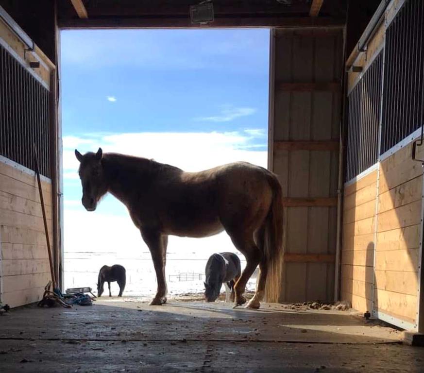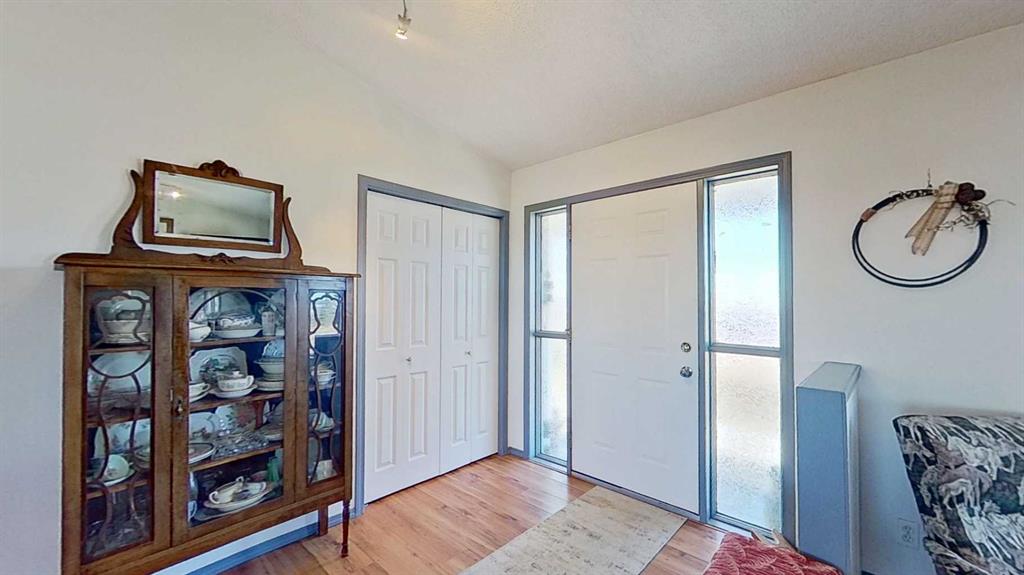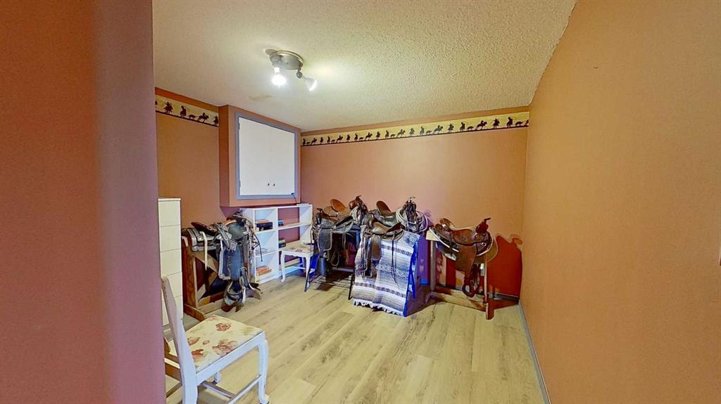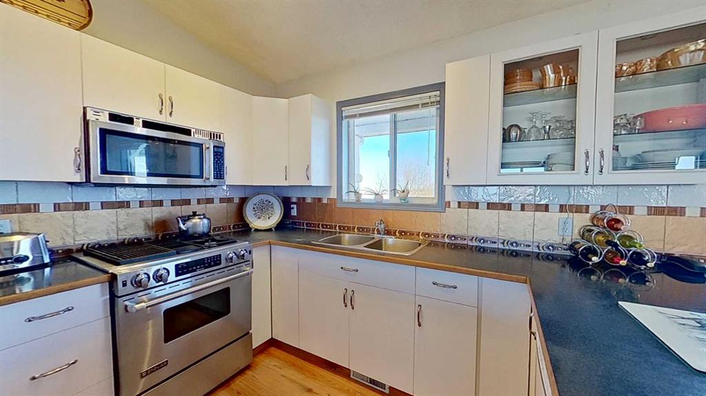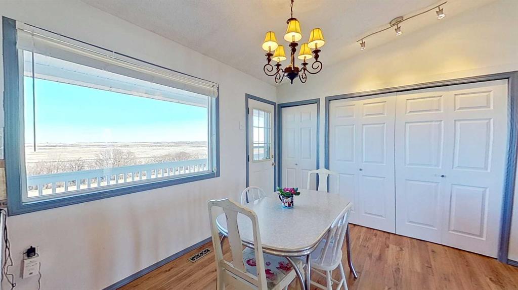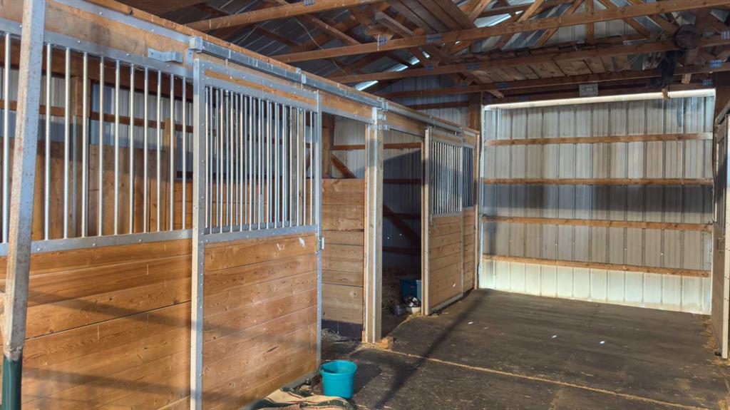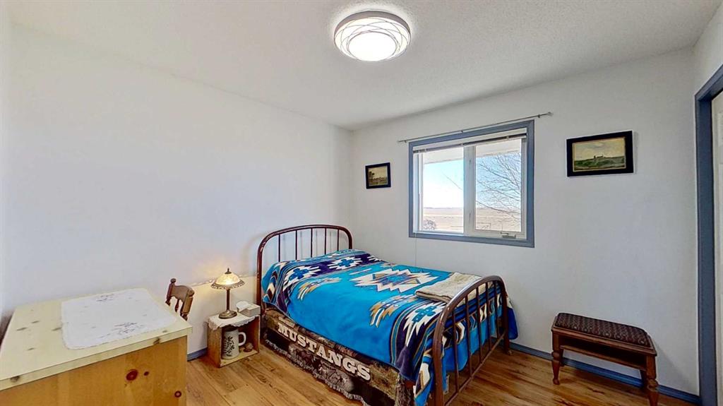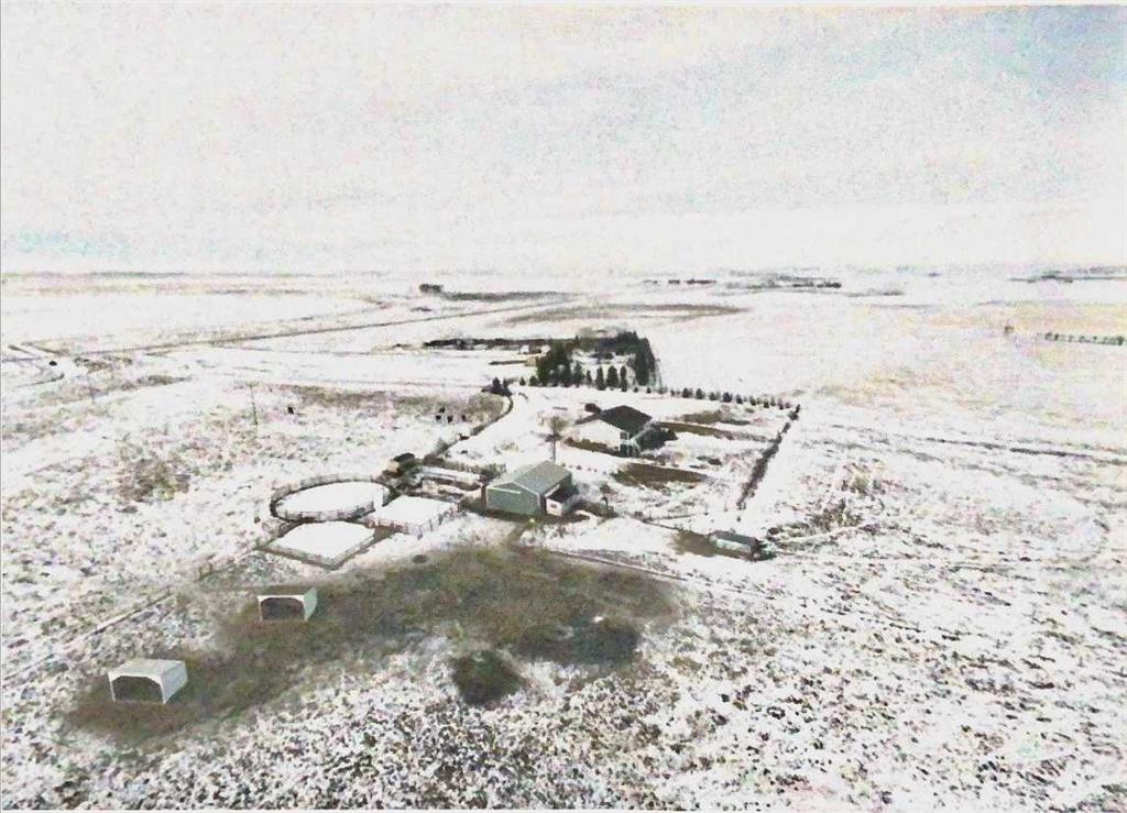 Prairie Panorama. Stunning sunrise and sunset views from a gentle rise on 50.92 acres bordered by an irrigation canal. The 1284 sq ft bright open concept bungalow offers 3 bedrooms and 2 bathrooms upstairs, including an ensuite with a two-person jetted tub. A gas-fireplace living room and a combined kitchen/dining area open to both front and back decks. The fully finished walk out basement adds a large family room, an additional bedroom, an office, a full bathroom, and a generous storage room. The landscaped yard features an irrigation system, mature fruit tress and berry bushes, terraced beds, and a water feature. Outbuildings include a 30 X 40 sq ft Quonset with water hydrant, 4 box stalls with mats, and a concrete-front shop area. The land is fenced and cross fenced with two automatic waterers, two corrals, a round pen, three horse shelters, and three storage sheds, one used as a tack shed beside the hitching post. Annual lease income of approximately $4075. An additional 5.67 WID acres are part of the fenced pasture. The pasture includes a fenced dugout suitable for stocking trout, and parts are on hand to repair the aerating windmill. A man- gate connects the front pasture to the installed culvert under the canal road, with a trenched hose leading to the yard for future irrigation expansion. Ride, hike, bike out along the canal. A natural gas Kohler generator automatically provides whole-property back up power. Subdivision potential exists. Location advantages: 10 minutes to Strathmore, 13 minutes to De Havilland field, 30 minutes to Calgary.