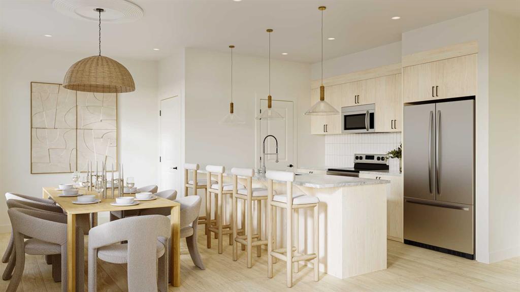 Welcome to the Bergen, a spacious and beautifully designed 3-bedroom, 2.5-bathroom townhome by award-winning Rohit Homes, offering 1,608 sq. ft. of thoughtfully planned living space. Styled with the calming Ethereal Zen palette, this home blends soft modern tones with warm, tranquil finishes—ideal for families, professionals, or anyone seeking a peaceful, contemporary lifestyle. One of the standout features of the Bergen is its unique layout, with the main floor elevated on the second level, creating a bright, airy living experience with enhanced privacy and views. The open-concept main floor seamlessly connects the living, dining, and kitchen areas, while the Ethereal Zen palette brings soothing elegance through light, airy colors, natural textures, and refined accents. The kitchen is equipped with full-height cabinetry, quartz countertops, stainless steel appliances, and modern lighting. Large windows throughout the home ensure the space is filled with natural light. Upstairs, the primary bedroom offers a serene retreat with a walk-in closet and private ensuite. Two additional bedrooms provide versatility for family, guests, or a home office. A full bathroom and upper-floor laundry add convenience to everyday living. With 1,608 sq. ft. and a single-car garage, this home delivers both style and functionality. Located in the desirable community of Sage Hill West, residents enjoy access to scenic pathways, parks, and natural green spaces. Major shopping areas—including Sage Hill Crossing, Creekside, and Beacon Hill—are just minutes away, and easy routes via Stoney Trail and Shaganappi Trail ensure smooth commuting. Modern, serene, and designed for comfort, the Bergen with the Ethereal Zen palette is a standout opportunity in northwest Calgary. Don’t miss your chance to make it yours—contact us today for more details! Photos are of similar models and used to show layout and color palette options. Not of the exact unit.