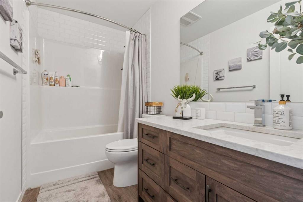 The primary retreat includes a walk-in closet, spa-like ensuite with dual sinks, quartz counters, walk-in shower, and heated toilet seat, plus private balcony access. Two additional bedrooms share a stylish 4-piece bath, and a large laundry room offers extra storage.