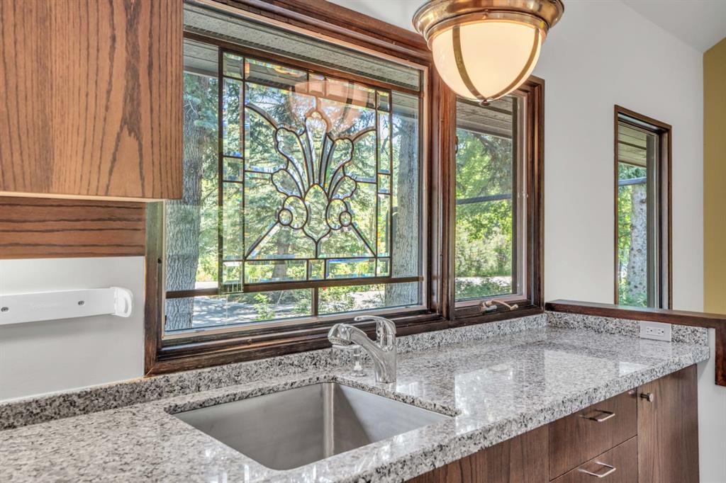 SUNLIT updated kitchen features premium appliances, granite counters, a spacious dining area with full-height windows, and a generous butler’s