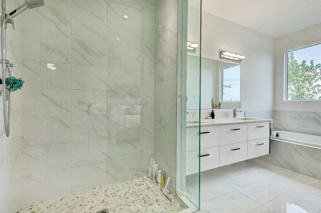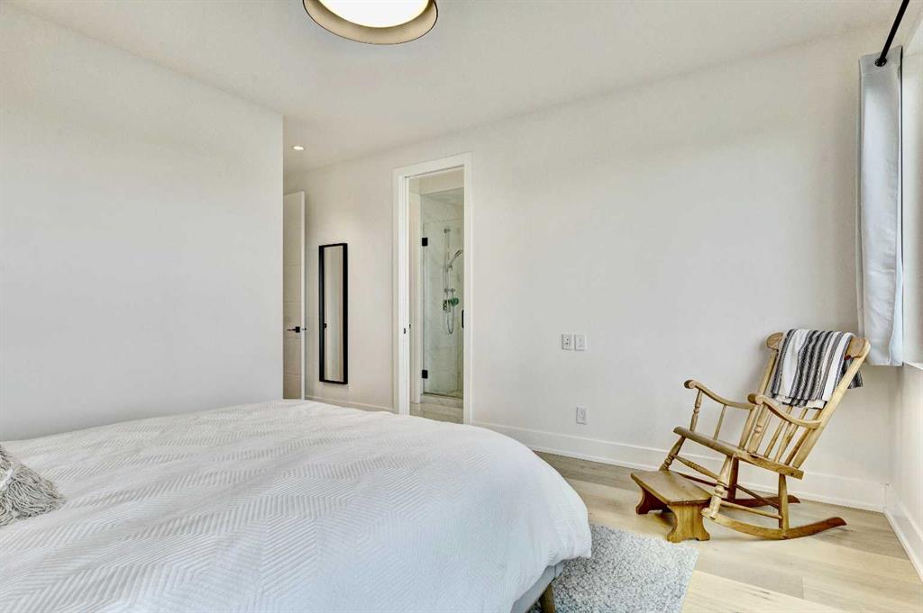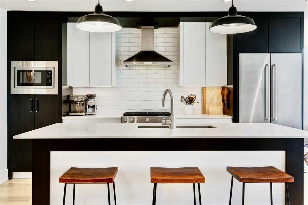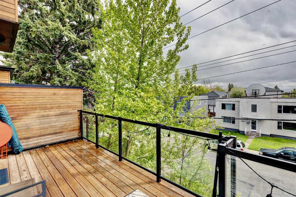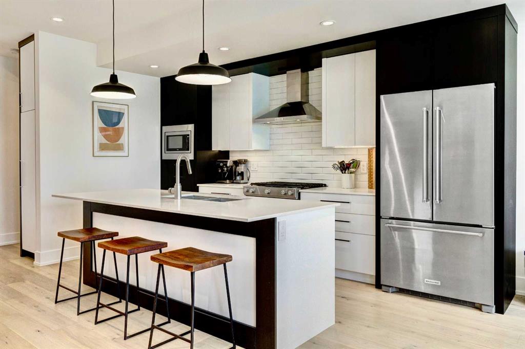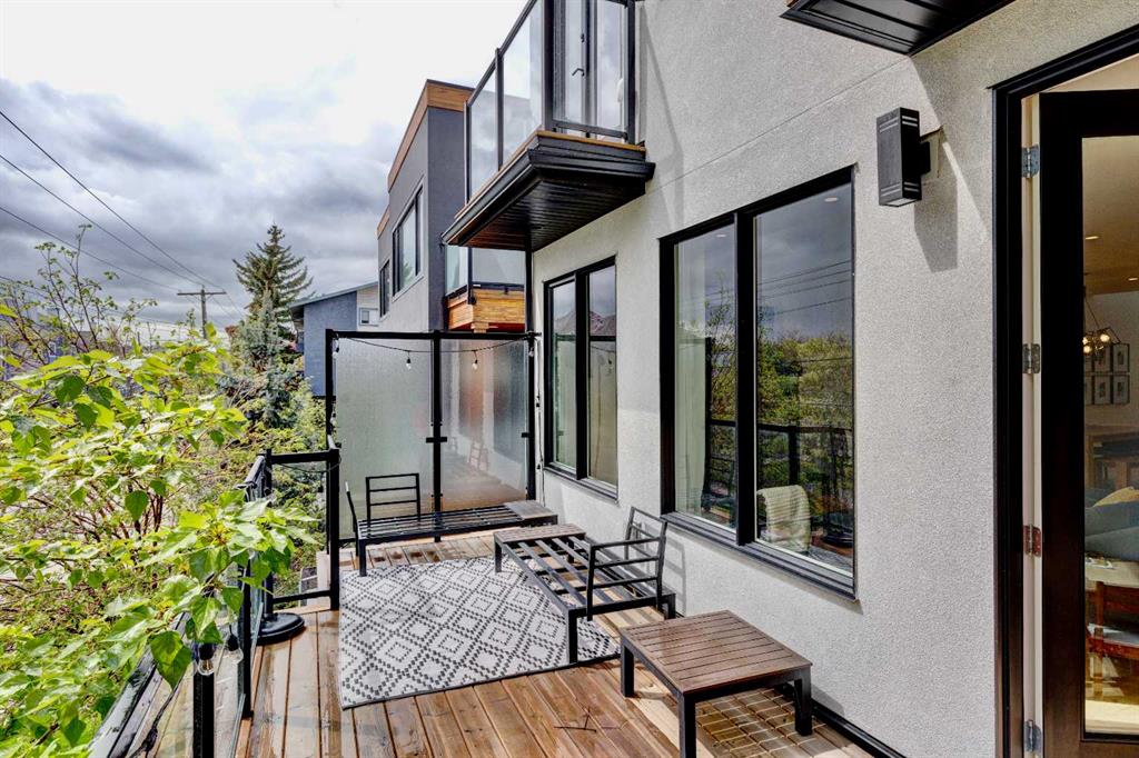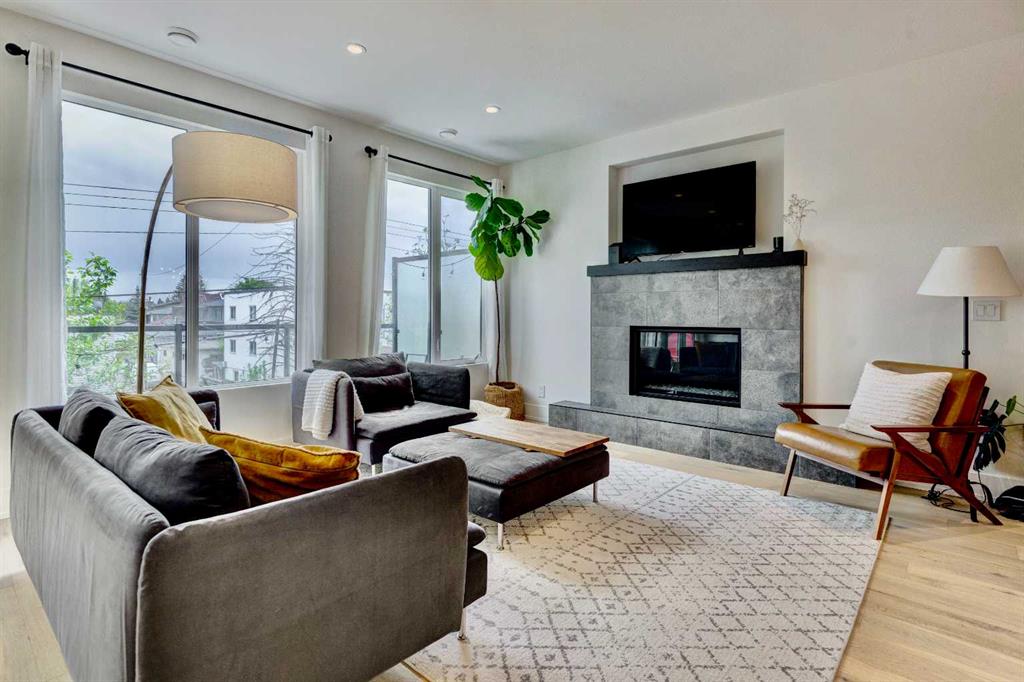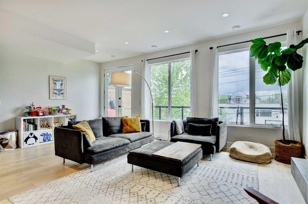 Located in the heart of Marda Loop, this oversized townhome offers 2,242 sq ft of thoughtfully designed living space, with room sizes and a layout rarely found in the area and comparable to many duplex and infill homes. Enjoy a walkable inner-city lifestyle close to shops, restaurants, parks, top schools, and Sandy Beach Dog Park, with an easy commute downtown. The open-concept main floor features a well-appointed kitchen with quartz countertops, a gas range, Bosch dishwasher, dark walnut cabinetry, and engineered white oak hardwood floors. A dedicated dining area flows into an impressive living room with large south-facing windows & a fireplace, creating a bright, welcoming space for everyday living and entertaining. An oversized deck extends the living space outdoors. A main-floor bedroom with a private deck offers excellent flexibility and can also be used as a home office, gym or guest room. Upstairs, the spacious primary suite features a private balcony, a walk-in closet with skylight and built-ins, and a well-finished ensuite with heated floors, double sinks, a soaker tub, and an oversized shower. Two additional bedrooms, a full bath, and a convenient upper laundry complete the upper level. The entry level provides ample storage and low-maintenance inner-city living in one of Calgary’s most desirable neighbourhoods.