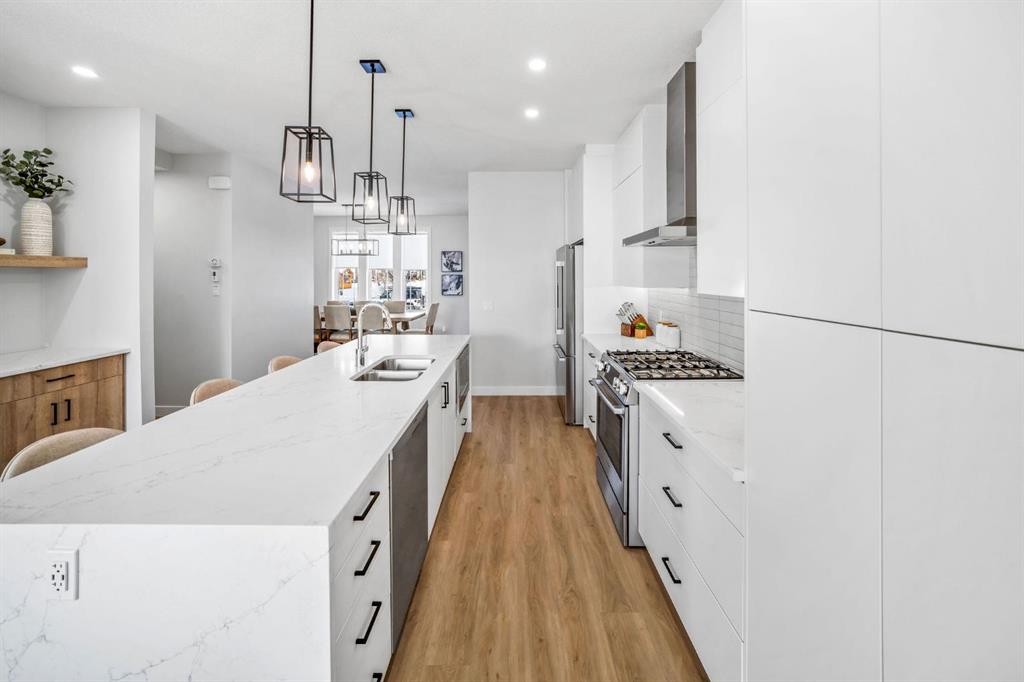Welcome to this luxury townhome in the heart of Harmony, where refined design meets effortless, resort style living. Thoughtfully curated with high-quality finishings throughout, this home offers an elevated everyday experience. The open-concept main level is anchored by a stunning kitchen featuring waterfall countertops, Bosch appliances, full-height cabinetry, generous pantry space and a beautifully integrated built-in bar with wine rack and coffee station, perfect for entertaining or quiet mornings. A gas fireplace adds warmth and sophistication to the living space, while motorized shades provide comfort and privacy at the touch of a button. Step outside to your south facing, low-maintenance backyard, complete with a gas line on a concrete pad, ideal for outdoor cooking. The oversized double garage offers added privacy and ample storage. Upstairs, the primary suite is a true retreat with a large bedroom, walk-in closet with custom built-ins and a spa-inspired ensuite featuring a bench in the shower and a gorgeous standalone soaker tub. Upstairs laundry is thoughtfully designed with countertops and shelving for everyday convenience. The mudroom with built-in cubbies keeps life organized and clutter-free. Perfectly positioned across from open fields, a toboggan hill, playground and picnic area, this home enjoys unobstructed park views and a strong sense of connection to nature. Located in the vibrant lake community of Harmony, residents enjoy access to pathways, parks, recreational amenities and the renowned Mickelson National Golf Club. Just a short drive to Canmore and the Rocky Mountains, with easy access to downtown Calgary, Harmony offers the ideal balance of outdoor adventure and urban convenience. A rare opportunity to own a luxury townhome in one of Calgary’s most sought-after communities where lifestyle, location and design align perfectly.