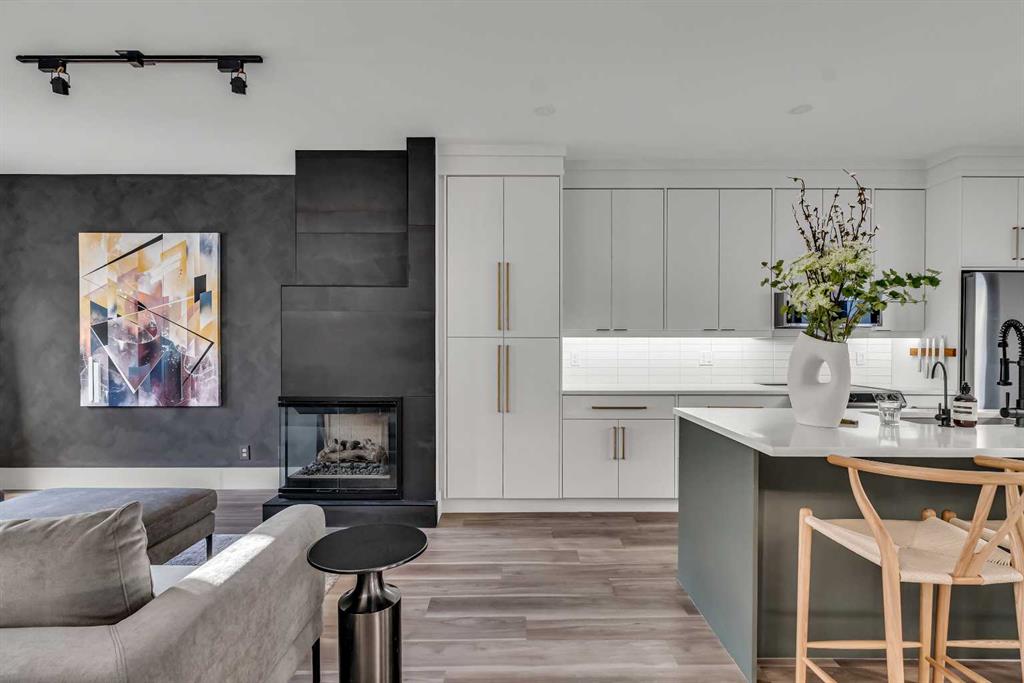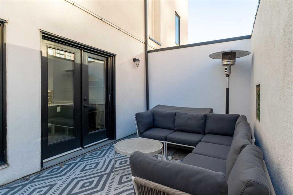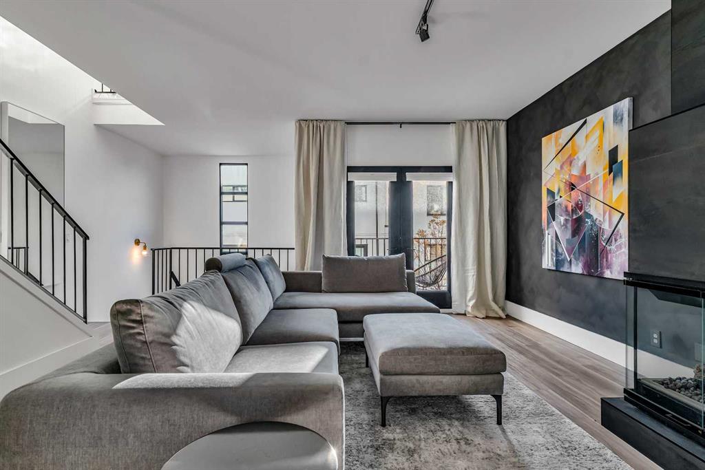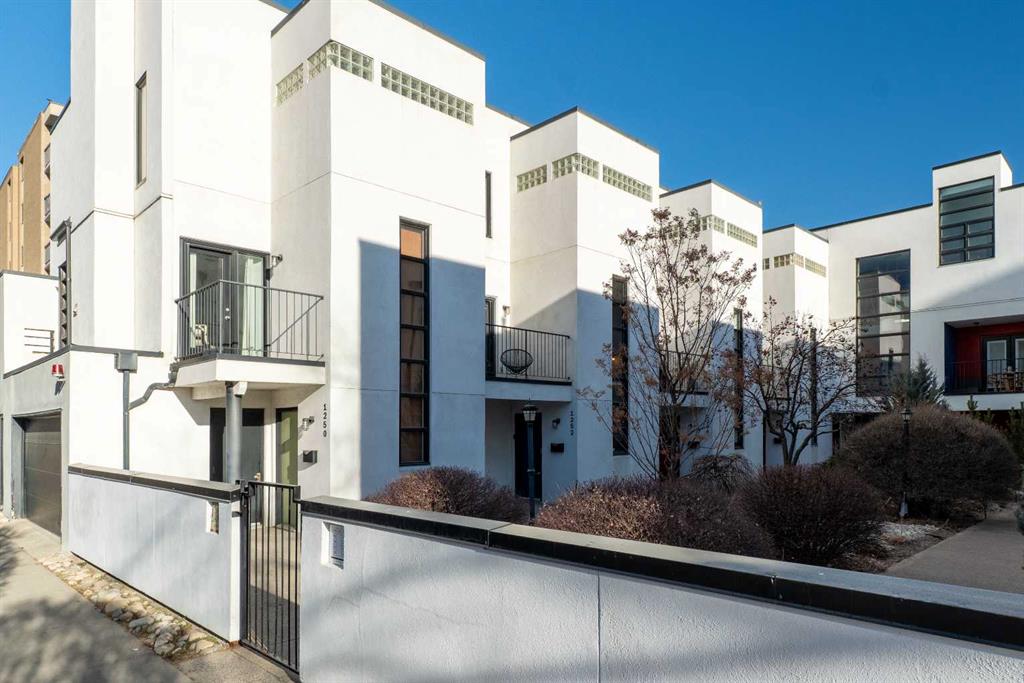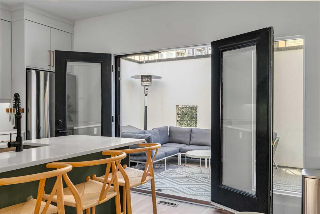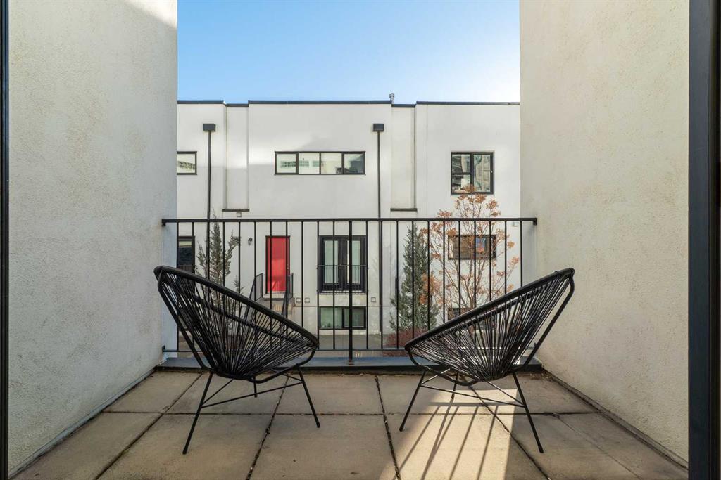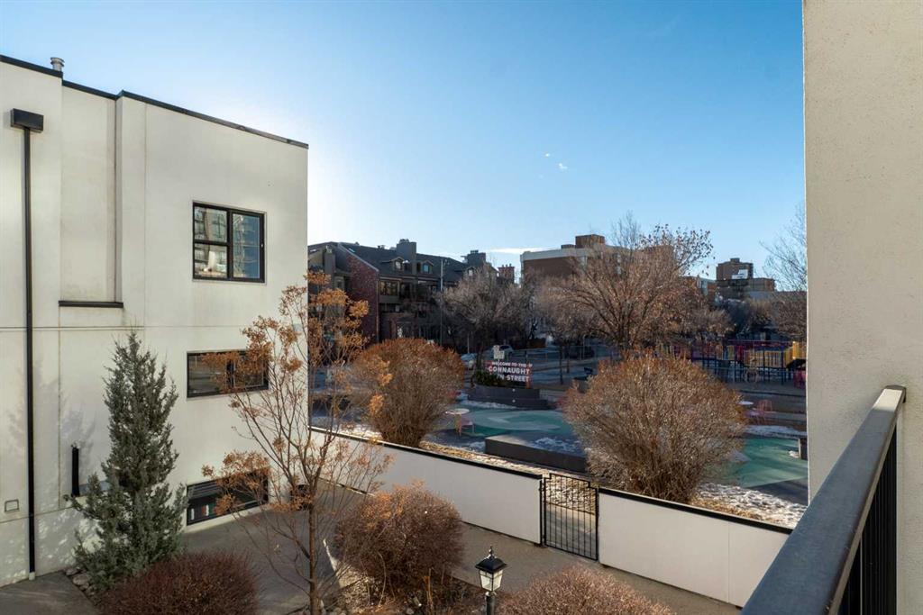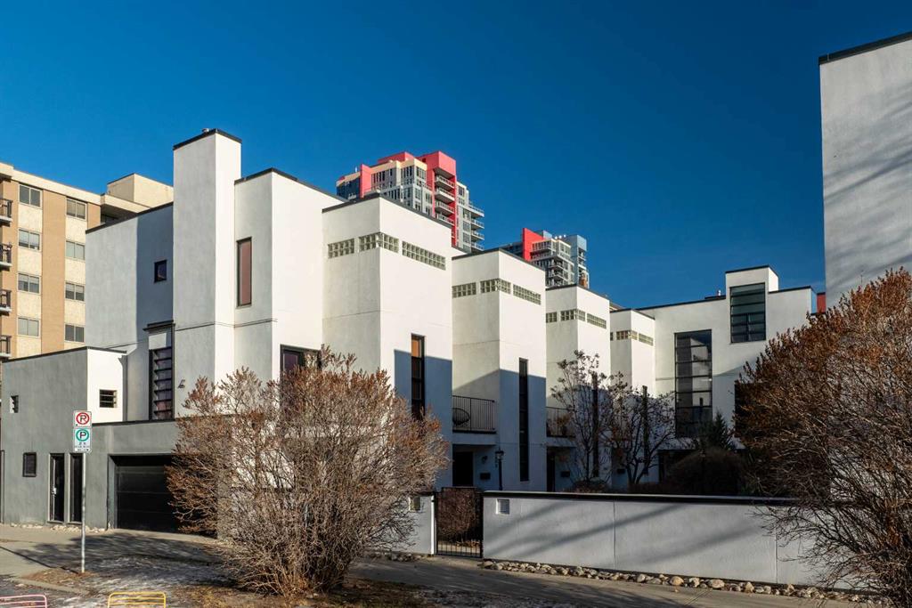 Architecturally distinct and thoughtfully renovated, this STURGESS ARCHITECTURE townhome offers refined urban living in the heart of Betline with SUNNY SOUTH EXPOSURE overlooking a quiet landscaped courtyard. Entry-level access provides a practical foyer with DIRECT GARAGE CONNECTION, creating everyday convenience while maintaining privacy from the street. The main living level is designed around an OPEN-CONCEPT FLOOR PLAN with 9’ CEILINGS and abundant natural light anchored by a dramatic two-storey window wall. The renovated kitchen blends form and function with QUARTZ COUNTERTOPS, A STATEMENT ISLAND WITH CRUSHED GRANITE SINK, FULL-HEIGHT CABINETRY, STAINLESS STEEL APPLIANCES, and A PANTRY WITH PULL-OUT STORAGE, supporting both daily living and entertaining. French doors extend the space outdoors to an OVERSIZED 177 SQ. FT. PRIVATE PATIO, ideal for relaxed evenings and summer gatherings. The main living area is centered around a TWO-SIDED GAS FIREPLACE that provides warmth and architectural interest without disrupting flow, while additional French doors open to a SECOND BALCONY overlooking the courtyard. A tucked-away powder room with stylish wallpaper completes this level. The upper floor is arranged for comfort and flexibility. The primary bedroom easily accommodates a king-sized layout and features a LARGE WALK-IN CLOSET with CHEATER ENSUITE ACCESS to the main bathroom. The 4-piece bathroom includes a STAND-UP SHOWER and A SUNNY SKYLIGHT that fills the space with natural light. The second bedroom enjoys SOUTH-FACING COURTYARD VIEWS, while an OPEN FLEX SPACE with GLASS BLOCK DETAILS creates an ideal office nook or reading area. Laundry is also conveniently located on this level. WIDE-PLANK LAMINATE AND TILE FLOORING flow throughout with NO CARPET, complemented by FLAT-PAINTED CEILINGS for a clean, modern finish. Notable upgrades include CENTRAL AIR CONDITIONING, A HIGH-EFFICIENCY FURNACE, and A NEWER HOT WATER TANK, offering long-term comfort and efficiency. Outdoor living is enhanced by TWO PRIVATE OUTDOOR SPACES. Parking is thoughtfully arranged with TWO COVERED STALLS, comprised of A PRIVATE INSULATED ATTACHED GARAGE AND A COVERED CARPORT (tandem). Located on a quiet street yet surrounded by everyday amenities, this home offers exceptional walkability with CONNAUGHT SCHOOL AND PLAYGROUND ACROSS THE STREET, easy access to parks, bike lanes, and green space, and close proximity to grocery stores, downtown, the tennis club and the shops and dining along 17TH AVENUE, delivering a highly livable and design-forward inner-city lifestyle. An exceptional setting with rare long-term upside. The adjacent street is slated for permanent transformation into a landscaped green space through an innovative public-realm project by SPECTACLE Bureau and The Tula Project, bringing ENHANCED GREENERY, REDUCED TRAFFIC, AND A CALMER STREETSCAPE that elevates both daily living and future appeal.