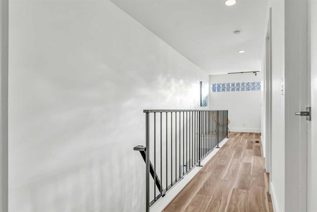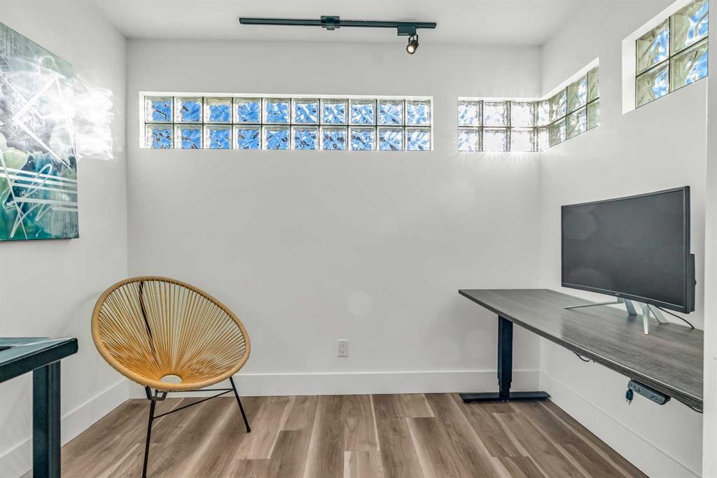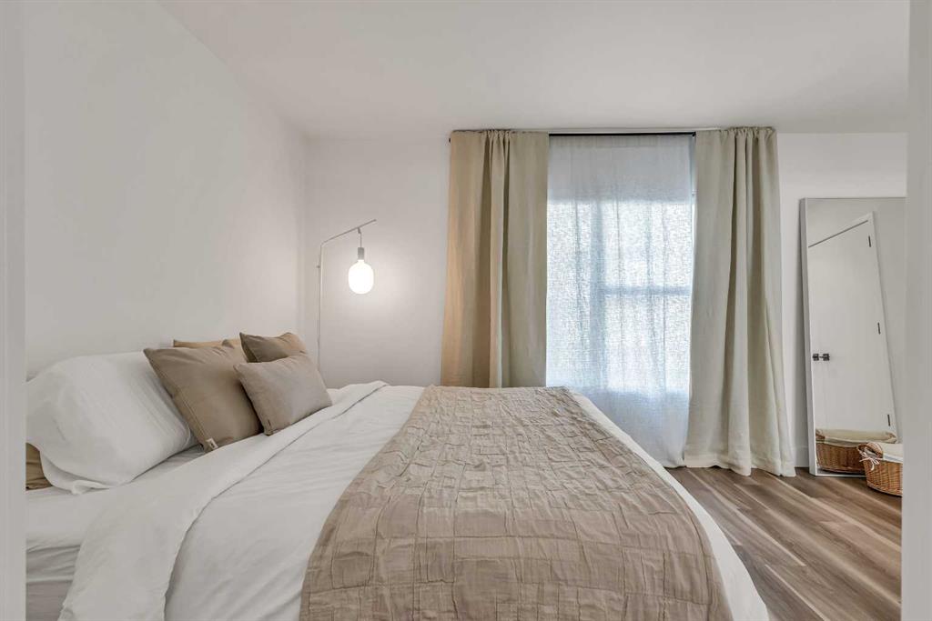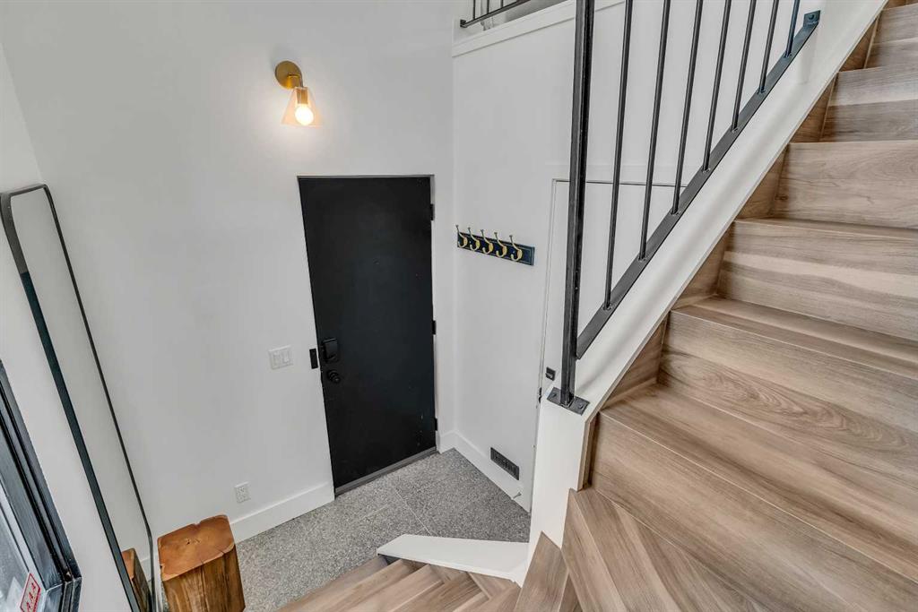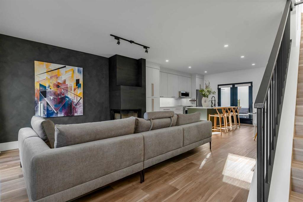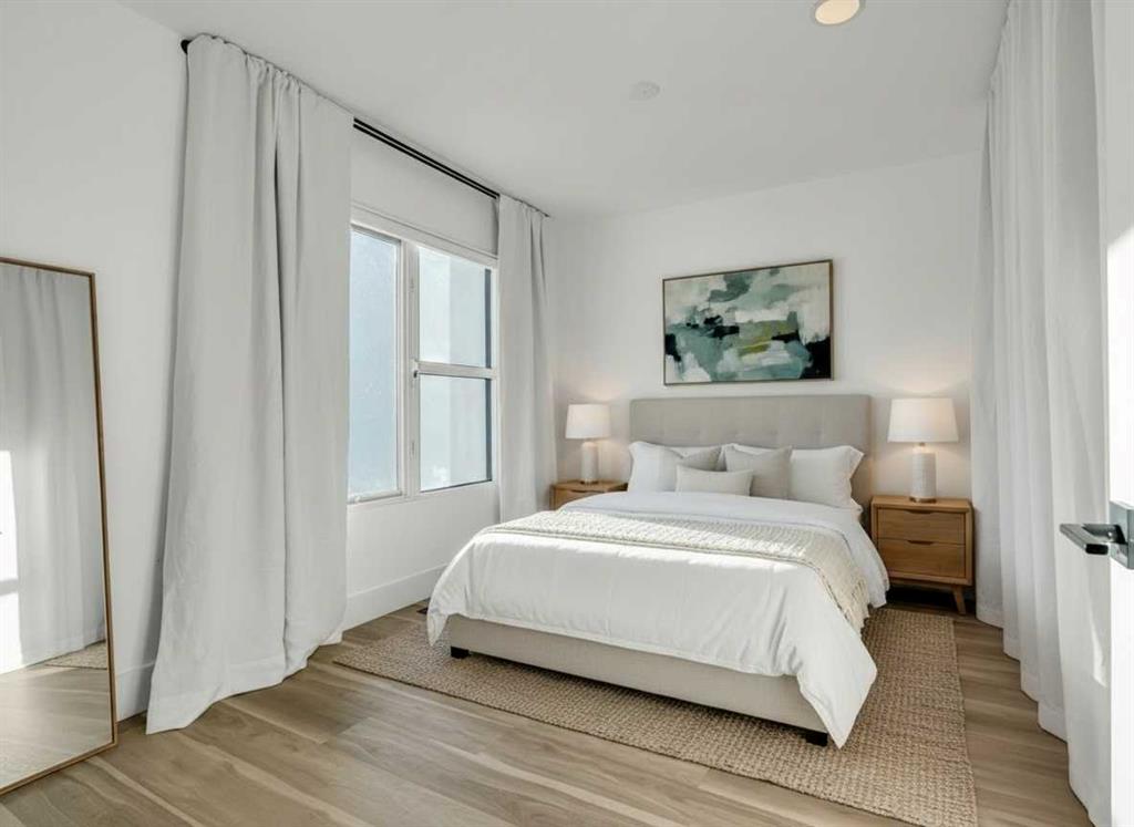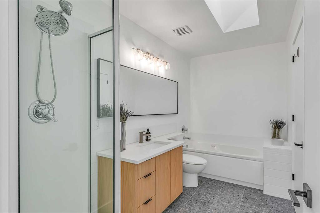 Architecturally distinct and thoughtfully renovated, this STURGESS ARCHITECTURE townhome offers refined urban living in the heart of Betline with SUNNY SOUTH EXPOSURE overlooking a quiet landscaped courtyard. Entry-level access provides a practical foyer with DIRECT GARAGE CONNECTION, creating everyday convenience while maintaining privacy from the street. The main living level is designed around an OPEN-CONCEPT FLOOR PLAN with 9’ CEILINGS and abundant natural light anchored by a dramatic two-storey window wall. The renovated kitchen blends form and function with QUARTZ COUNTERTOPS, A STATEMENT ISLAND WITH CRUSHED GRANITE SINK, FULL-HEIGHT CABINETRY, STAINLESS STEEL APPLIANCES, and A PANTRY WITH PULL-OUT STORAGE, supporting both daily living and entertaining. French doors extend the space outdoors to an OVERSIZED 177 SQ. FT. PRIVATE PATIO, ideal for relaxed evenings and summer gatherings. The main living area is centered around a TWO-SIDED GAS FIREPLACE that provides warmth and architectural interest without disrupting flow, while additional French doors open to a SECOND BALCONY overlooking the courtyard. A tucked-away powder room with stylish wallpaper completes this level. The upper floor is arranged for comfort and flexibility. The primary bedroom easily accommodates a king-sized layout and features a LARGE WALK-IN CLOSET with CHEATER ENSUITE ACCESS to the main bathroom. The 4-piece bathroom includes a STAND-UP SHOWER and A SUNNY SKYLIGHT that fills the space with natural light. The second bedroom enjoys SOUTH-FACING COURTYARD VIEWS, while an OPEN FLEX SPACE with GLASS BLOCK DETAILS creates an ideal office nook or reading area. Laundry is also conveniently located on this level. WIDE-PLANK LAMINATE AND TILE FLOORING flow throughout with NO CARPET, complemented by FLAT-PAINTED CEILINGS for a clean, modern finish. Notable upgrades include CENTRAL AIR CONDITIONING, A HIGH-EFFICIENCY FURNACE, and A NEWER HOT WATER TANK, offering long-term comfort and efficiency. Outdoor living is enhanced by TWO PRIVATE OUTDOOR SPACES. Parking is thoughtfully arranged with TWO COVERED STALLS, comprised of A PRIVATE INSULATED ATTACHED GARAGE AND A COVERED CARPORT (tandem). Located on a quiet street yet surrounded by everyday amenities, this home offers exceptional walkability with CONNAUGHT SCHOOL AND PLAYGROUND ACROSS THE STREET, easy access to parks, bike lanes, and green space, and close proximity to grocery stores, downtown, the tennis club and the shops and dining along 17TH AVENUE, delivering a highly livable and design-forward inner-city lifestyle. An exceptional setting with rare long-term upside. The adjacent street is slated for permanent transformation into a landscaped green space through an innovative public-realm project by SPECTACLE Bureau and The Tula Project, bringing ENHANCED GREENERY, REDUCED TRAFFIC, AND A CALMER STREETSCAPE that elevates both daily living and future appeal.