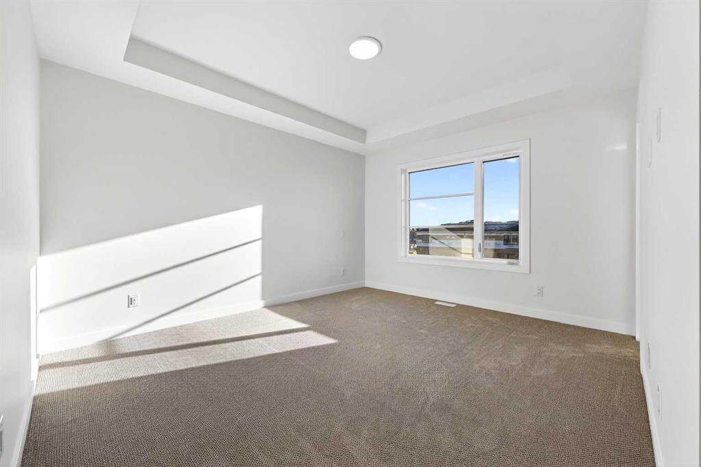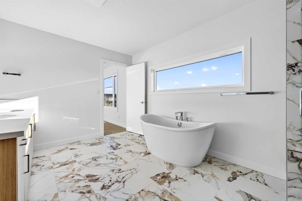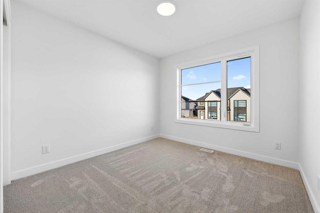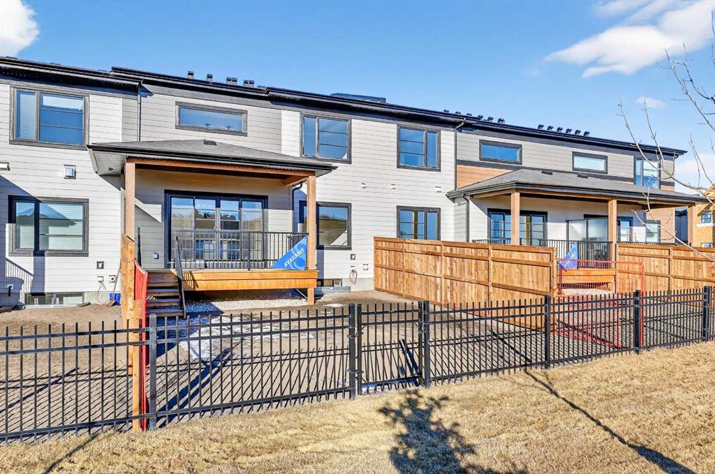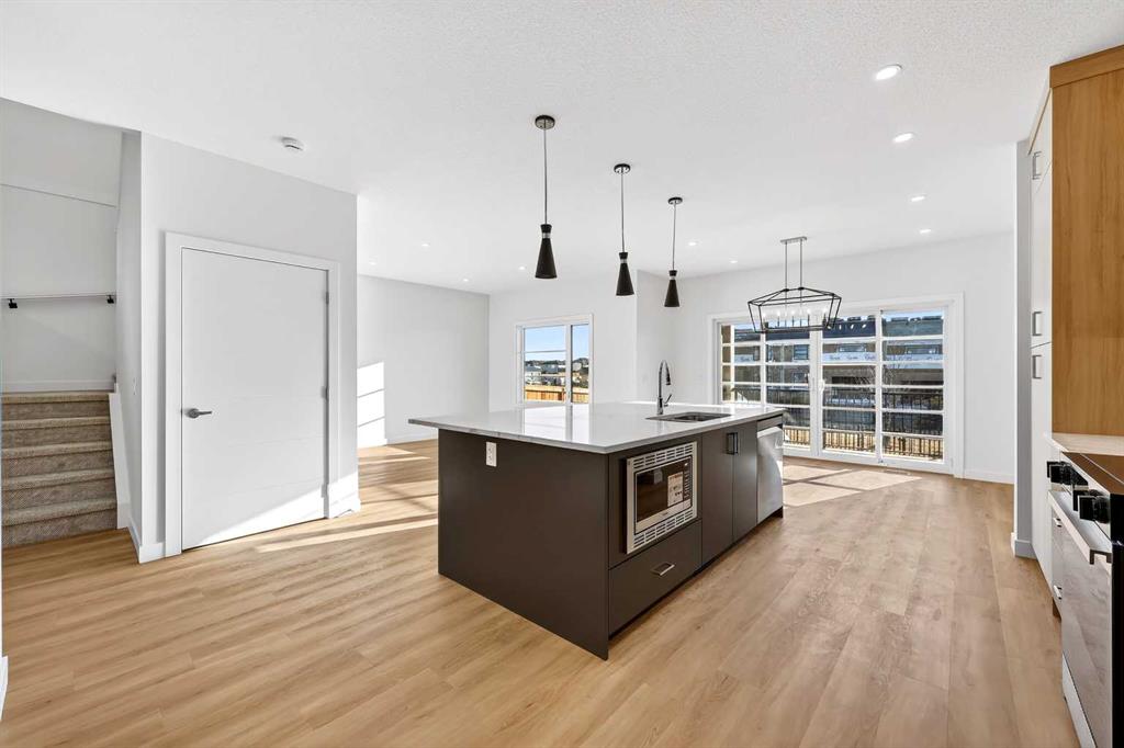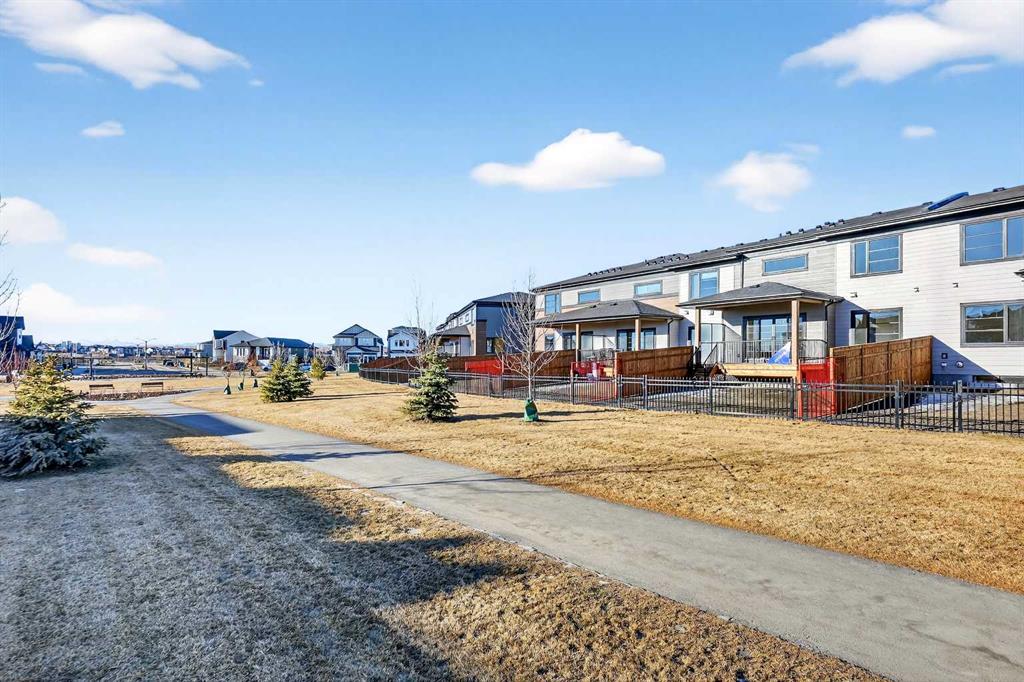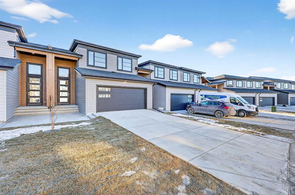 Experience the height of sophisticated living in this highly coveted luxury townhome, where a generous floor plan meets modern comfort and refined finishes. Proudly presented by StreetSide – this thoughtfully designed unit features 3 bedrooms, 2.5 bathrooms, and a front attached double car garage. The heart of the home is a spacious kitchen with a large central island, polished white quartz countertops, upgraded stainless steel appliances, and elegant sliding French patio doors that open to your covered deck area—ideal for both everyday living and entertaining. Light floods into the living room with ease through the large window, while luxury vinyl plank flooring flows throughout the main floor living areas, and carpeted stairs leading to the upper level and bedrooms provide extra warmth. The primary ensuite is a private sanctuary, complete with tile flooring, double sinks, a freestanding soaker tub, and an oversized tile-and-glass shower delivering spa-inspired comfort at home. The unfinished basement with roughed-in plumbing provides future potential for additional living space tailored to your needs. Professional landscaping and fencing complete your new home. Ideally located in the award-winning community of Harmony, residents enjoy Mickelson National Golf Course, private lake amenities, scenic walking and biking trails, and a wellness-focused lifestyle—just a shorty drive from Calgary city minutes and 45 minutes from the Rocky Mountains, where nature and convenience come together effortlessly