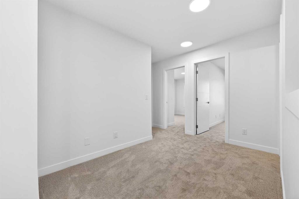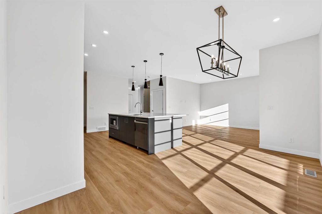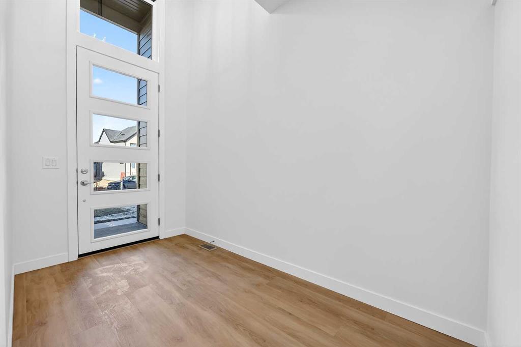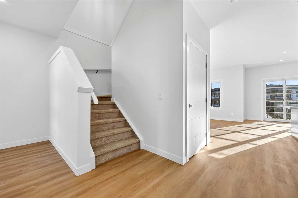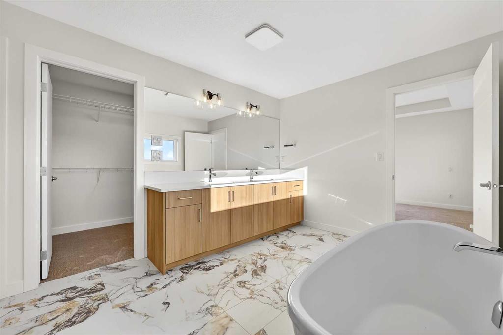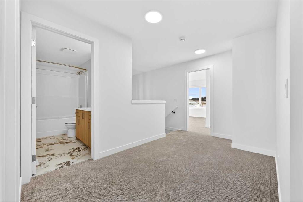 Experience the height of sophisticated living in this highly coveted luxury townhome, where a generous floor plan meets modern comfort and refined finishes. Proudly presented by StreetSide – this thoughtfully designed unit features 3 bedrooms, 2.5 bathrooms, and a front attached double car garage. The heart of the home is a spacious kitchen with a large central island, polished white quartz countertops, upgraded stainless steel appliances, and elegant sliding French patio doors that open to your covered deck area—ideal for both everyday living and entertaining. Light floods into the living room with ease through the large window, while luxury vinyl plank flooring flows throughout the main floor living areas, and carpeted stairs leading to the upper level and bedrooms provide extra warmth. The primary ensuite is a private sanctuary, complete with tile flooring, double sinks, a freestanding soaker tub, and an oversized tile-and-glass shower delivering spa-inspired comfort at home. The unfinished basement with roughed-in plumbing provides future potential for additional living space tailored to your needs. Professional landscaping and fencing complete your new home. Ideally located in the award-winning community of Harmony, residents enjoy Mickelson National Golf Course, private lake amenities, scenic walking and biking trails, and a wellness-focused lifestyle—just a shorty drive from Calgary city minutes and 45 minutes from the Rocky Mountains, where nature and convenience come together effortlessly