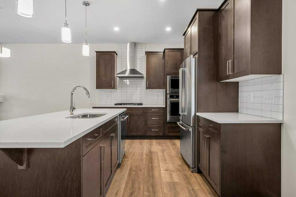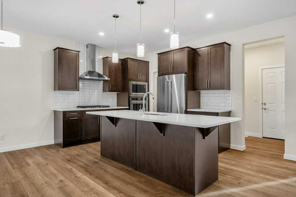 WestCreek Homes SOHO plan showcases a striking stone, vinyl, and Hardie board exterior and features a side entry offering a legal basement suite option. Ideally positioned on a northwest-facing backyard, the property backs directly onto a private community green spaces, complete with an outdoor sitting area, picnic tables, and a community garden. A rear fence and private deck further enhance this exceptional outdoor setting. Inside, the main floor is highlighted by 9’ knockdown ceilings and a thoughtfully designed open-concept layout. A front dual-door coat closet welcomes you into the home, while the double attached garage leads into a family-sized mudroom with a built-in bench and additional storage. Luxury vinyl plank flooring flows throughout the main level, drawing the eye toward the rear views. The chef-inspired kitchen is anchored by a large quartz island and features soft-close cabinetry, an undermount sink, extended-height cabinets, abundant prep space, a walk-in pantry, and premium KitchenAid appliances, including a French door refrigerator, gas cooktop, built-in wall oven, microwave, and a statement standalone hood fan. Adjacent to the kitchen, the central dining area opens into the rear lifestyle room, where a modern linear electric fireplace and a wall of windows frame tranquil green space views. Completing the main level are a convenient broom closet, a 2-piece bathroom, and a versatile flex room ideal for a home office, den, or guest bedroom. Upstairs, open railing and plush carpet lead to a well-designed upper level featuring a central bonus room and a functional laundry room with added upper cabinetry and linen shelving. At the front of the home are two spacious children’s bedrooms, each with swing-door closets, served by a uniquely designed 4-piece bathroom with a separate water closet, separate tub/shower with built-in towel storage, and an open quartz vanity. The rear of the upper level is dedicated to the impressive primary retreat, complete with a generous walk-in closet and a luxurious 5-piece ensuite featuring dual sinks, quartz vanity storage, a deep soaker tub, a standalone shower, and a private water closet. The undeveloped basement, accessed via the side entry, offers a wide-open layout ready to accommodate a future legal suite or additional living space for a growing family. This level is enhanced by 9’ ceilings, on-demand hot water, a high-efficiency furnace, HRV system, drip humidifier, and spray-foam insulated exterior joists. Offering outstanding value in both home and lot, this property delivers exceptional design, flexibility, and a premium community setting. With quick access to community pathways, local amenities and Blue Devil golf course this home is sure to please!