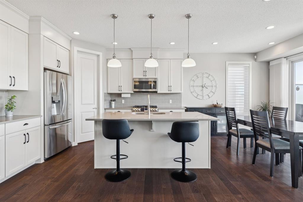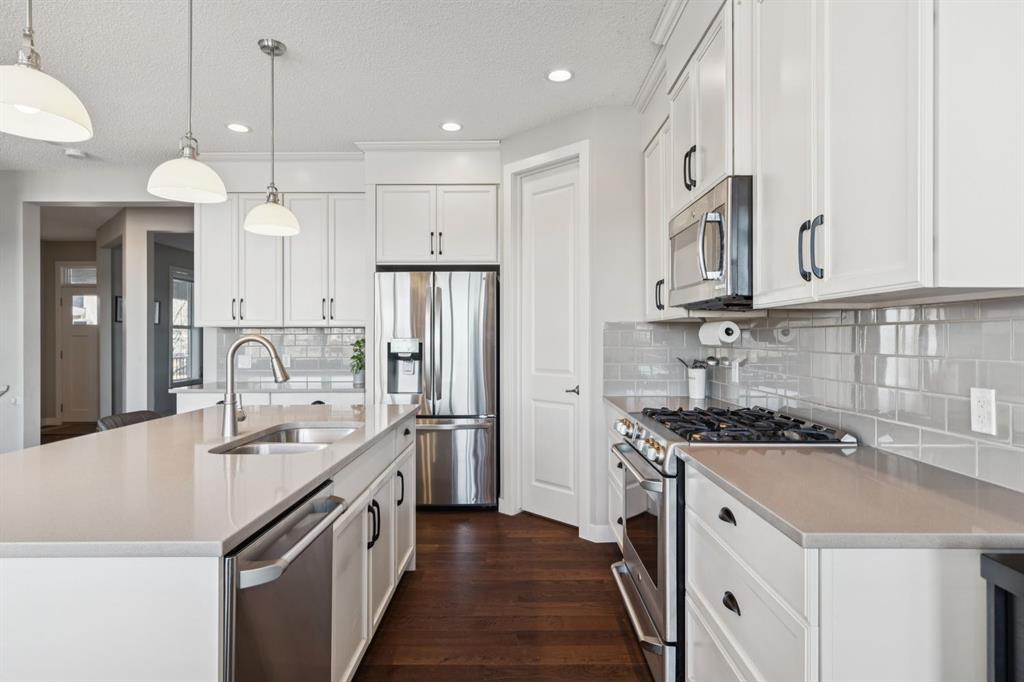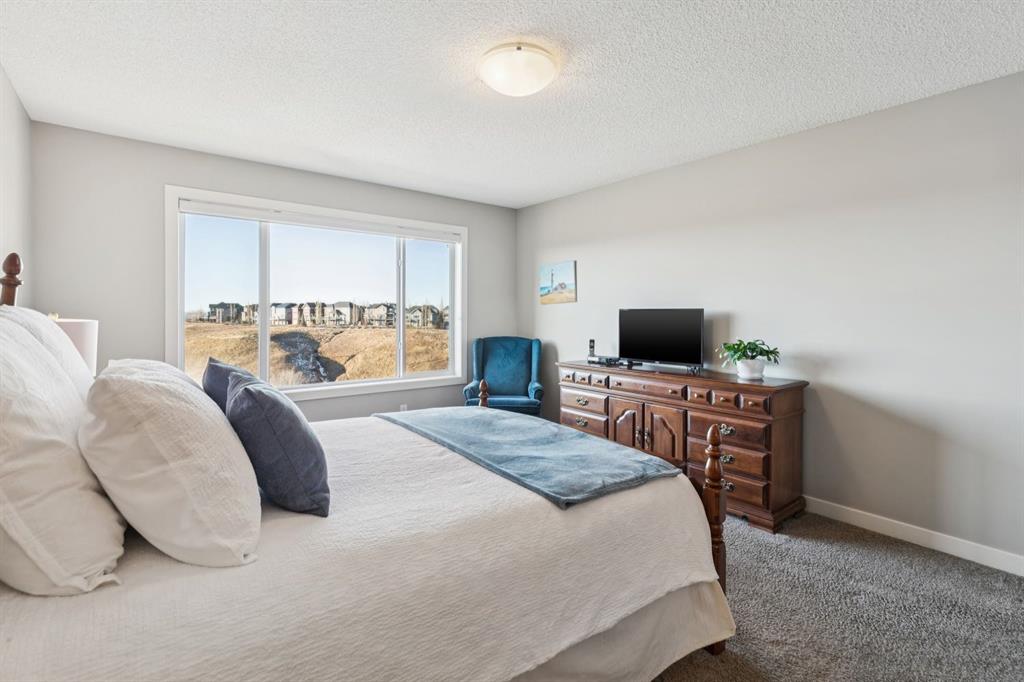 Cranston Ridge Living - Where Views, Nature, and Elegance Meet | Perched atop Cranston Ridge, this extraordinary estate home offers uninterrupted mountain vistas, breathtaking sunsets, and a lifestyle that blends luxury with nature. Set on a professionally landscaped, oversized lot, the backyard is a true private oasis, complete with lush flower gardens, a deck, and interlocking brick patio-perfect for family gatherings or summer entertaining. ~ Step inside to an incredible living room open to below, where soaring ceilings and massive two-story windows frame the panoramic views, letting natural light pour in and creating a dramatic, unforgettable focal point. The open-concept design seamlessly connects the living room, dining nook, kitchen, and home office, making daily living and entertaining effortless. ~ The kitchen is as functional as it is stunning, featuring full-height white cabinetry, a walkthrough pantry, and generous counter space. Rich millwork and elegant finishes flow throughout the home, reflecting the high standard of design and attention to detail. Upstairs, the primary suite is a serene retreat, with a spa-inspired ensuite complete with a skylight, making for a private space to unwind. Two additional second floor bedrooms provide comfort for family or guests. and the bonus room complete with built-in speakers will make entertaining a breeze! Downstairs, the fully finished basement adds two more spacious bedrooms and versatile living space. Further bonuses you won't want to miss? An enlarged double garage, full air-conditioning, underground irrigation, a built-in vacuum system, and more! Step outside and enjoy direct access to the Ridge pathways, taking you from your doorstep straight into nature in moments—perfect for walks, morning runs, or quiet reflection. ~ Cranston also offers excellent schools, convenient local shoppes, dining, and grocery, and with Seton as an adjacent urban district, you gain access to the YMCA, theatre, and South Health Campus hospital, blending suburban tranquility with modern urban amenities. ~ This home is more than just a residence-it's a statement of lifestyle, family, and success. From the meticulously designed interior to the serene backyard oasis and the dramatic, view-filled living room, every element celebrates both elegance anc connection to nature. Cranston Ridge living at its finest awaits!