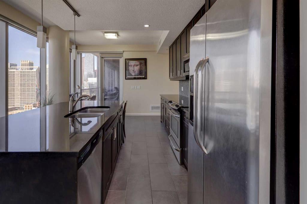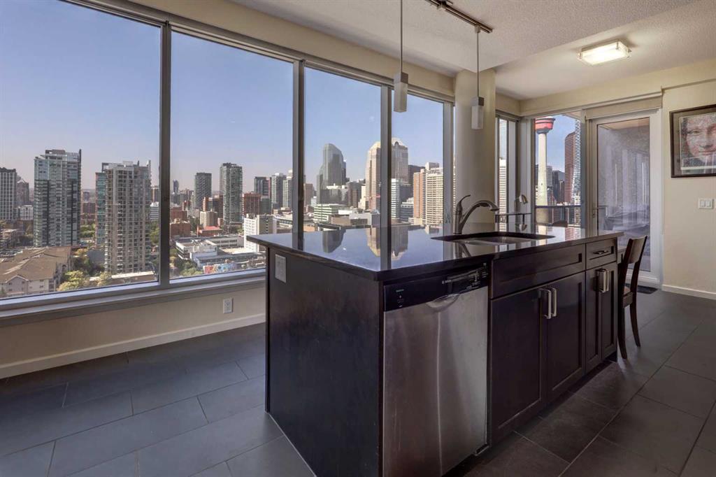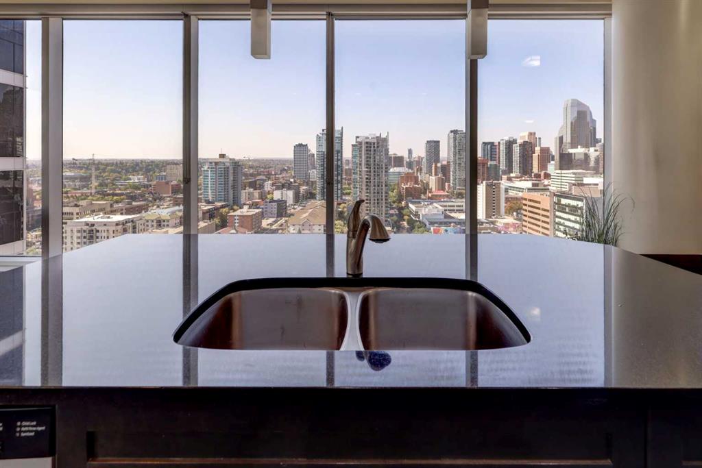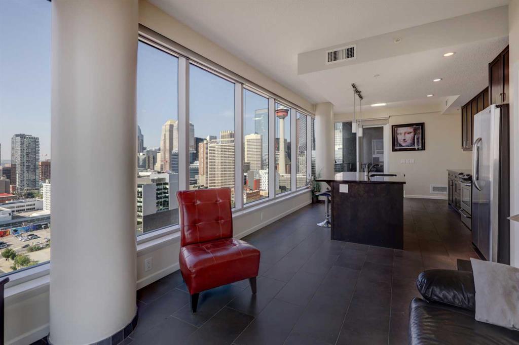 On the 18th floor, perched high above the city in the sought-after Nuera building, this upscale 2-bedroom, 2-bathroom adult-only residence offers unobstructed panoramic views of the downtown skyline and distant mountains—a stunning backdrop both day and night. Step inside and be captivated by the floor-to-ceiling windows that flood the space with natural light and frame the spectacular scenery from every angle day and night. The open-concept layout features a modern kitchen with granite countertops, upgraded cabinetry, perfect for entertaining or enjoying quiet evenings at home. The spacious primary bedroom also boasts floor to ceiling windows, a generous walk-in closet, and a stylish 4-piece ensuite. A second well-appointed bedroom and full bathroom offer flexibility for guests, a home office, or a roommate setup. Located just steps from Stampede Park and the new entertainment district, Nuera offers unmatched access to downtown amenities, dining, transit, and events. Building features include a large fitness centre, residents’ lounge, outdoor terrace, secure underground parking, and concierge service, all designed for comfort, convenience, and lifestyle. Don’t miss this incredible opportunity to own in one of Calgary’s premier high-rises. Call today to book your private showing!