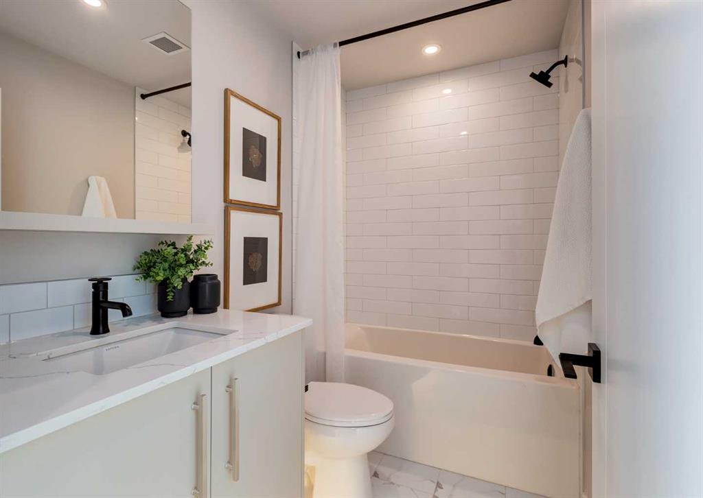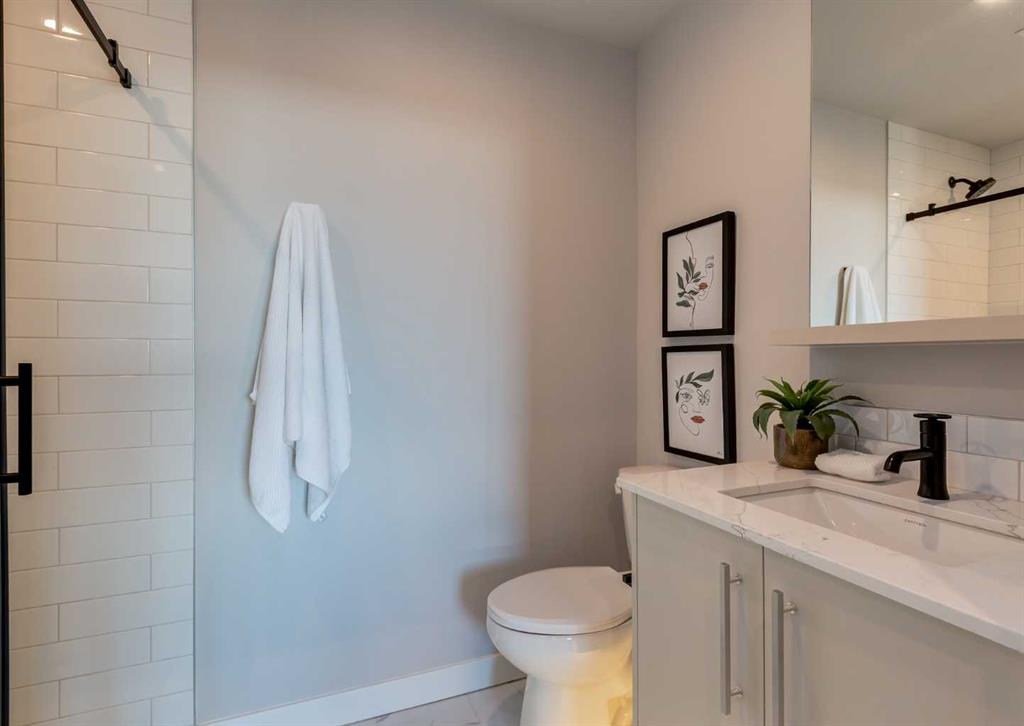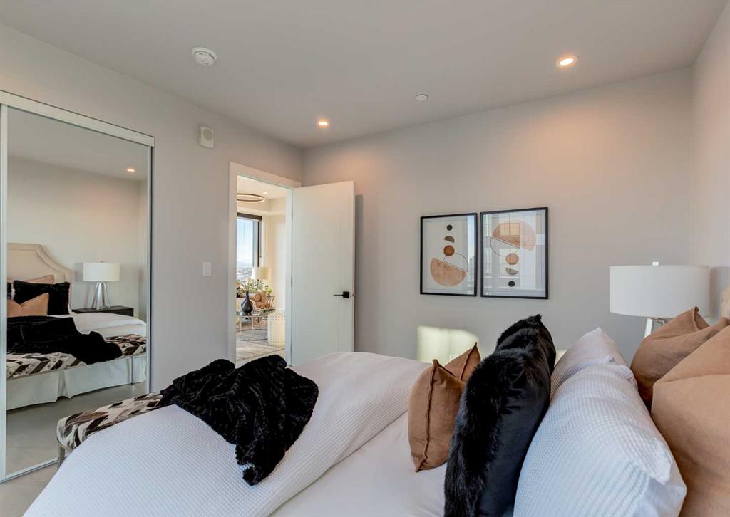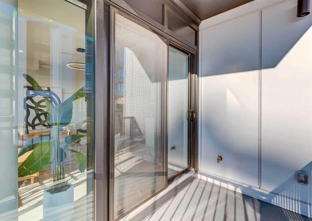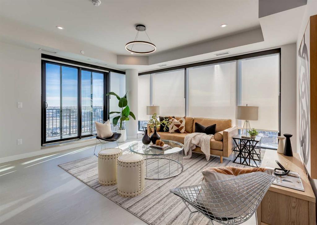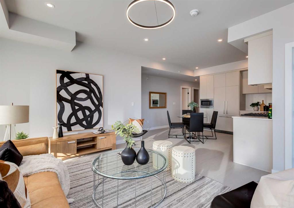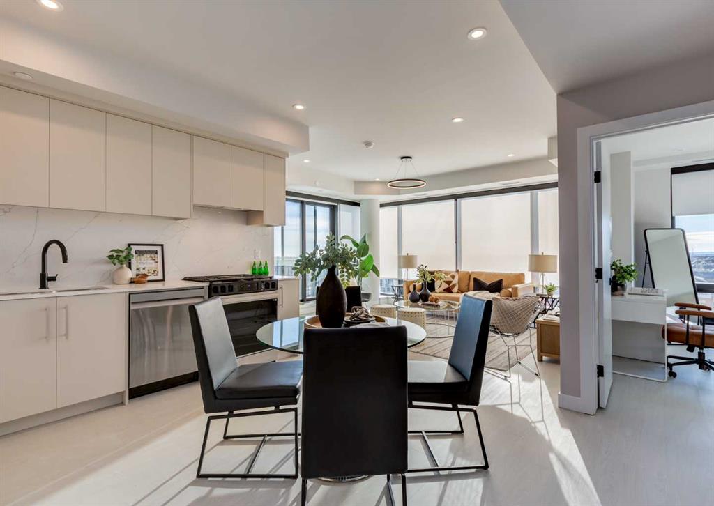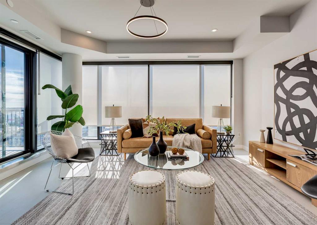 Welcome to this brand-new corner-unit condominium in the Plaza, located in the award-winning West District, where modern design meets an exceptional urban lifestyle. This bright and beautifully designed home features 9-foot ceilings and expansive windows that flood the space with natural light throughout the day. With the main living area and primary bedroom facing south, the home enjoys incredible sunshine, while the east-facing balcony and second bedroom overlook the stunning central patio below. The open-concept floor plan is ideal for both everyday living and entertaining. The contemporary kitchen is finished with quartz countertops, a gas range, and a built-in refrigerator, seamlessly blending style and functionality. The layout offers two spacious bedrooms and two well-appointed bathrooms, along with a large laundry room with excellent storage, a rare and highly desirable feature. Plaza offers exceptional building amenities, including a fully equipped fitness centre and an inviting owners’ lounge complete with arcade games and a pool table. Additional conveniences include a dedicated dog wash and a car wash. The home also includes heated underground parking, modern finishes throughout, and thoughtful design details that set this residence apart. Just steps from your door, enjoy boutique shopping, some of Calgary’s best dining and cafés, and the beautifully designed Central Park. The corner-unit position is truly the standout feature, offering exceptional light, privacy, and views making this a rare opportunity to own in one of Calgary’s most sought-after communities.