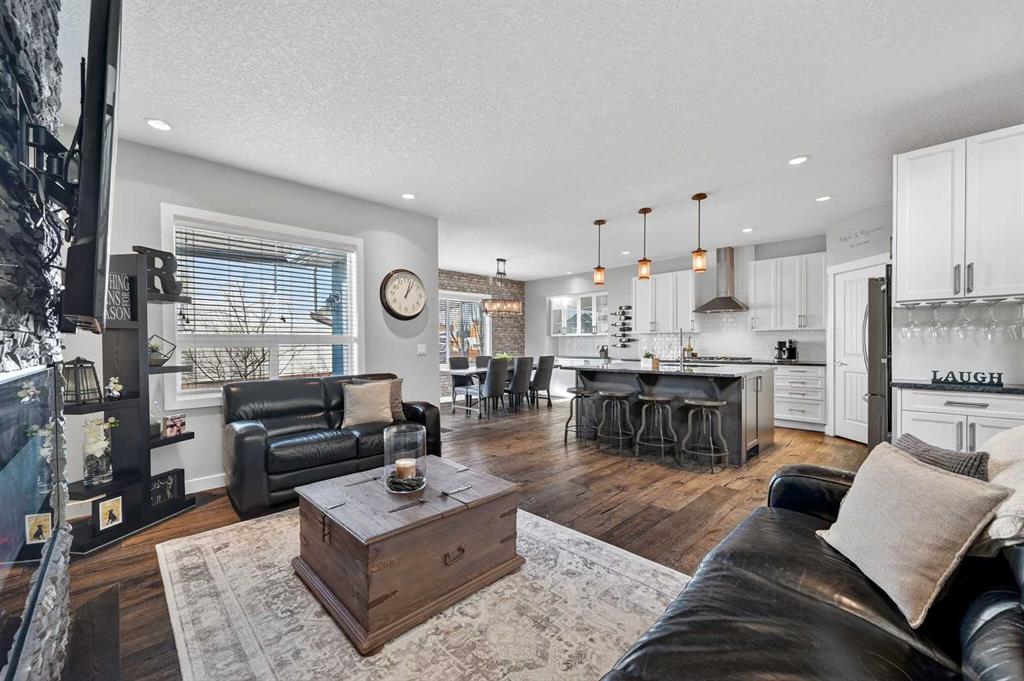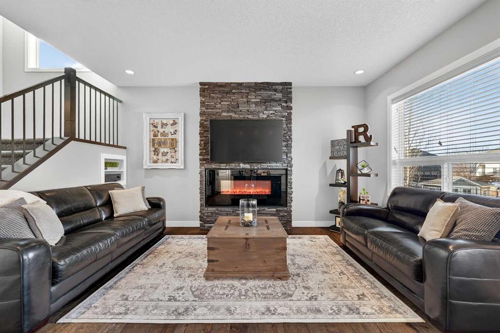 Welcome to this beautifully maintained 2-storey home in the heart of Cranston — a community known for its family-friendly atmosphere, scenic pathways, and quick access to schools, shopping, and the Bow River ridge. Situated on a desirable corner lot, this property offers both space and comfort, along with thoughtful upgrades throughout. Stepping inside, you’re greeted by a large, inviting entryway that opens into a bright main floor with engineered hardwood and 9-ft knockdown ceilings. The open-concept layout creates an easy flow between the dining area and the cozy living room, where a striking stone-faced electric fireplace becomes the natural gathering point. The kitchen is designed for those who love to cook and entertain — featuring stainless steel appliances including a chimney-style hood fan, built-in double ovens, and a gas cooktop. Granite counters, ample white cabinetry, a tile backsplash, a built-in hutch, and a spacious walk-in pantry provide both style and functionality. The oversized island with a silgranit sink, breakfast bar, pendant lighting, and extra storage ties it all together. From the dining area, a door leads to the large exposed-aggregate patio, perfect for summer evenings outdoors. The main level also includes a convenient laundry room with a sink, a 2-piece bathroom, and access to the double attached garage — complete with a built-in dog run and exterior door for easy outdoor access. Central air conditioning and built-in exterior LED lighting add comfort and curb appeal year-round. Upstairs, the primary bedroom offers a peaceful retreat with a generous walk-in closet and a 4-piece ensuite featuring ceramic tile flooring, granite counters, a large soaker tub, a walk-in shower, and a bright window. Three additional well-sized bedrooms, a full 4-piece bathroom, a linen closet, and a spacious bonus room with a vaulted ceiling complete the upper level — giving the whole family room to spread out. The basement is partly finished with framing and electrical already completed, making it easy to customize the space to your needs. It’s laid out for a future bedroom, full bathroom, large family or media room, and plenty of storage.
