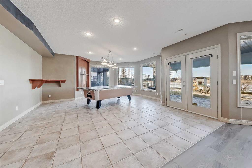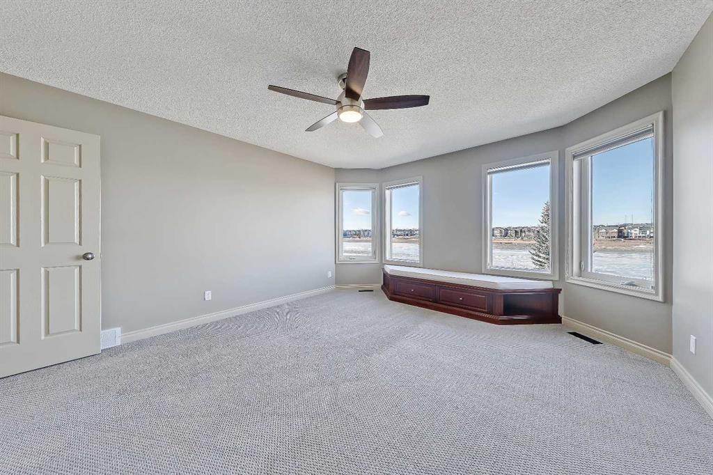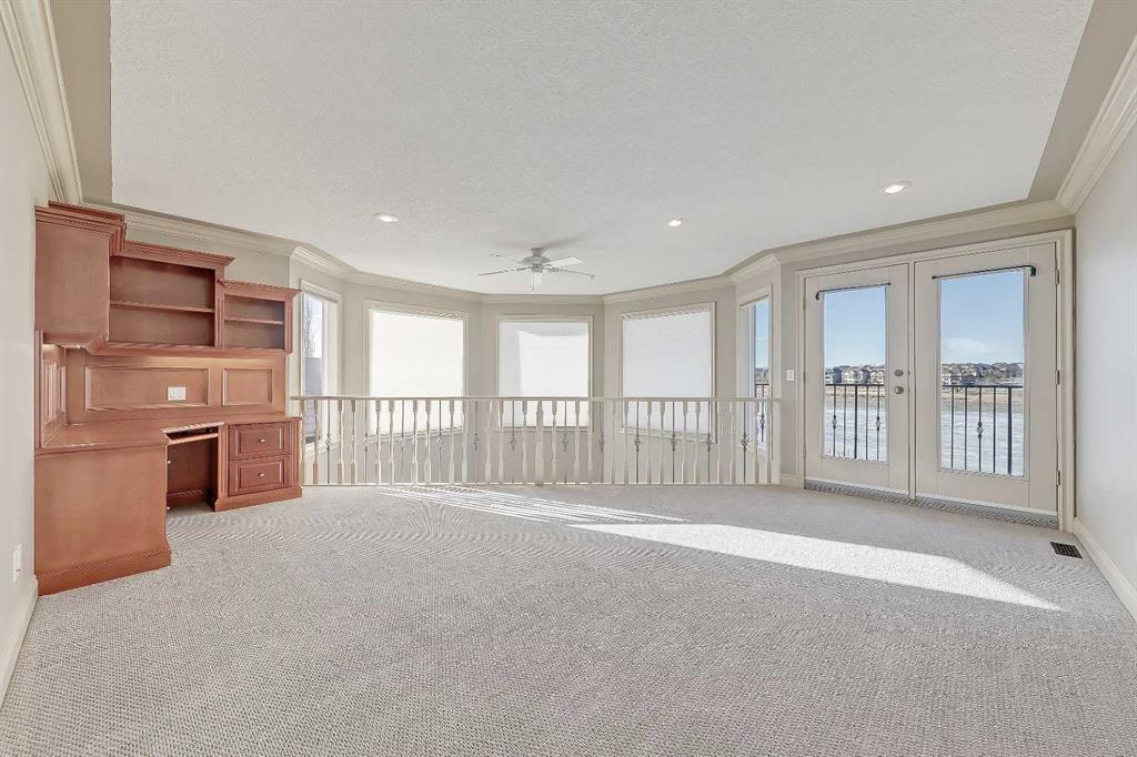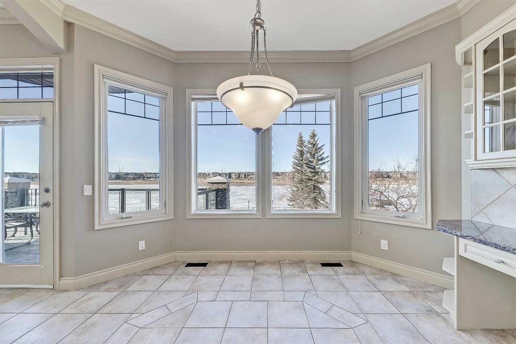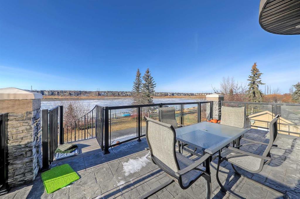 LAKEFRONT LIVING IN THE COVE, one of Chestermere’s most desirable communities! This fully finished, executive walk-out bungalow-style home sits on a massive 1/3+ acre lot backing directly onto Chestermere Lake! Offering over 4,900 sq. ft in total (with over 3,000 sq. ft. above grade), this property features a total of 5 bedrooms, 3.5 bathrooms, a fully developed walkout basement, an attached triple-car garage, and a private dock with a private boat lift. A bright, open-to-above foyer welcomes you into the main level, highlighted by 10-ft ceilings, crown moulding, built-in speakers, and expansive windows overlooking the lake. The oversized kitchen is designed for both cooking and entertaining, complete with stainless steel appliances, including a French door fridge, a wall oven and microwave, a 5-burner gas cooktop, an undercounter beverage fridge, a walk-in pantry, granite countertops, a triple-basin sink, a prep counter with a second sink, and a casual dining area overlooking the water. The adjacent 2-storey living room features a gas fireplace with a stone surround and double patio doors that open to a large stamped concrete deck with incredible lake views. The main-floor primary suite offers direct water views through multiple bay windows, a walk-in closet with built-ins, and a spa-inspired 5-piece ensuite with soaker tub, glass shower, and dual vanity sinks. A mudroom, powder room, laundry, and interior direct access to the heated, epoxy-finished triple garage complete this level. Upstairs, a spacious bonus room with a private balcony overlooks the lake, accompanied by two additional bedrooms with walk-in closets and a well-appointed main bath with dual sinks and separate tub/shower areas. The fully-developed walk-out basement features hydronic in-floor heating, a large recreation space with media built-ins, a wet bar, wine storage, two additional bedrooms, a full bath, and extensive storage. Outside, the enormous, sunny West-facing landscaped backyard enjoys incredible lake views, stamped concrete pathways and multiple patio areas, plus a private dock with a boat lift. and storage shed. Additional highlights include cement shingle roofing, soffit lighting, dual A/C units, and 200-amp service. Located near schools, shopping, parks, and recreation, this is a rare opportunity to own a true lakefront property in one of Chestermere’s most desirable communities.