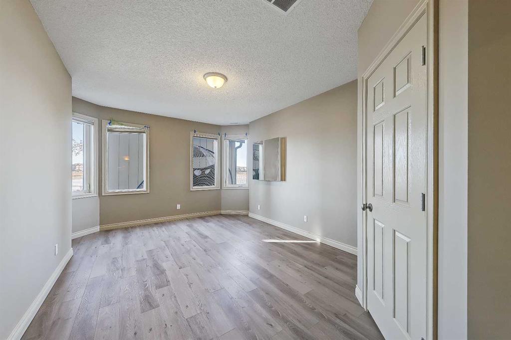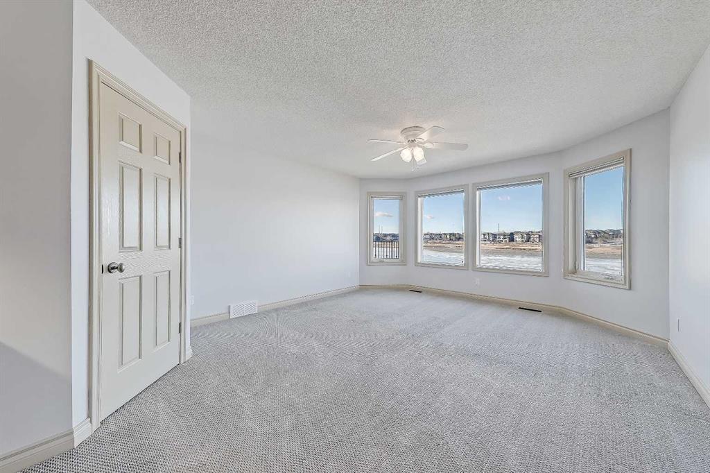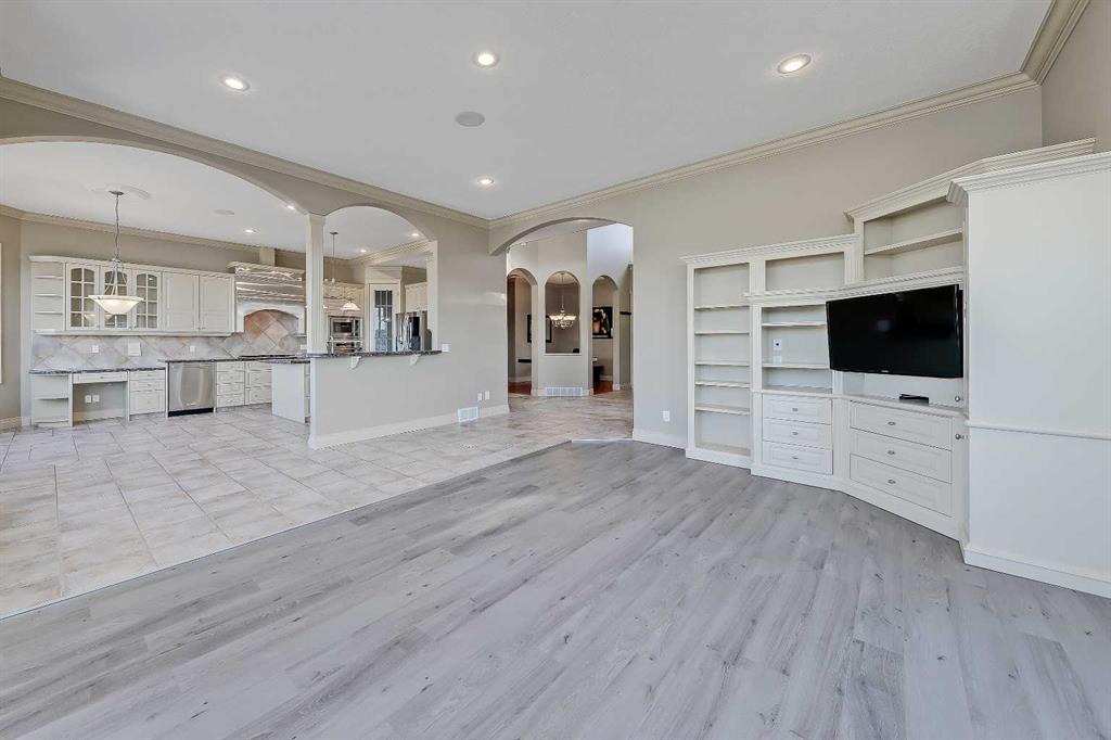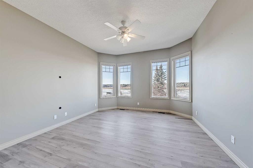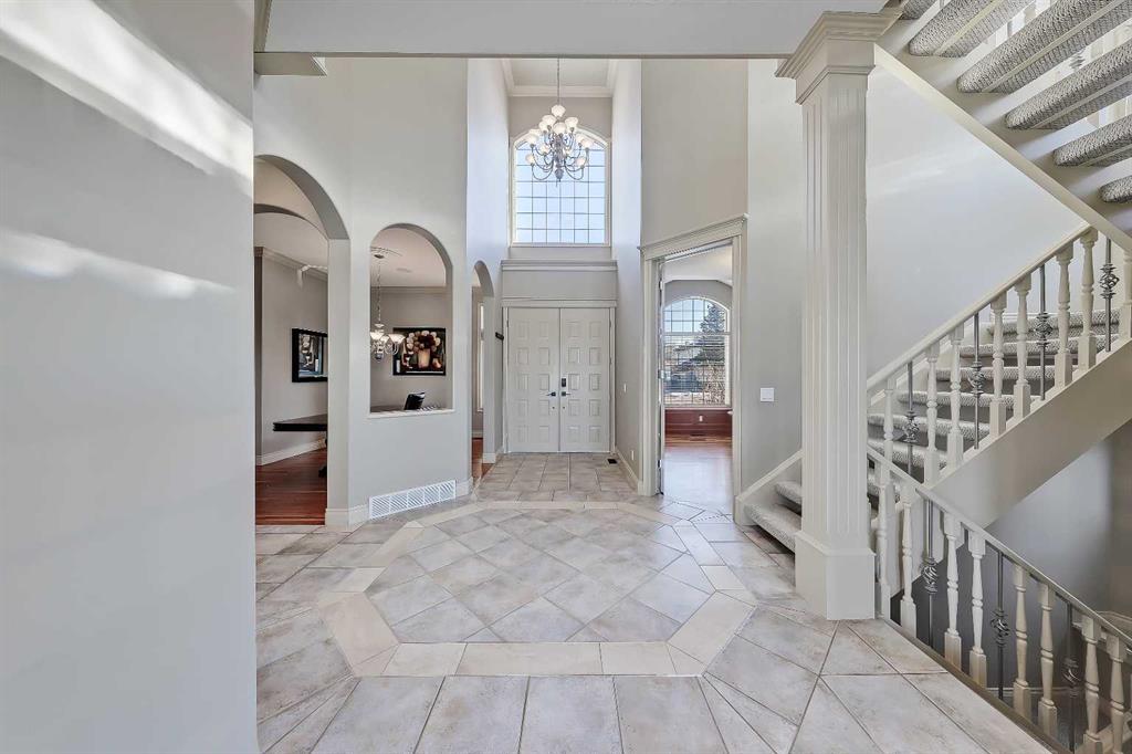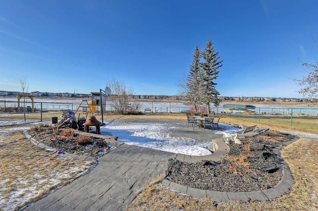 LAKEFRONT LIVING IN THE COVE, one of Chestermere’s most desirable communities! This fully finished, executive walk-out bungalow-style home sits on a massive 1/3+ acre lot backing directly onto Chestermere Lake! Offering over 4,900 sq. ft in total (with over 3,000 sq. ft. above grade), this property features a total of 5 bedrooms, 3.5 bathrooms, a fully developed walkout basement, an attached triple-car garage, and a private dock with a private boat lift. A bright, open-to-above foyer welcomes you into the main level, highlighted by 10-ft ceilings, crown moulding, built-in speakers, and expansive windows overlooking the lake. The oversized kitchen is designed for both cooking and entertaining, complete with stainless steel appliances, including a French door fridge, a wall oven and microwave, a 5-burner gas cooktop, an undercounter beverage fridge, a walk-in pantry, granite countertops, a triple-basin sink, a prep counter with a second sink, and a casual dining area overlooking the water. The adjacent 2-storey living room features a gas fireplace with a stone surround and double patio doors that open to a large stamped concrete deck with incredible lake views. The main-floor primary suite offers direct water views through multiple bay windows, a walk-in closet with built-ins, and a spa-inspired 5-piece ensuite with soaker tub, glass shower, and dual vanity sinks. A mudroom, powder room, laundry, and interior direct access to the heated, epoxy-finished triple garage complete this level. Upstairs, a spacious bonus room with a private balcony overlooks the lake, accompanied by two additional bedrooms with walk-in closets and a well-appointed main bath with dual sinks and separate tub/shower areas. The fully-developed walk-out basement features hydronic in-floor heating, a large recreation space with media built-ins, a wet bar, wine storage, two additional bedrooms, a full bath, and extensive storage. Outside, the enormous, sunny West-facing landscaped backyard enjoys incredible lake views, stamped concrete pathways and multiple patio areas, plus a private dock with a boat lift. and storage shed. Additional highlights include cement shingle roofing, soffit lighting, dual A/C units, and 200-amp service. Located near schools, shopping, parks, and recreation, this is a rare opportunity to own a true lakefront property in one of Chestermere’s most desirable communities.