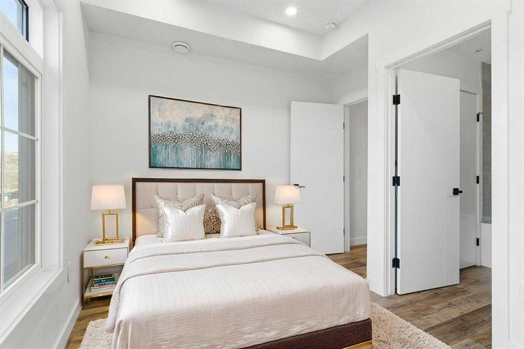 Upstairs, you’ll find two additional bedrooms along with a well-appointed primary bedroom complete with a cheater ensuite bathroom. A south-facing bedroom offers excellent flexibility as a home office or guest room and opens onto a private balcony overlooking the park. A dedicated laundry room with new washer and dryer provides added convenience, along with extra storage space.